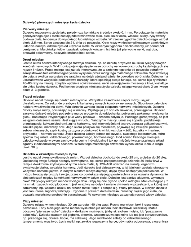 Dziewięć pierwszych miesięcy życia dziecka Pierwszy miesiąc Dziecko rozpoczyna życie jako pojedyncza komórka o średnicy około 0,1 mm. Po połączeniu materiału genetycznego ojca i matki zostają zdeterminowane m.in. płeć, kolor oczu, włosów, skóry, rysy twarzy, budowa ciała, tendencja do wysokiego lub niskiego wzrostu. W trzecim tygodniu dziecko osiąga wzrost około 2,5 mm. Serce zaczyna bić 21. dnia od poczęcia. Krew krąży w nieskomplikowanym zamkniętym układzie naczyń, oddzielnym od krążenia matki. W czwartym tygodniu dziecko mierzy już ponad pół centymetra. Ma główkę, tułów i zawiązki górnych kończyn. Istnieją już pierwotne nerki, wątroba, przewód pokarmowy, naczynia krwionośne i serce. Drugi miesiąc Jest to okres bardzo intensywnego rozwoju dziecka, np. co minutę przybywa mu kilka tysięcy nowych komórek nerwowych. W 41. dniu pojawiają się pierwsze odruchy nerwowe oraz ruchy kształtujących się rączek i nóżek. Praca mózgu jest już tak intensywna, że w szóstym tygodniu od poczęcia potrafimy zarejestrować fale elektromagnetyczne wysyłane przez mózg tego maleńkiego człowieka. Wykształcają się usta, a okolica warg staje się wrażliwa na dotyk a jej podrażnienie powoduje obrót ciała. Dziecko ma ukształtowane wszystkie podstawowe narządy, które spełniają swoje funkcje, np. serce bije rytmicznie 40–80 razy na minutę, żołądek wydziela soki trawienne, nerki usuwają kwas moczowy z krwi, kształtuje się układ kostny dziecka. Pod koniec drugiego miesiąca życia dziecko osiąga wzrost około 2 cm i wagę około 2–3 gramów. Trzeci miesiąc Dziecko nadal rozwija się bardzo intensywnie. Wszystkie zasadnicze części mózgu są już ukształtowane. Co sekundę przybywa kilka tysięcy nowych komórek nerwowych. Stopniowo całe ciało nabiera wrażliwości na dotyk. Wielokrotnie wzrasta liczba połączeń nerwowo-mięśniowych. Dziecko ćwiczy swoje ruchy, poruszając się w macicy. Występuje już odruch ziewania, przeciągania. Dziecko zaczyna ćwiczyć mięśnie potrzebne mu po urodzeniu do oddychania, pobierania pokarmu i wydawania głosu, nabierając i wypierając z płuc wody płodowe – czasem połyka je. Podciąga górną wargę, co jest wstępem ćwiczenia ssania. Jest ciągle w ruchu, “tańczy” w macicy, unosi się i opada, podskakuje, przeciąga się, kołysze biodrami, zgina kończyny, robi miny mięśniami twarzy, porusza gałkami ocznymi, zaciska pięści, marszczy brwi. Jego skóra pokrywa się meszkiem, pojawiają się zawiązki paznokci i zębów mlecznych, szpik kostny zaczyna produkować krwinki, wątroba – żółć, trzustka – insulinę, przysadka – hormon wzrostu. Życie dziecka zależy jednak od łożyska, swoistego laboratorium, które spełnia rolę układu oddechowego, pokarmowego, hormonalnego. Pod koniec trzeciego miesiąca dziecko wykazuje w swym zachowaniu cechy indywidualne i tak np. mięśnie twarzy przyjmują układ zgodny z odziedziczonymi cechami. Wzrost tego maleńkiego człowieka wynosi około 9 cm, a waga około 30 g. Dziecko w czwartym miesiącu życia Jest to nadal okres gwałtownych zmian. Wzrost dziecka dochodzi do około 25 cm, a ciężar do 20 dkg. Doskonalą swoje funkcje narządy wewnętrzne, np. serce przepompowuje dziennie 30 litrów krwi w tempie dwukrotnie szybszym od rytmu serca matki, tj. 120–160 uderzeń na minutę, organizm syntetyzuje białka, wydziela hormony. Jeśli dziecko jest dziewczynką, w jej jajnikach zostają utworzone wszystkie komórki jajowe, z których niektóre kiedyś dojrzeją, dając życie następnym pokoleniom. W mózgu tworzą się bruzdy i zwoje, przez co powiększa się jego powierzchnia oraz wzrasta dynamicznie sieć połączeń między komórkami nerwowymi w całym ciele. Dziecko jest bardzo aktywne, wykonuje około 20 tysięcy różnych ruchów w ciągu dnia. Stają się one płynne i pełne wdzięku. Maluch reaguje już na smak i zapach wód płodowych, jest wrażliwy na dotyk i zmianę ciśnienia w przestrzeni, w której jest zanurzony, np. wskutek ucisku na brzuch matki “kopie” i skręca się. Wody płodowe, w których dziecko jest zanurzone, łagodzą wstrząsy i, zgodnie z prawem Archimedesa, “znoszą” ciężar jego ciała, co pozwala maleństwu swobodnie baraszkować. W czwartym miesiącu zaczynają rosnąć włosy dziecka. Piąty miesiąc Dziecko osiąga w tym miesiącu 30 cm wzrostu i 40 dkg wagi. Rosną mu włosy, brwi i rzęsy oraz paznokcie. Tony bicia jego serca można wysłuchać już uchem, bez słuchawki lekarskiej. Matka odczuwa “pierwsze ruchy” dziecka – delikatne muśnięcia, jakby skrzydłem motyla, lub “puszczanie bąbelków”. Dziecko czasem śpi głęboko, drzemie, czasem czuwa spokojne lub też jest bardzo ruchliwe, np. przeciąga się, obraca, kopie, ma czkawkę. Jego ruchliwość zależy od odziedziczonego temperamentu oraz trybu życia matki, np. zwykle rozpoczyna harce, gdy matka odpoczywa, a ogranicza ruchy, gdy matka jest aktywna. Dziecko ćwiczy ruchy ssące warg, reaguje na smak wód płodowych, połykając ich więcej, gdy stają się słodsze, a zaprzestając picia, gdy są gorzkie, kwaśne lub słone. Wrażliwość dotykowa pozwala mu odczuć świat wewnątrzmaciczny “na własnej skórze”. Dotyka siebie, pępowiny, łożyska, ścian macicy. Silne bodźce, zmieniające warunki w łonie wywołują dyskomfort, któremu dziecko stara się aktywnie przeciwstawić. W tym okresie życia można uspokajać dziecko przemawiając do niego czule, posyłając mu serdeczne myśli, słuchając muzyki lub śpiewając coś miłego, czytając to, co wprawia matkę w dobry nastrój. Dziecko w szóstym miesiącu życia Proporcje ciała dziecka stają się podobne do tych, jakie będą przy urodzeniu. Osiąga ono 25–30 cm wzrostu i waży już 50–70 dag. Skóra jest obficie pokryta mazią płodową. Wytwarzają się wiązadła stawowe, kostnieje szkielet, płuca zaczynają wytwarzać surf