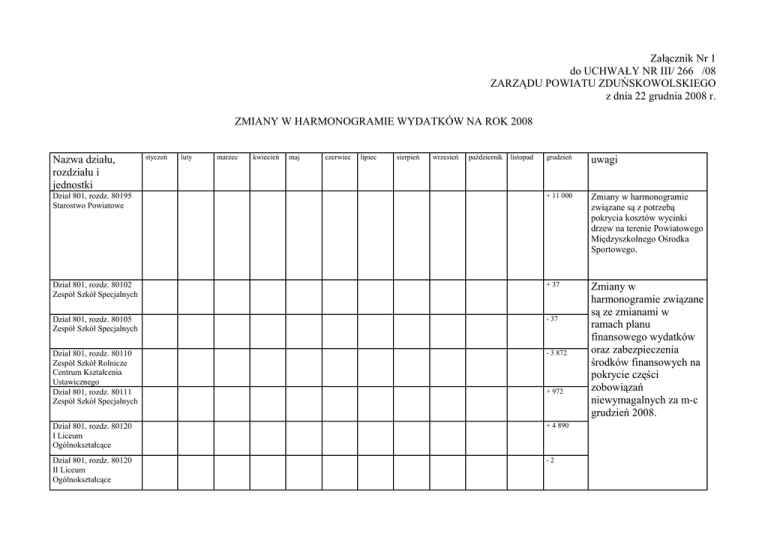 Załącznik Nr 1 do UCHWAŁY NR III/ 266 /08 ZARZĄDU POWIATU ZDUŃSKOWOLSKIEGO z dnia 22 grudnia 2008 r. ZMIANY W HARMONOGRAMIE WYDATKÓW NA ROK 2008 grudzień uwagi Dział 801, rozdz. 80195 Starostwo Powiatowe + 11 000 Zmiany w harmonogramie związane są z potrzebą pokrycia kosztów wycinki drzew na terenie Powiatowego Międzyszkolnego Ośrodka Sportowego. Dział 801, rozdz. 80102 Zespół Szkół Specjalnych + 37 Dział 801, rozdz. 80105 Zespół Szkół Specjalnych - 37 Dział 801, rozdz. 80110 Zespół Szkół Rolnicze Centrum Kształcenia Ustawicznego Dział 801, rozdz. 80111 Zespół Szkół Specjalnych - 3 872 Zmiany w harmonogramie związane są ze zmianami w ramach planu finansowego wydatków oraz zabezpieczenia środków finansowych na pokrycie części zobowiązań niewymagalnych za m-c grudzień 2008. Dział 801, rozdz. 80120 I Liceum Ogólnokształcące + 4 890 Dział 801, rozdz. 80120 II Liceum Ogólnokształcące -2 Nazwa działu, rozdziału i jednostki styczeń luty marzec kwiecień maj czerwiec lipiec sierpień wrzesień październik listopad + 972 Dział 801, rozdz. 80120 Zespół Szkół Zawodowych Nr 1 - 536 Dział 801, rozdz. 80120 Zespół Szkół - 2 483 Dział 801, rozdz. 80120 Zespół Szkół Rolnicze Centrum Kształcenia Ustawicznego Dział 801, rozdz. 80120 Zespół Szkół Ogólnokształcących dla Dorosłych Dział 801, rozdz. 80123 Zespół Szkół Zawodowych Nr 1 - 6 356 Dział 801, rozdz. 80123 Zespół Szkół Elektronicznych - 2 201 + 2 819 Dział 801, rozdz. 80123 Zespół Szkół - 1 493 + 5 510 Dział 801, rozdz. 80123 Zespół Szkół Rolnicze Centrum Kształcenia Ustawicznego Dział 801, rozdz. 80130 Zespół Szkół Zawodowych Nr 1 - 24 473 + 5 330 Dział 801, rozdz. 80130 Zespół Szkół Elektronicznych + 79 582 + 57 124 Dział 801, rozdz. 80130 Zespół Szkół - 7 848 +4 230 Dział 801, rozdz. 80130 Zespół Szkół Rolnicze Centrum Kształcenia Ustawicznego + 56 771 + 32 208 + 546 - 3 374 + 3 421 + 14 822 + 67 470 Zmiany w harmonogramie związane są ze zmianami w ramach planu finansowego wydatków oraz zabezpieczenia środków finansowych na pokrycie części zobowiązań niewymagalnych za m-c grudzień 2008. Dział 801, rozdz. 80134 Zespół Szkół Specjalnych - 972 + 7 750 Dział 801, rozdz. 80146 I Liceum Ogólnokształcące - 1 131 Dział 801, rozdz. 80146 Zespół Szkół Elektronicznych - 1 516 Dział 801, rozdz. 80146 Zespół Szkół Zawodowych Nr 1 - 317 Dział 801, rozdz. 80146 Zespół Szkół - 1 869 Dział 854, rozdz. 85404 Poradnia PsychologicznoPedagogiczna - 7 760 Dział 854, rozdz. 85406 Poradnia PsychologicznoPedagogiczna - 3 739 + 12 717 Dział 854, rozdz. 85407 Powiatowe Centrum Kultury, Sportu i Rekreacji Dział 854, rozdz.. 85410 Zespół Bursy Szkolnej - 11 603 + 14 402 Dział 854, rozdz.. 85410 Zespół Szkół Rolnicze Centrum Kształcenia Ustawicznego Dział 854, rozdz. 85417 Powiatowe Centrum Kultury, Sportu i Rekreacji Dział 854, rozdz. 85417 Zespół Bursy Szkolnej - 16 965 + 3 583 - 3 473 + 15 248 Zmiany w harmonogramie związane są ze zmianami w ramach planu finansowego wydatków oraz zabezpieczenia środków finansowych na pokrycie części zobowiązań niewymagalnych za m-c grudzień 2008. + 25 797 + 1 751 - 791 + 647 Zmiany w harmonogramie Dział 854, rozdz. 85446 Poradnia PsychologicznoPedagogiczna - 759 Dział 854, rozdz. 85446 Zespół Bursy Szkolnej - 36 Zwiększenia limitu wydatków na poszczególne miesiące wprowadzone są ze znakiem „+”, zmniejszenia ze znakiem „-”. związane są ze zmianami w ramach planu finansowego wydatków oraz zabezpieczenia środków finansowych na pokrycie części zobowiązań niewymagalnych za m-c grudzień 2008.