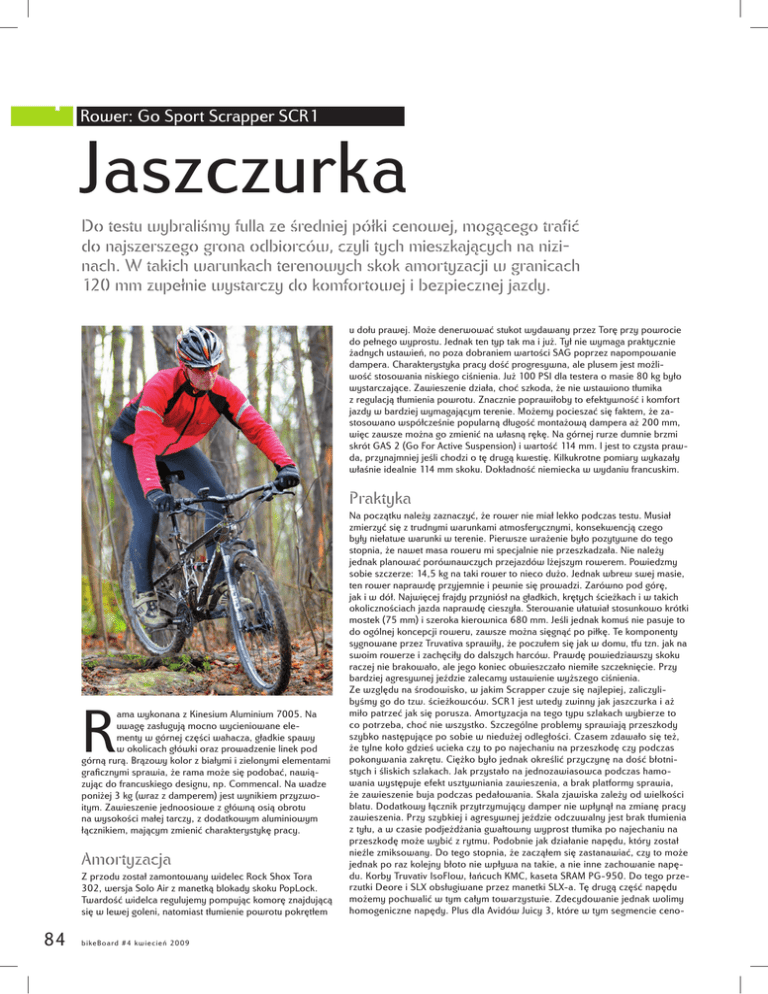 Rower: Go Sport Scrapper SCR1 Jaszczurka Do testu wybraliśmy fulla ze średniej półki cenowej, mogącego trafić do najszerszego grona odbiorców, czyli tych mieszkających na nizinach. W takich warunkach terenowych skok amortyzacji w granicach 120 mm zupełnie wystarczy do komfortowej i bezpiecznej jazdy. u dołu prawej. Może denerwować stukot wydawany przez Torę przy powrocie do pełnego wyprostu. Jednak ten typ tak ma i już. Tył nie wymaga praktycznie żadnych ustawień, no poza dobraniem wartości SAG poprzez napompowanie dampera. Charakterystyka pracy dość progresywna, ale plusem jest możliwość stosowania niskiego ciśnienia. Już 100 PSI dla testera o masie 80 kg było wystarczające. Zawieszenie działa, choć szkoda, że nie wstawiono tłumika z regulacją tłumienia powrotu. Znacznie poprawiłoby to efektywność i komfort jazdy w bardziej wymagającym terenie. Możemy pocieszać się faktem, że zastosowano współcześnie popularną długość montażową dampera aż 200 mm, więc zawsze można go zmienić na własną rękę. Na górnej rurze dumnie brzmi skrót GAS 2 (Go For Active Suspension) i wartość 114 mm. I jest to czysta prawda, przynajmniej jeśli chodzi o tę drugą kwestię. Kilkukrotne pomiary wykazały właśnie idealnie 114 mm skoku. Dokładność niemiecka w wydaniu francuskim. Praktyka R ama wykonana z Kinesium Aluminium 7005. Na uwagę zasługują mocno wycieniowane elementy w górnej części wahacza, gładkie spawy w okolicach główki oraz prowadzenie linek pod górną rurą. Brązowy kolor z białymi i zielonymi elementami graficznymi sprawia, że rama może się podobać, nawiązując do francuskiego designu, np. Commencal. Na wadze poniżej 3 kg (wraz z damperem) jest wynikiem przyzwoitym. Zawieszenie jednoosiowe z główną osią obrotu na wysokości małej tarczy, z dodatkowym aluminiowym łącznikiem, mającym zmienić charakterystykę pracy. Amortyzacja Z przodu został zamontowany widelec Rock Shox Tora 302, wersja Solo Air z manetką blokady skoku PopLock. Twardość widelca regulujemy pompując komorę znajdującą się w lewej goleni, natomiast tłumienie powrotu pokrętłem 84 bi ke Bo ar d # 4 k wi ecień 2009 Na początku należy zaznaczyć, że rower nie miał lekko podczas testu. Musiał zmierzyć się z trudnymi warunkami atmosferycznymi, konsekwencją czego były niełatwe warunki w terenie. Pierwsze wrażenie było pozytywne do tego stopnia, że nawet masa roweru mi specjalnie nie przeszkadzała. Nie należy jednak planować porównawczych przejazdów lżejszym rowerem. Powiedzmy sobie szczerze: 14,5 kg na taki rower to nieco dużo. Jednak wbrew swej masie, ten rower naprawdę przyjemnie i pewnie się prowadzi. Zarówno pod górę, jak i w dół. Najwięcej frajdy przyniósł na gładkich, krętych ścieżkach i w takich okolicznościach jazda naprawdę cieszyła. Sterowanie ułatwiał stosunkowo krótki mostek (75 mm) i szeroka kierownica 680 mm. Jeśli jednak komuś nie pasuje to do ogólnej koncepcji roweru, zawsze można sięgnąć po piłkę. Te komponenty sygnowane przez Truvativa sprawiły, że poczułem się jak w domu, tfu tzn. jak na swoim rowerze i zachęciły do dalszych harców. Prawdę powiedziawszy skoku raczej nie brakowało, ale jego koniec obwieszczało niemiłe szczeknięcie. Przy bardziej agresywnej jeździe zalecamy ustawienie wyższego ciśnienia. Ze względu na środowisko, w jakim Scrapper czuje się najlepiej, zaliczylibyśmy go do tzw. ścieżkowców. SCR1 jest wtedy zwinny jak jaszczurka i aż miło patrzeć jak się porusza. Amortyzacja na tego typu szlakach wybierze to co potrzeba, choć nie wszystko. Szczególne problemy sprawiają przeszkody szybko następujące po sobie w niedużej odległości. Czasem zdawało się też, że tylne koło gdzieś ucieka czy to po najechaniu na przeszkodę czy podczas pokonywania zakrętu. Ciężko było jednak określić przyczynę na dość błotnistych i śliskich szlakach. Jak przystało na jednozawiasowca podczas hamowania występuje efekt usztywniania zawieszenia, a brak platformy sprawia, że zawieszenie buja podczas pedałowania. Skala zjawiska zależy od wielkości blatu. Dodatkowy łącznik przytrzymujący damper nie wpłynął na zmianę pracy zawieszenia. Przy szybkiej i agresywnej jeździe odczuwalny jest brak tłumienia z tyłu, a w czasie podjeżdżania gwałtowny wyprost tłumika po najechaniu na przeszkodę może wybić z rytmu. Podobnie jak działanie napędu, który został nieźle zmiksowany. Do tego stopnia, że zacząłem się zastanawiać, czy to może jednak po raz kolejny błoto nie wpływa na takie, a nie inne zachowanie napędu. Korby Truvativ IsoFlow, łańcuch KMC, kaseta SRAM PG-950. Do tego przerzutki Deore i SLX obsługiwane przez manetki SLX-a. Tę drugą część napędu możemy pochwalić w tym całym towarzystwie. Zdecydowanie jednak wolimy homogeniczne napędy. Plus dla Avidów Juicy 3, które w tym segmencie ceno- Go Sport Scrapper SCR1 Cena: 3999,99 zł Współczynnik bB: 100 g za 27.50 zł* 580 mm Rama: aluminium Kinesium 7005 Rozmiary: M, L Geometria: rozmiar testowany: 430 mm - M 73.3° 69.8° 435 mm 327 mm 1080 mm Uwaga! Tekst jest integralną częścią testu. Wnioskowanie tylko na podstawie punktacji może prowadzić do błędów w interpretacji Klamki: Avid Juicy 3 Hamulce: Avid Juicy 3 160 mm Masa kompletnego roweru: 14 530 g Masa ramy: 2617 g Masa przedniego koła: 1945 g Masa tylnego koła: 2545 g Jazda Budowa Amortyzacja Opłacalność Ocena końcowa 5 4,5 3,5 2,8 4,2 Wspornik siodełka: Truvativ XR (350 mm) Siodełko: Selle San Marco Ponza k Kierownica: Truvativ Stylo SL (680 mm) Wspornik kierownicy: Truvativ XR (75 mm) Łożyska sterów: Cane Creek VP-A42E Piasty: Formula Obręcze: Mach1 Sub Zero Opony: Michelin Country Mud 2.0 (600/585 g) Skok amortyzacji: przód - 120 mm, tył - 114 mm Przedni widelec: Rock Shox Tora 302 Solo Air LO (2348 g) Damper: Rock Shox Bar 1.1 (371 g) Pedały: VP-M31 Rogi: Korby: Truv