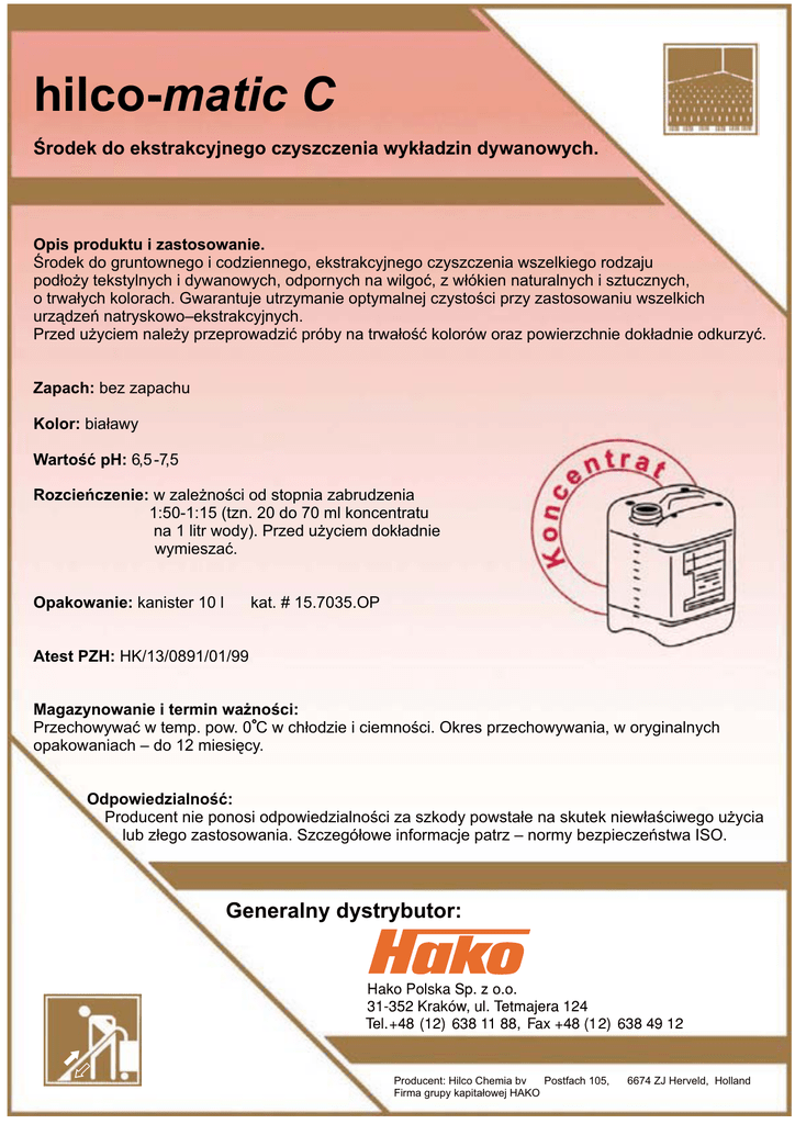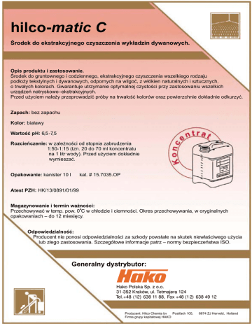 hilco-matic C Œrodek do ekstrakcyjnego czyszczenia wyk³adzin dywanowych. Opis produktu i zastosowanie. Œrodek do gruntownego i codziennego, ekstrakcyjnego czyszczenia wszelkiego rodzaju pod³o¿y tekstylnych i dywanowych, odpornych na wilgoæ, z w³ókien naturalnych i sztucznych, o trwa³ych kolorach. Gwarantuje utrzymanie optymalnej czystoœci przy zastosowaniu wszelkich urz¹dzeñ natryskowo–ekstrakcyjnych. Przed u¿yciem nale¿y przeprowadziæ próby na trwa³oœæ kolorów oraz powierzchnie dok³adnie odkurzyæ. Zapach: bez zapachu Kolor: bia³awy Wartoœæ pH: 6,5 -7,5 Rozcieñczenie: w zale¿noœci od stopnia zabrudzenia 1:50-1:15 (tzn. 20 do 70 ml koncentratu na 1 litr wody). Przed u¿yciem dok³adnie wymieszaæ. Opakowanie: kanister 10 l kat. # 15.7035.OP Atest PZH: HK/13/0891/01/99 Magazynowanie i termin wa¿noœci: Przechowywaæ w temp. pow. 0 C w ch³odzie i ciemnoœci. Okres przechowywania, w oryginalnych opakowaniach – do 12 miesiêcy. Odpowiedzialnoœæ: Producent nie ponosi odpowiedzialnoœci za szkody powsta³e na skutek niew³aœciwego u¿ycia lub z³ego zastosowania. Szczegó³owe informacje patrz – normy bezpieczeñstwa ISO. Generalny dystrybutor: Hako Polska Sp. z o.o. 31-352 Kraków, ul. Tetmajera 124 Tel.+48 (12) 638 11 88, Fax +48 (12) 638 49 12 Producent: Hilco Chemia bv Postfach 105, Firma grupy kapita³owej HAKO 6674 ZJ Herveld, Holland hilco-matic Sport Przeciwpoœlizgowy œrodek czyszcz¹cy do zastosowañ na obiektach sportowych Opis produktu i zastosowanie. Œrodek do codziennego, maszynowego i rêcznego czyszczenia wszystkich utwardzonych i wodoodpornych pokryæ pod³ogowych. Szczególnie polecany na nawierzchnie w obiektach sportowych (zgodnie z norm¹ DIN 18032), nie wp³ywa ujemnie na elastyczne pod³o¿a sportowe z punktu widzenia ich w³asnoœci antypoœlizgowych, a ponadto do obiektów takich jak szpitale, domy starców itp. Usuwa lekkie zabrudzenia i smary, schnie bez zostawiania smug i zacieków. Dzia³a tak¿e odœwie¿aj¹co. Niskopieni¹cy. Zapach: œwie¿y cytrynowy Kolor: zielony Wartoœæ pH: 7,5-8,5 Rozcieñczenie: w zale¿noœci od stopnia zabrudzenia 1:150-1:4 (tzn. 7 do 23 ml koncentratu na 1 litr wody). Przed u¿yciem dok³adnie wymieszaæ. Opakowanie: kanister 10 l beczka 200 l kat. # 15.7046.OP kat. # 15.7046.OP Atest PZH: HK/13/0891/01/99 Magazynowanie i termin wa¿noœci: Przechowywaæ w temp. pow. 0 C w ch³odzie i ciemnoœci. Okres przechowywania, w oryginalnych opakowaniach – do 12 miesiêcy. Odpowiedzialnoœæ: Producent nie ponosi odpowiedzialnoœci za szkody powsta³e na skutek niew³aœciwego u¿ycia lub z³ego zastosowania. Szczegó³owe informacje patrz – normy bezpieczeñstwa ISO. Generalny dystrybutor: Hako Polska Sp. z o.o. 31-352 Kraków, ul. Tetmajera 124 Tel.+48 (12) 638 11 88, Fax +48 (12) 638 49 12 Producent: Hilco Chemia bv Postfach 105, Firma grupy kapita³owej HAKO 6674 ZJ Herveld, Holland hilco-matic Œrodek do codziennego czyszczenia posadzek zmywalnych. Opis produktu i zastosowanie. Syntetyczny, lekko alkaiczny œrodek czyszcz¹cy do codziennego czyszczenia zmywalnych posadzek, takich jak PVC, linoleum, p³ytki ceramiczne, kamieñ naturalny i sztuczny. Hilco-matic usuwa lekkie zabrudzenia i smar, posiada w³aœciwoœci konserwuj¹ce na pod³o¿ach lakierowanych i malowanych. Niskopieni¹cy, nadaje siê wiêc idealnie do stosowania w automatycznych szorowarkach wszelkiego typu. Nie zawiera amoniaku, po jego zastosowaniu nie ma potrzeby sp³ukiwania. Zapach: œwie¿y Kolor: zielony Wartoœæ pH: 7,5-8.5 Rozcieñczenie: w zale¿noœci od stopnia zabrudzenia 1:150-1:50 (tzn. 7 do 20 ml koncentratu na 1 litr wody). Przed u¿yciem dok³adnie wymieszaæ. Opakowanie: kanister 10 l beczka 200 l kat. # 15.7048.OP kat. # 15.7048.1P Atest PZH: HK/13/0891/01/99 Magazynowanie i termin wa¿noœci: Przechowywaæ w temp. pow. 0 C w ch³odzie i ciemnoœci. Okres przechowywania, w oryginalnych opakowaniach – do 12 miesiêcy. Odpowiedzialnoœæ: Producent nie ponosi odpowiedzialnoœci za szkody powsta³e na skutek niew³aœciwego u¿ycia lub z³ego zastosowania. Szczegó³owe informacje patrz – normy bezpieczeñstwa ISO. Generalny dystrybutor: Hako Polska Sp. z o.o. 31-352 Kraków, ul. Tetmajera 124 Tel.+48 (12) 638 11 88, Fax +48 (12) 638 49 12 Producent: Hilco Chemia bv Postfach 105, Firma grupy kapita³owej HAKO 6674 ZJ Herveld, Holland hilco-matic P Œrodek do codziennego utrzymania czystoœci. Opis produktu i zastosowanie. Syntetyczny, lekko alkaiczny œrodek czyszcz¹cy do codziennego czyszczenia zmywalnych posadzek, takich jak PVC, linoleum, p³ytki ceramiczne, kamieñ naturalny i sztuczny. Hilco-matic P usuwa lekkie zabrudzenia i smar, posiada w³aœciwoœci konserwuj¹ce na pod³o¿ach lakierowanych i malowanych. Niskopieni¹cy, nadaje siê wiêc idealnie do stosowania w automatycznych szorowarkach wszelkiego typu. Nie zawiera amoniaku, po jego zastosowaniu nie ma potrzeby sp³ukiwania. Nie pozostawia smug, nadaje siê do czyszczenia natryskowego. Zapach: œwie¿y Kolor: zielony Wartoœæ pH: 6,5-8,5 Rozcieñczenie: w zale¿noœci od stopnia zabrudzenia 1:200-1:100 (tzn. 5 do 10 ml koncentratu na 1 litr wody). Przed u¿yciem dok³adnie wymieszaæ. Opakowanie: kanister 10 l beczka 200 l kat. # 15.7052. OP kat. # 15.7052.1P Atest PZH: HK/13/0891/01/99 Magazynowanie i termin wa¿noœci: Przechowywaæ w temp. pow. 0 C w ch³odzie i ciemnoœci. Okres przechowywania, w oryginalnych opakowaniach – do 12 miesiêcy. Odpowiedzialnoœæ: Producent nie ponosi odpowiedzialnoœci za szkody powsta³e na skutek niew³aœciwego u¿ycia lub z³ego zastosowania. Szczegó³owe informacje patrz – normy bezpieczeñstwa ISO. Generalny dystrybutor: Hako Polska Sp. z o.o. 31-352 Kraków, ul. Tetmajera 124 Tel.+48 (12) 638 11 88, Fax +48 (12) 638 49 12 Producent: Hilco Chemia bv Postfach 105, Firma grupy kapita³owej HAKO 6674 ZJ Herveld, Holland hilco-matic FOOD Przemys³owy œrodek czyszcz¹cy do zastosowañ w przemyœle spo
