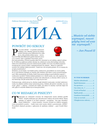 Publiczne Gimnazjum im. Jana Pawła II w Wodyniach październik 2014, numer 1 POWRÓT DO SZKOŁY P o co nam szkoła? – to pytanie zastanawia każdego z nas. Musimy męczyć się siedem godzin dziennie przez kilkanaście lat, tylko po to, żeby później zdobyć pracę – znowu harować kilka lub kilkanaście godzin dziennie przez 5, 6, a nawet 7 dni w tygodniu? Oczywiście, praca jest nam potrzebna. Przecież musimy jakoś żyć, utrzymać za coś rodzinę, opłacić rachunki. W efekcie po głębszej analizie okazuje się, szkoła jest ważna dla każdego człowieka. Gdzie teraz dostaniemy pracę bez ukończonych studiów, bez tych wszystkich papierów świadczących o naszej wiedzy i umiejętnościach? No właśnie… Mimo to większość uczniów nie traktuje szkoły poważnie. Często też z ich ust pada pytanie: Po co uczymy się aż tylu przedmiotów? Wiadomo, że nie każdy z nas będzie poetą, naukowcem, prawnikiem czy nawet sędzią. Po co nam historia, biologia czy chemia, gdy siedzimy cały dzień w pracy przed komputerem? Albo matematyka czy fizyka, kiedy nasza praca polega na prowadzeniu rozpraw i wydawaniu wyroków? Należy jednak pamiętać, że w szkole mamy czas, aby zapoznać się z tymi wszystkimi przedmiotami, by potem móc zdecydować, co chcemy robić w życiu, co nas interesuje. Bo jak można lubić coś, czego się nie zna? Podsumowując, szkoła jest po to, abyśmy mogli odnaleźć swoje pasje, rozwijać zainteresowania, by później znaleźć swoją wymarzoną pracę. Jednak, jak prawie wszystko, ma ona swoje „plusy” i „minusy”. Czasami jest ciężko, ale mimo to musimy wytrwale dążyć do celu, gdyż to wszystko składa się na naszą przyszłość. „ Musicie od siebie wymagać, nawet gdyby inni od was nie wymagali.” ~ Jan Paweł II W TYM NUMERZE Szkolne aktualności .......... 2 Kącik kinomana ................ 3 Na sportowo ...................... 4 Czy wiesz, że...? ................. 4 Uczeń od kuchni ............... 5 CO W REDAKCJI PISZCZY? T radycyjnie po wakacjach wracamy do redagowania naszej szkolnej gazetki “INNA”. Zespół redakcyjny jest zdecydowanie większy niż przed rokiem. Mamy nadzieję, że wpłynie to na ilość numerów czasopisma oraz jego charakter: więcej redaktorów — więcej tematów. Liczymy również na większe zaangażowanie pozostałych uczniów — każdy może mieć czynny udział w powstawaniu „INNEJ”. Wszystkich chętnych prosimy o zgłoszenia do opiekuna redakcji — pani Urszuli Skiermunt. Kącik poezji........................ 5 Gumkowe bransoletki ...... 5 Czas na wywiad.................. 6 Ubiegłoroczne sukcesy ...... 7 1 ROZPOCZĘCIE ROKU SZKOLNEGO 2014/2015 W poniedziałkowy poranek, 1 września o godzinie 8:30 uroczystą mszą w wodyńskim kościele zainaugurowaliśmy rok szkolny 2014/2015. Tuż po niej przemaszerowaliśmy za sztandarem do szkoły, gdzie powakacyjnie powitała nas pani dyrektor Ewa Cizio. Jak się okazało w mury naszego gimnazjum wstępuje tylko jedna, za to bardzo liczna, klasa I. Jej wychowawcą została pani Mariola Jaroszewska. Usłyszeliśmy list skierowany do uczniów przez minister edukacji narodowej i kilka nowinek dotyczących pracy naszej szkoły w nowym roku. Oczywiście, po spotkaniu w sali gimnastycznej udaliśmy się do klas, aby tam spotkać się w mniejszych gronach. Rok szkolny 2014/2015 to 185 dni nauki. UROCZYSTOŚĆ NA CMENTARZU WOJENNYM Zgodnie z naszą szkolną tradycją w jedną z wrześniowych niedziel, na cmentarzu wojennym w Woli Wodyńskiej, uczcimy pamięć poległych podczas II wojny światowej. W tym roku była to już 75. rocznica wybuchu II wojny światowej. Uroczystość odbyła się 14 września, rozpoczynając się od mszy świętej, której przewodniczył proboszcz parafii Wodynie, ksiądz Henryk Skolimowski. Następnie uczniowie klas drugich, pod opieką pani Stanisławy Urbanek przedstawili montaż słownomuzyczny, a na koniec złożyliśmy kwiaty przed pomnikiem poległych. WYBORY DO SAMORZĄDU UCZNIOWSKIEGO 29 września odbyły się wybory do Samorządu Uczniowskiego. Prawo do kandydowania mieli uczniowie o przynajmniej bardzo dobrym zachowaniu oraz ocenach powyżej „trójki”. Oczywiście, na tydzień przed głosowaniem rozpoczęła się kampania wyborcza, podczas której kandydaci za pomocą plakatów, ulotek, a nawet koszulek starali się przekonać do siebie głosujących . Wyniki wyborów przedstawiają się następująco: przewodniczący SU—Kamila Skóra (IIb) zastępca przewodniczącego—Natalia Możdżonek (IIIa) sekretarz—Natalia Sulej (I) łącznik z klasami—Karol Pietrasik (IIa) Opiekunem w tym roku jest pani Urszula Skiermunt. 2 KĄCIK KINOMANA W piątek 26 września wyświetlono uczniom gimnazjum film pt. ,,Pianista’’ w reżyserii Romana Polańskiego. Jest to dramat wojenny z 2002 roku. EUROPEJSKI DZIEŃ JĘZYKÓW 2 października w naszej szkole odbył się Europejski Dzień Języków. Świętowaliśmy go wraz ze szkołą podstawową podczas konkursu recytacji poezji anglojęzycznej oraz niemieckojęzycznej. Wyniki przedstawiały się następująco: I miejsce—Wiktoria Aryż II miejsce— Patrycja Guzek i Mateusz Krzyziński III miejsce— Sylwia Kielak, Milena Majek, Bartłomiej Kublik „NA BARYKADACH POWSTAŃCZEJ TWÓRCZOŚCI” W związku z 75. rocznicą wybuchu II wojny światowej oraz powstania Polskiego Państwa Podziemnego w naszym gimnazjum zorganizowano dotyczące ich obchody. Odbyła się projekcja filmu pt. „Pianista” w reżyserii Romana Polańskiego (26 IX), na korytarzach zostały przygotowane specjalne gazetki, a 3 X— w dzień honorowej kapitulacji Powstania Warszawskiego - uczniowie wzięli u d z i a ł w konkursie wiedzy dotyczącej tego okresu i obejrzeli inscenizację przygotowaną przez klasę IIIa wraz z panią Barbarą Kuć. Fabuła dotyczy prawdziwych wspomnień polskiego pianisty o żydowskim pochodzeniu - Władysława Szpilmana. Do Polski wkraczają niemieckie odziały. Pozbawi