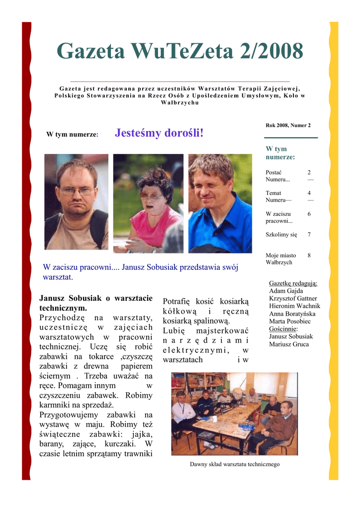 Gazeta WuTeZeta 2/2008 G a z e t a j e s t r e d a g o w a na p r z e z u c z e s t n i kó w Wa r s z t a t ó w T e r a p i i Za j ę c i o w e j , P o l s ki e g o S t o w a r zy s z en i a n a R z e c z O s ó b z Up o ś l e d z e n i e m U my s ł o w y m, K o ł o w Wałbrzychu Rok 2008, Numer 2 W tym numerze: Jesteśmy dorośli! W tym numerze: W zaciszu pracowni.... Janusz Sobusiak przedstawia swój warsztat. Janusz Sobusiak o warsztacie technicznym. Przychodzę na warsztaty, u c z es tni c z ę w z a ję c i ac h warsztatowych w pracowni technicznej. Uczę się robić zabawki na tokarce ,czyszczę zabawki z drewna papierem ściernym . Trzeba uwaŜać na ręce. Pomagam innym w czyszczeniu zabawek. Robimy karmniki na sprzedaŜ. Przygotowujemy zabawki na wystawę w maju. Robimy teŜ świąteczne zabawki: jajka, barany, zające, kurczaki. W czasie letnim sprzątamy trawniki Potrafię kosić kosiarką kółkową i ręczną kosiarką spalinową. Lubię majsterkować n a r z ę d z i a m i elektrycznymi, w warsztatach iw Postać Numeru... 2 — Temat Numeru— 4 — W zaciszu pracowni... 6 Szkolimy się 7 Moje miasto Wałbrzych 8 Gazetkę redagują: Adam Gajda Krzysztof Gattner Hieronim Wachnik Anna Boratyńska Marta Posobiec Gościnnie: Janusz Sobusiak Mariusz Gruca Dawny skład warsztatu technicznego Postać numeru—Iwona Sztendel Wywiad z Iwoną Sztendel przeprowadził Hieronim Wachnik. H.W. Od ilu lat pracujesz? I.SZ. Tutaj, czy tak w ogóle? Tak w ogóle to 13 lat, 13 i pół. H.W. Czym się interesujesz? I.Sz. Czytam ksiąŜki, róŜne poradniki psychologiczne, wyszukuję coś w internecie, np.. Na stronach religijnych, interesuję się robieniem zdjęć, kiedyś malowałam, ale teraz nie mam czasu. Teraz jeszcze interesuję się robieniem remontów, bo to moŜe się przydać, kładzeniem płytek ceramicznych w kuchni, malowaniem wnętrz. H.W. Czy lubisz muzykę? I.Sz. Lubię muzykę, przewaŜnie spokojną, albo religijną i poezję śpiewaną. H.W. Czy wychodzisz za mąŜ? I.Sz. Aktualnie nie wychodzę za mąŜ. H.W. Co myślisz robić w przyszłości? I.Sz. Przyszłość jest taka mglista, nie wiadomo, co przyniesie przyszłość, na razie jestem tu i teraz i pracuję tutaj. Filozoficzna odpowiedź. H.W. Ile zarabiasz? I. Sz. Muszę na to pytanie odpowiedzieć? Chyba nie muszę, bo to jest prywatna tajemnica. H.W. Jakie masz wykształcenie? I.Sz. Wykształcenie wyŜsze magisterskie, z zakresu terapii pedagogicznej z pedagogiką specjalną, parę szkół zrobionych. H.W. Czy myślisz iść na emeryturę? I. Sz. Jak doŜyję, to myślę, Ŝe pójdę na emeryturę, jak Bóg da. H.W. Czy ten zwód jest cięŜki? Str. 2 tu pracuje, lubię tę pracę. H.W. Czy masz zamiar zmienić pracę? I. Sz. Teraz nie myślałam o zmianie pracy, na razie nie. H.W. Czy interesujesz się sportem? I. Sz. Chyba raczej nie , sporadycznie obejrzę mecz, jak jestem u kogoś, ale nie interesuję się za bardzo. H.W. Czy jesteś wierząca? I. Sz. ZaleŜy w co. ...Tak, jestem wierząca, wierzę w Boga. H.W. Czy słuchasz Radia Maryja? I. Sz. Nie, nie słucham, rzadko. Chyba Ŝe jadę samochodem, to słucham przewaŜnie RMF FM lub Radia Zet. H.W. Czy chodzisz do kościoła? I. Sz. Chodzę do kościoła, w niedzielę i święta, a czasem coś ponadto. H.W. Czy masz ksiąŜki religijne? I. Sz. Mam róŜne takie ksiąŜki, tak. H.W. Czy masz wieŜę, czy radiomagnetofon? Gazeta WuTeZeta 2/2008 Postać Numeru—Iwona Sztendel H.W. Czy chodzisz na spacery? I. Sz. Tak, jak mam jakąś wenę, ochotę, to wybieram się na spacer, ale zimą rzadziej, bo jest zimno i ciemno. H.W. Czy chodzisz na koncerty? I. Sz. Parę razy w Ŝyciu byłam na jakimś koncercie, ale Ŝeby chodzić tak to nie, czasem jak trafi się, to idę. H.W. Czy masz zdolności w pracy? I. Sz. Wydaje mi się, Ŝe mam jakieś zdolności w pracy, bo inaczej nie szłaby mi ta praca i byłoby mi cięŜko. H.W. Czy masz ambicję? I. Sz. Chyba kaŜdy człowiek ma jakąś ambicję, jeden w stopniu mniejszym, inny w większym, a tak ogólnie to teraz nie odpowiem na to pytanie tak bardziej. Mam na pewno ambicje. H.W. Czy planujesz zakładać rodzinę? I. Sz. To jest związane z przyszłością, na razie chyba nie planuję, bo co przyniesie przyszłość, zobaczymy. H.W. Jaki jest Twój ulubiony kolor odzieŜy? I.Sz .Zielony H.W. Jaki jest Twój typ męŜczyzny? I.Sz. Najlepiej, jakby taki męŜczyzna miał czarne włosy, zrośnięte brwi czarne, wąsa i Ŝeby nie był za bardzo chudy, bo nie lubię. H.W. Czy pracowałaś fizycznie? I. Sz. No, co jakiś czas pracuję fizycznie, tutaj w pracy teŜ i w domu pracuję fizycznie. H.W. Czy wygrałaś kiedyś w TOTO LOTKA? I. Sz. Wygrałam, ale bardzo dawno temu, jak byłam w szkole podstawowej, to wtedy sobie kupiłam rzutnik do filmów dla dzieci Rok 2008, Numer 2 H.W. Czy grałaś w loterię? I. Sz. Grałam, jak juŜ, to sporadycznie, bardzo rzadko. H.W. Ile masz lat? I. Sz. Kobiety się nie pyta o wiek. H.W. Czy miałaś kiedyś stłuczkę samochodową? I. Sz. Miałam, ale nie tak, Ŝe jechałam, tylko na parkingu: stuknęłam samochód lusterkiem, u mnie nic się nie stało. H.W. Czy lubisz jeździć na wycieczki? I. Sz. Tak, bardzo lubię jeździć na wycieczki. H.W. Jakie masz plany? I. Sz. Na razie takie krótko terminowe, Ŝeby egzamin 5 stycznia, no i Ŝe zadać resztę i Ŝeby wyremontować moje całe mieszkanie po kolei, jestem na takim etapie dość zaawansowanym, oczywiście w remoncie, mam plany, Ŝeby robić duŜo lepszych zdjęć, zobaczymy, co przyniesie przyszłość. H.W. Dziękuję bardzo. Str. 3 Temat numeru — DOROSŁOŚĆ 1. Hirek Wachnik : Dorosłość jest to odpowiedzialność za siebie, decydowanie o swoim Ŝyciu . 2. Krzysztof Gattner: Dorosłość to załatwianie róŜnych swoich spraw, na przykład w urzędach i chodzenie do pracy . 3. Janek Sobusiak: Dorosłość to uczestnictwo w róŜnych kursach , robienie róŜnych opłat . pracę i urlopy. To prawo do prywatności, swobodne w