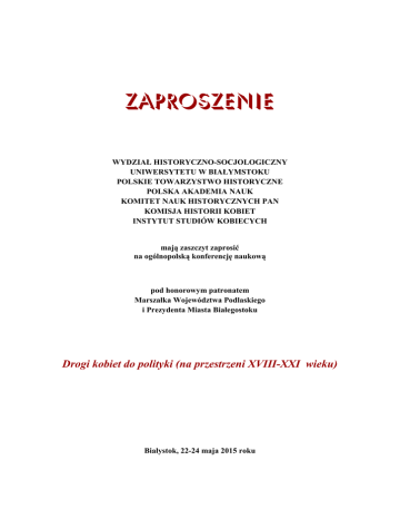 Zaproszenie WYDZIAŁ HISTORYCZNO-SOCJOLOGICZNY UNIWERSYTETU W BIAŁYMSTOKU POLSKIE TOWARZYSTWO HISTORYCZNE POLSKA AKADEMIA NAUK KOMITET NAUK HISTORYCZNYCH PAN KOMISJA HISTORII KOBIET INSTYTUT STUDIÓW KOBIECYCH mają zaszczyt zaprosić na ogólnopolską konferencję naukową pod honorowym patronatem Marszałka Województwa Podlaskiego i Prezydenta Miasta Białegostoku Drogi kobiet do polityki (na przestrzeni XVIII-XXI wieku) Białystok, 22-24 maja 2015 roku PROGRAM Piątek, 22 maja 2015 r., Sala Audytoryjna, Biblioteka Uniwersytecka, ul. M. Skłodowskiej-Curie 14A, VI piętro 11.00 Rozpoczęcie konferencji i powitanie Gości 11.15 -12.00 Dr hab. prof. UAM Maria Solarska (UAM), Kobiety w sferze publicznej/politycznej – wyzwania historiograficzne Prof. dr hab. Bożena Popiołek (UP w Krakowie), Między przestrzenią domową a wielką polityką. Kobiety w polityce w czasach Augusta II dr Agnieszka Jakuboszczak (UAM), Aktywność polityczna wielkopolskich szlachcianek w XVIII wieku 12.00 – 13.00 przerwa kawowa, zwiedzanie Gabinetu Prezydenta Ryszarda Kaczorowskiego 13.00 – 14.00 Prof. dr hab. Teresa Kulak (UWr), Rządy kobiet w Naczelnej Radzie Dozorczej Izby Edukacyjnej Księstwa Warszawskiego w latach 1808-1812 Prof. dr hab. Andrzej Szwarc (UW), Czy osoba publiczna może być apolityczna? Casus Gabrieli Zapolskiej Prof. dr hab. Tadeusz Stegner (UG), W cieniu mistrza. Kobiety aktywne politycznie w otoczeniu Aleksandra Świętochowskiego Dr Beata Walęciuk –Dejneka (UPH w Siedlcach), Droga przez ofiarę, zasługę, poświęcenie... - romantyczne wzorce kobiet na przykładzie wybranych tekstów literackich 14.00 – 15.00 obiad – hotel Pastel 15.00 – 16.00 Prof. dr hab. Jolanta Sikorska-Kulesza (UW), Metody prowadzenia polityki przez działaczki kobiece na początku XX wieku Dr Ewelina Kostrzewska (UŁ), ,,Z Bogiem i narodem". Ziemianek Królestwa Polskiego sposoby na politykę (początek XX wieku) Dr hab. prof. USz Agnieszka Chlebowska, (USz), Stowarzyszenia kobiece w Niemczech wobec zniesienia zakazu przynależności kobiet do partii politycznych (19081914) na przykładzie Szczecina Dr Grażyna Wyder (UZ), Przejawy politycznej działalności Wielkopolanek w świetle analizy uzasadnień wniosków o nadanie Medalu Niepodległości 16.00 - 17.00 dyskusja 17.00 - 18.00 Zebranie Komisji Historii Kobiet 20.00 uroczysta kolacja – hotel Pastel Sobota, 23 maja 2015 r., Sala nr 121, budynek Wydziału HistorycznoSocjologicznego, Plac Uniwersytecki 1 9.30 – 10.30 Prof. dr hab. Zofia Chyra-Rolicz (UPH w Siedlcach), Wysiłki kooperatystek na rzecz pokoju (1915 - 1939) Prof. dr hab. Ewa Maj (UMCS), Wzorce aktywności kobiet w Narodowej Demokracji Dr Tomasz Pudłocki (UJ), Szansa realizacji kobiet w polityce z miast prowincjonalnych Polski południowo wschodniej w latach 1918-1939 Dr Aneta Bołdyrew (UŁ), Od działalności oświatowej do aktywności politycznej. Helena Radlińska, Zofia Daszyńska-Golińska, Stefania Sempołowska 10.30 - 11.00 przerwa kawowa 11.00 – 12.00 Dr hab. Joanna Dufrat (UWr), Działalność Centralnego Wydziału Kobiecego w CKW PPS w latach 1918-1939 Prof. dr hab. Halina Parafianowicz (UwB), Reformatorki i pionierki: Amerykanki w polityce i dyplomacji Stanów Zjednoczonych w okresie międzywojennym Dr Monika Piotrowska-Marchewa (UWr), Nauczycielki — Obywatelki. Wpływ szkolnictwa i organizacji oświatowych Drugiej Rzeczypospolitej na kształtowanie się kobiecych struktur polityce Prof. dr hab. Marek Przeniosło, dr hab. prof. UJK Małgorzata Przeniosło (UJK w Kielcach) Polki w Londynie po II wojnie światowej - aktywność społeczna i polityczna 12.00 – 13.00 dyskusja 13.00 – 14.00 obiad - hotel Pastel 15.00 spacer po Białymstoku (Rynek Główny, Pałac Branickich, Opera i Filharmonia Podlaska) Niedziela, 24 maja 2015 r., Sala nr 121, budynek Wydziału HistorycznoSocjologicznego, Plac Uniwersytecki 1 9.30 – 10.30 Dr hab. Piotr Perkowski (UG), Droga do władzy? Kobiety w PZPR Dr Natalia Jarska ( IPN), Kariery kobiet w elitach PPR i PZPR w latach 1945-1965 Dr Agnieszka Mrozik (IBL PAN), (Zawodowe) rewolucjonistki. Miejsce kobiet w polskim ruchu komunistycznym w świetle wspomnień z lat 60. XX wieku 10.30 – 11.00 przerwa kawowa 11.00 – 12.00 Dr Agnieszka Chłosta-Sikorska (UP w Krakowie), Kandydatki na zjazdy PZPR w latach 80. Portret zbiorowy Dr hab. prof. UwB Małgorzata Dajnowicz (UwB), Wzorce aktywności publicznej kobiet w początkach transformacji ustrojowej w Polsce (w świetle czasopism kobiecych) Prof. dr hab. Grażyna Szelągowska (UW), Kobiety w świecie duńskiej polityki. Na podstawie serialu TV "Rząd" (Borgen), 2010-2013 12.00 – 13.30 dyskusja, podsumowanie konferencji 13.30 obiad - hotel Pastel Konferencja współfinansowana przez Województwo Podlaskie