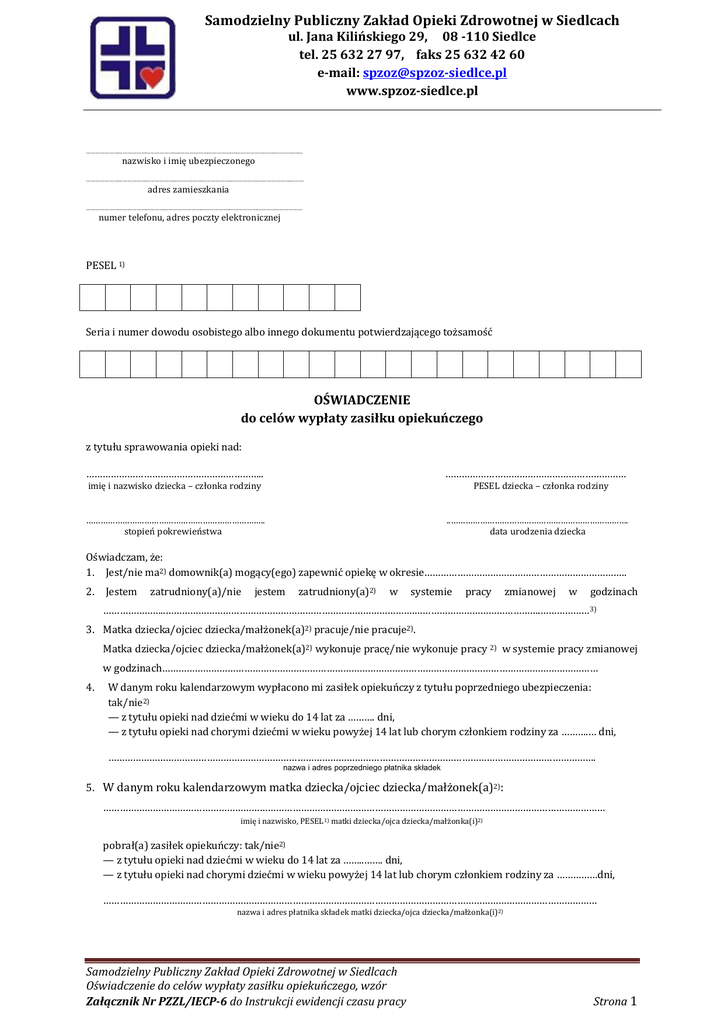 Samodzielny Publiczny Zakład Opieki Zdrowotnej w Siedlcach ul. Jana Kilińskiego 29, 08 -110 Siedlce tel. 25 632 27 97, faks 25 632 42 60 e-mail: [email protected] www.spzoz-siedlce.pl ……………………………………………………..…………………………….………………….……………….…… nazwisko i imię ubezpieczonego …………………………………………………………….…………………………………….………………………… adres zamieszkania ………………………………………………………………………………….………………………………………… numer telefonu, adres poczty elektronicznej PESEL 1) Seria i numer dowodu osobistego albo innego dokumentu potwierdzającego tożsamość OŚWIADCZENIE do celów wypłaty zasiłku opiekuńczego z tytułu sprawowania opieki nad: ……………………………………………………….. ………………………………………………………… imię i nazwisko dziecka – członka rodziny PESEL dziecka – członka rodziny ……………………………………………………………….. stopień pokrewieństwa ..………………………………………………………………. data urodzenia dziecka Oświadczam, że: 1. Jest/nie ma2) domownik(a) mogący(ego) zapewnić opiekę w okresie……………………………………………………………….. 2. Jestem zatrudniony(a)/nie jestem zatrudniony(a)2) w systemie pracy zmianowej w godzinach …………………..……………………………………………………………………………….……………………………………….………………3) 3. Matka dziecka/ojciec dziecka/małżonek(a)2) pracuje/nie pracuje2). Matka dziecka/ojciec dziecka/małżonek(a)2) wykonuje pracę/nie wykonuje pracy 2) w systemie pracy zmianowej w godzinach…………………………………………………………………………………………………………………………………………… 4. W danym roku kalendarzowym wypłacono mi zasiłek opiekuńczy z tytułu poprzedniego ubezpieczenia: tak/nie2) — z tytułu opieki nad dziećmi w wieku do 14 lat za ………. dni, — z tytułu opieki nad chorymi dziećmi w wieku powyżej 14 lat lub chorym członkiem rodziny za ……….… dni, ……………………………………………………………………………………………………………………………………………………………. nazwa i adres poprzedniego płatnika składek 5. W danym roku kalendarzowym matka dziecka/ojciec dziecka/małżonek(a)2): ………………………………………………………………………………………………………………………………………………………………… imię i nazwisko, PESEL1) matki dziecka/ojca dziecka/małżonka(i)2) pobrał(a) zasiłek opiekuńczy: tak/nie2) — z tytułu opieki nad dziećmi w wieku do 14 lat za ……..……. dni, — z tytułu opieki nad chorymi dziećmi w wieku powyżej 14 lat lub chorym członkiem rodziny za ……………dni, ……………………………………………………………………………………………………………………………………………………………… nazwa i adres płatnika składek matki dziecka/ojca dziecka/małżonka(i)2) Samodzielny Publiczny Zakład Opieki Zdrowotnej w Siedlcach Oświadczenie do celów wypłaty zasiłku opiekuńczego, wzór Załącznik Nr PZZL/IECP-6 do Instrukcji ewidencji czasu pracy Strona 1 6. W danym roku kalendarzowym inny członek rodziny: ………………………………………………………………………………………………………………………………………………………………. imię i nazwisko, PESEL innego członka rodziny1) pobrał zasiłek opiekuńczy: tak/nie2) — z tytułu opieki nad dzieckiem w wieku do 8. tygodnia życia za …………… dni, —z tytułu opieki nad chorym członkiem rodziny za ……………… dni. ……………………………………………………………………………………………………………………………………………………………… nazwa i adres płatnika składek innego członka rodziny 7. Pozostaję/nie pozostaję we wspólnym gospodarstwie domowym z wymienionym wyżej dzieckiem w wieku powyżej 14 lat lub z innym chorym członkiem rodziny. Proszę o wypłatę zasiłku opiekuńczego na rachunek bankowy nr: ……………………………………………… miejscowość i data ……………………………………………… podpis ubezpieczonego ______________________________ 1) W przypadku gdy ubezpieczonemu nie nadano numeru PESEL, należy wpisać serię i numer dowodu osobistego albo innego dokumentu potwierdzającego tożsamość. 2) Niepotrzebne skreślić. Wypełnia tylko osoba, której zasiłek opiekuńczy wypłaca ZUS. 3) POUCZENIE Podstawa prawna: ustawa z dnia 25 czerwca 1999 r. o świadczeniach pieniężnych z ubezpieczenia społecznego w razie choroby i macierzyństwa (Dz.U. z 2010 r. nr 77, poz. 512 z późn. zm.) Zasiłek opiekuńczy przysługuje osobie podlegającej ubezpieczeniu chorobowemu z tytułu sprawowania opieki nad dzieckiem w wieku do ukończenia 8 lat, chorym dzieckiem w wieku do ukończenia 14 lat oraz innym chorym członkiem rodziny. Za członków rodziny uważa się małżonka, rodziców, teściów, dziadków, wnuków, rodzeństwo oraz dzieci w wieku powyżej 14 lat, pod warunkiem, że w okresie sprawowania opieki pozostają we wspólnym gospodarstwie domowym z ubezpieczonym. Zasiłek opiekuńczy z tytułu opieki nad dziećmi i innymi członkami rodziny przysługuje łącznie przez okres do 60 dni w roku kalendarzowym. Z tytułu opieki nad innymi chorymi członkami rodziny, w tym chorym dzieckiem w wieku powyżej 14 lat, zasiłek opiekuńczy prz