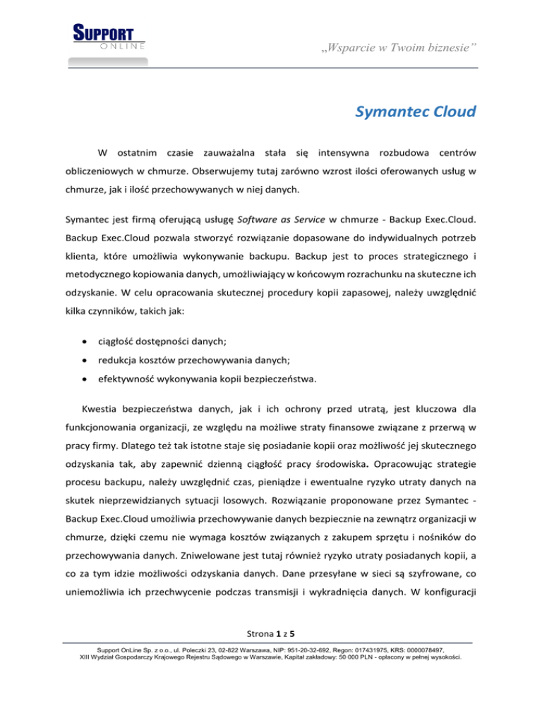 „Wsparcie w Twoim biznesie” Symantec Cloud W ostatnim czasie zauważalna stała się intensywna rozbudowa centrów obliczeniowych w chmurze. Obserwujemy tutaj zarówno wzrost ilości oferowanych usług w chmurze, jak i ilość przechowywanych w niej danych. Symantec jest firmą oferującą usługę Software as Service w chmurze - Backup Exec.Cloud. Backup Exec.Cloud pozwala stworzyć rozwiązanie dopasowane do indywidualnych potrzeb klienta, które umożliwia wykonywanie backupu. Backup jest to proces strategicznego i metodycznego kopiowania danych, umożliwiający w końcowym rozrachunku na skuteczne ich odzyskanie. W celu opracowania skutecznej procedury kopii zapasowej, należy uwzględnić kilka czynników, takich jak: ciągłość dostępności danych; redukcja kosztów przechowywania danych; efektywność wykonywania kopii bezpieczeństwa. Kwestia bezpieczeństwa danych, jak i ich ochrony przed utratą, jest kluczowa dla funkcjonowania organizacji, ze względu na możliwe straty finansowe związane z przerwą w pracy firmy. Dlatego też tak istotne staje się posiadanie kopii oraz możliwość jej skutecznego odzyskania tak, aby zapewnić dzienną ciągłość pracy środowiska. Opracowując strategie procesu backupu, należy uwzględnić czas, pieniądze i ewentualne ryzyko utraty danych na skutek nieprzewidzianych sytuacji losowych. Rozwiązanie proponowane przez Symantec Backup Exec.Cloud umożliwia przechowywanie danych bezpiecznie na zewnątrz organizacji w chmurze, dzięki czemu nie wymaga kosztów związanych z zakupem sprzętu i nośników do przechowywania danych. Zniwelowane jest tutaj również ryzyko utraty posiadanych kopii, a co za tym idzie możliwości odzyskania danych. Dane przesyłane w sieci są szyfrowane, co uniemożliwia ich przechwycenie podczas transmisji i wykradnięcia danych. W konfiguracji Strona 1 z 5 Support OnLine Sp. z o.o., ul. Poleczki 23, 02-822 Warszawa, NIP: 951-20-32-692, Regon: 017431975, KRS: 0000078497, XIII Wydział Gospodarczy Krajowego Rejestru Sądowego w Warszawie, Kapitał zakładowy: 50 000 PLN - opłacony w pełnej wysokości. „Wsparcie w Twoim biznesie” wybieramy sposób wysyłania danych do chmury, bezpośrednio lub za pośrednictwem lokalnego serwera proxy. Instalacja agentów Backup Exec.Cloud na klienckich systemach operacyjnych jest intuicyjna i możemy korzystać tutaj z gotowych rozwiązań przygotowanych przez Symantec. W pierwszej kolejności należy przygotować pliki instalacyjne agenta, zawierające wszystkie informacje konfiguracyjne, potrzebne do połączenia hosta z chmurą. Producent przygotował nam kilka możliwości automatyzacji instalacji Backup Exec.Cloud. Jedną z opcji jest przygotowanie paczki instalacyjnej w formie pliku wykonywalnego exe oraz użycie skryptów wiersza poleceń. Druga możliwość to stworzenie pliku instalatora Windows - msi, a następnie korzystając z zasad zarządzania grup, możemy rozdystrybuować instalacje agentów na hosty. Inną opcją jest przygotowanie paczki instalacyjnej w panelu administracyjnym i wysłanie jej pocztą lub pobranie bezpośrednio z panelu na komputer kliencki. Backup Exec.Cloud wspiera takie systemy operacyjne klienckie jak: 32 i 64 bitowe Windows XP, Vista, 7 i 8 oraz serwerowe Serwer 2003, 2008 i 2012. Strona 2 z 5 Support OnLine Sp. z o.o., ul. Poleczki 23, 02-822 Warszawa, NIP: 951-20-32-692, Regon: 017431975, KRS: 0000078497, XIII Wydział Gospodarczy Krajowego Rejestru Sądowego w Warszawie, Kapitał zakładowy: 50 000 PLN - opłacony w pełnej wysokości. „Wsparcie w Twoim biznesie” Przygotowanie paczki instalacyjnej agenta na lokalnym komputerze odbywa się za pomocą zautomatyzowanego procesu, polegającego na przejściu kilku kroków, w których konieczne jest zaznaczenie interesujących nas opcji – np. wskazanie lokalizacji zapisu plików wyjściowych oraz wybór sposobu rozpropagowania agenta w środowisku. Wszystkie parametry konfiguracyjne zaszyte będą w plikach wyjściowych. Po zainstalowaniu agenta na hoście zostaje wysłana wiadomość do administratora systemu. Otrzymujemy w niej informacje o tym, że agent działa i jest dostępny w hoście. Należy wtedy przypisać host do odpowiedniej grupy oraz skonfigurować na nim opcje dotyczące konfiguracji i harmonogramu backupu. Zarządzanie Backup Exec.Cloud odbywa się za pomocą webowego panelu administracyjnego z poziomu, z którego mamy możliwość konfiguracji agentów, monitorowania wykonywania kopii zapasowych oraz innych zadań związanym z działaniem systemu backupu. Z panelu administracyjnego możemy zarządzać zadaniami, takimi jak przywrócenie danych czy odzyskanie systemu po krytycznej awarii. Backup Exex.Cloud pozwala na odzyskanie systemów na inny sprzęcie bare matal recowery. Strona 3 z 5 Support OnLine Sp. z o.o., ul. Poleczki 23, 02-822 Warszawa, NIP: 951-20-32-692, Regon: 017431975, KRS: 0000078497, XIII Wydział Gospodarczy Krajowego Rejestru Sądowego w Warszawie, Kapitał zakładowy: 50 000 PLN - opłacony w pełnej wysokości. „Wsparcie w Twoim biznesie” Strona 4 z 5 Support OnLine Sp. z o.o., ul. Poleczki 23, 02-822 Warszawa, NIP: 951-20-32-692, Regon: 017431975, KRS: 0000078497, XIII Wydział Gospodarczy Krajowego Rejestru Sądowego w Warszawie, Kapitał zakładowy: 50 000 PLN - opłacony w pełnej wysokości. „Wsparcie w Twoim biznesie” Backup Exec.Cloud jest rozwiązaniem, którego wdrożenie powinna rozważyć każda organizacja, która nie chce ponosić nadmiernych kosztów inwestycyjnych w licencje i sprzęt, a jej polityka zezwala na przechowywanie danych w chmurze. Uwalnia ono od kosztów związanych z zabezpieczeniem kopii przed ich utraceniem na skutek nieszczęśliwych wypadków. Może być również uzupełnieniem dla organizacji, które chcą zapewnić bezpieczeństwo pracowników, którzy pracują poza siedzibą firmy, a mają dostęp do łączy internetowych, umożliwiających połączenie się z chmurą i wykonanie backupu. Ar