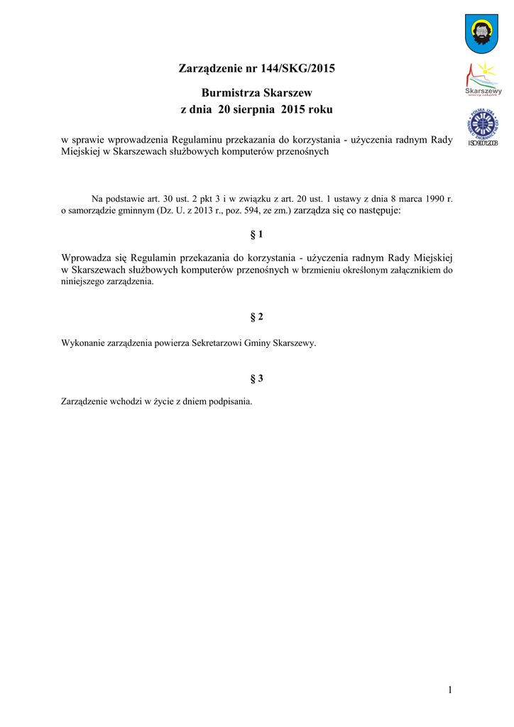 Zarządzenie nr 144/SKG/2015 Burmistrza Skarszew z dnia 20 sierpnia 2015 roku w sprawie wprowadzenia Regulaminu przekazania do korzystania - uŜyczenia radnym Rady Miejskiej w Skarszewach słuŜbowych komputerów przenośnych Na podstawie art. 30 ust. 2 pkt 3 i w związku z art. 20 ust. 1 ustawy z dnia 8 marca 1990 r. o samorządzie gminnym (Dz. U. z 2013 r., poz. 594, ze zm.) zarządza się co następuje: §1 Wprowadza się Regulamin przekazania do korzystania - uŜyczenia radnym Rady Miejskiej w Skarszewach słuŜbowych komputerów przenośnych w brzmieniu określonym załącznikiem do niniejszego zarządzenia. §2 Wykonanie zarządzenia powierza Sekretarzowi Gminy Skarszewy. §3 Zarządzenie wchodzi w Ŝycie z dniem podpisania. 1 ISO9001:2008 Załącznik do Zarządzenia nr 144/SKG/2015 Burmistrza Skarszew z dnia 20 sierpnia 2015 roku Regulamin przekazania do korzystania - uŜyczenia radnym Rady Miejskiej w Skarszewach słuŜbowych komputerów przenośnych §1 SłuŜbowe komputery przenośne, zwane dalej laptopami, stanowiące własność Gminy Skarszewy, przyznawane są radnym Rady Miejskiej w Skarszewach w celu zapewnienia im dostępu do dokumentów związanych z pracami Rady Miejskiej w Skarszewach i jej komisji, poprzez sieć Internet. §2 1. SłuŜbowy laptop wraz z kartą SIM, przyznawany jest radnemu na czas sprawowania przez niego mandatu. 2. Przyznanie laptopa następuje po podpisaniu przez radnego umowy uŜyczenia, zwanej dalej umową, której wzór stanowi załącznik nr 1 do regulaminu. 3. Przekazanie laptopa następuje po podpisaniu umowy i protokołu przekazania, według wzoru stanowiącego załącznik nr 2 do regulaminu. 4. Merytoryczną obsługę związaną z przekazaniem i obsługą laptopa sprawuje Wydział Organizacyjny i Spraw Obywatelskich Urzędu Miejskiego w Skarszewach. 5. Po upływie czasu określonego w umowie abonenckiej z operatorem telefonii komórkowej, sprzęt przechodzi na własność Radnego. §3 1. Laptop przekazany radnemu moŜe mieć zainstalowane wyłącznie oprogramowanie, na które licencje posiada Gmina Skarszewy. 2 2. Czynności instalowania, aktualizowania oprogramowania oraz obsługę serwisową wykonuje pracownik Wydziału Organizacyjnego i Spraw Obywatelskich Urzędu Miejskiego w Skarszewach. §4 1. Zwrot laptopa następuje w przypadkach określonych w umowie, której wzór stanowi załącznik nr 1 do regulaminu. 2. O rozwiązaniu umowy informowany jest Przewodniczący Rady Miejskiej w Skarszewach. 3. Przyjęcia zwracanego laptopa dokonuje się w formie protokołu zdawczo - odbiorczego, którego wzór stanowi załącznik nr 3 do regulaminu. 4. W przypadku stwierdzenia uszkodzenia laptopa lub karty SIM, fakt ten wraz z opisem uszkodzenia odnotowuje się w protokole zwrotu. 5. W przypadku gdy uszkodzenie powstało z winy biorącego do uŜywania, obciąŜany jest on kosztami naprawy. 6. W przypadku naruszenia przez biorącego do uŜywania postanowień umowy następuje blokada karty SIM. 7. W przypadku naruszenia przez biorącego do uŜywania postanowień umowy, obciąŜany jest on kosztami wykorzystywania karty SIM niezgodnie z przeznaczeniem w wysokości wynikającej z faktur wystawionych przez operatora świadczącego usługi telefonii komórkowej dla Gminy Skarszewy. 3 Załącznik nr 1 Regulaminu przekazania do korzystania – uŜyczenia radnym Rady Miejskiej w Skarszewach słuŜbowych komputerów przenośnych Umowa przekazania do korzystania - uŜyczenia nr……/2015 zawarta w dniu ……………w Skarszewach pomiędzy: 1. Gminą Skarszewy, w imieniu, której działa Urząd Miejski w Skarszewach, reprezentowaną przez: Jacka Pauliego - Burmistrza Skarszew - Główny Księgowy przy udziale, Mirosławy Drzymalskiej – zwaną dalej „UŜyczającym” a 2. Panem/Panią …………………….……., radnym(ą) Rady Miejskiej w Skarszewach, legitymującym(ą) się dowodem osobistym nr …………….…. (PESEL: …………………) zamieszkałym(ą) w …………..……………. – zwanym(ą) dalej „Biorącym do uŜywania” lub „Biorącym”, zawarta została umowa o następującej treści: §1 UŜyczający oświadcza, Ŝe dysponuje laptopem i kartą SIM (w ramach zawartej umowy z operatorem świadczącym usługi telefonii komórkowej dla Gminy Skarszewy) – określone szczegółowo w protokole przekazania – zwane dalej laptopem. §2 1. UŜyczający przekazuje Biorącemu do korzystania – uŜywania laptop, a Biorący przyjmuje go na czas sprawowania mandatu radnego Rady Miejskiej w Skarszewach. 2. Przekazanie laptopa następuje w celu zapewnienia Biorącemu dostępu do dokumentów związanych z pracami Rady Miejskiej w Skarszewach i jej komisji poprzez sieć Internet. 4 3. Przekazanie laptopa następuje po podpisaniu przez Biorącego umowy i protokołu przekazania, będącego załącznikiem do niniejszej umowy. 4. Biorący ponosi wyłącznie koszty: 1) abonamentowe wynikające z uŜytkowania karty SIM; 2) koszty transmisji danych realizowanej za pośrednictwem operatora świadczącego usługi telefonii komórkowej dla Gminy Skarszewy. w wysokości 30,00 zł (trzydzieści złotych 00/100) zgodnie z złoŜonym oświadczeniem w załączeniu. §3 1. Biorący ponosi pełną odpowiedzialność materialną za szkodę powstałą w laptopie, jeŜeli powstała ona z jego winy. 2. Biorący zobowiązany jest do niezwłocznego zgłaszania UŜyczającemu wszelkich stwierdzonych usterek bądź wad laptopa, jak równieŜ nieprawidłowości jego pracy lub działania. 3. Biorący zobowiązany jest do niezwłocznego powiadomienia UŜyczającego o fakcie uszkodzenia lub utraty laptopa lub karty SIM. 4. W przypadku uszkodzenia lub utraty laptopa lub karty SIM na skutek przestępstwa, Biorący zobowiązany jest zgłosić ten fakt Policji oraz przedłoŜyć stosowny dokument UŜyczającemu. §4 1. Biorący zobowiązuje się do: 1) naleŜytej dbałości o przyznany mu laptop; 2) korzystania z oprogramowania zainstalowanego na przyznanym mu lapto