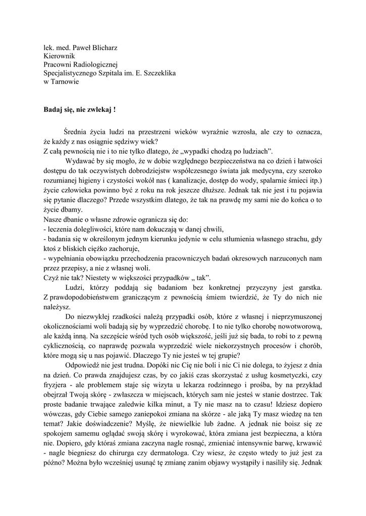 lek. med. Paweł Blicharz Kierownik Pracowni Radiologicznej Specjalistycznego Szpitala im. E. Szczeklika w Tarnowie Badaj się, nie zwlekaj ! Średnia życia ludzi na przestrzeni wieków wyraźnie wzrosła, ale czy to oznacza, że każdy z nas osiągnie sędziwy wiek? Z całą pewnością nie i to nie tylko dlatego, że „wypadki chodzą po ludziach”. Wydawać by się mogło, że w dobie względnego bezpieczeństwa na co dzień i łatwości dostępu do tak oczywistych dobrodziejstw współczesnego świata jak medycyna, czy szeroko rozumianej higieny i czystości wokół nas ( kanalizacje, dostęp do wody, spalarnie śmieci itp.) życie człowieka powinno być z roku na rok jeszcze dłuższe. Jednak tak nie jest i tu pojawia się pytanie dlaczego? Przede wszystkim dlatego, że tak na prawdę my sami nie do końca o to życie dbamy. Nasze dbanie o własne zdrowie ogranicza się do: - leczenia dolegliwości, które nam dokuczają w danej chwili, - badania się w określonym jednym kierunku jedynie w celu stłumienia własnego strachu, gdy ktoś z bliskich ciężko zachoruje, - wypełniania obowiązku przechodzenia pracowniczych badań okresowych narzuconych nam przez przepisy, a nie z własnej woli. Czyż nie tak? Niestety w większości przypadków „ tak”. Ludzi, którzy poddają się badaniom bez konkretnej przyczyny jest garstka. Z prawdopodobieństwem graniczącym z pewnością śmiem twierdzić, że Ty do nich nie należysz. Do niezwykłej rzadkości należą przypadki osób, które z własnej i nieprzymuszonej okolicznościami woli badają się by wyprzedzić chorobę. I to nie tylko chorobę nowotworową, ale każdą inną. Na szczęście wśród tych osób większość, jeśli już się bada, to robi to z pewną cyklicznością, co naprawdę pozwala wyprzedzić wiele niekorzystnych procesów i chorób, które mogą się u nas pojawić. Dlaczego Ty nie jesteś w tej grupie? Odpowiedź nie jest trudna. Dopóki nic Cię nie boli i nic Ci nie dolega, to żyjesz z dnia na dzień. Co prawda znajdujesz czas, by co jakiś czas skorzystać z usług kosmetyczki, czy fryzjera - ale problemem staje się wizyta u lekarza rodzinnego i prośba, by na przykład obejrzał Twoją skórę - zwłaszcza w miejscach, których sam nie jesteś w stanie dostrzec. Tak proste badanie trwające zaledwie kilka minut, a Ty nie masz na to czasu! Idziesz dopiero wówczas, gdy Ciebie samego zaniepokoi zmiana na skórze - ale jaką Ty masz wiedzę na ten temat? Jakie doświadczenie? Myślę, że niewielkie lub żadne. A jednak nie boisz się ze spokojem samemu oglądać swoją skórę i wyrokować, która zmiana jest bezpieczna, a która nie. Dopiero, gdy któraś zmiana zaczyna nagle rosnąć, zmieniać intensywnie barwę, krwawić - nagle biegniesz do chirurga czy dermatologa. Czy wiesz, że często wtedy to już jest za późno? Można było wcześniej usunąć tę zmianę zanim objawy wystąpiły i nasiliły się. Jednak Ty Drogi Czytelniku nie dałeś lekarzowi szansy, bo przychodzisz na wizytę dopiero wtedy, gdy problem jest już zaawansowany. Profilaktyka to wspaniała i ciągle nie doceniana przez pacjentów część medycyny. Niestety Ty utożsamiasz ją głównie z badaniami profilaktycznym w pracy i niczym więcej. Przyjrzyj się temu zagadnieniu. Zastosuj chłodną kalkulację i oceń. Przepisy nakazują okresowo badać pracowników, ale nie w celu wykluczenia wszystkich mogących go spotykać chorób. Badania profilaktyczne są w pewnym uproszczeniu mówiąc ukierunkowane na dwie sfery: - pierwszą związaną z wychwyceniem wśród pracowników osób, które podczas wykonywania określonej pracy mogłyby sobie lub innym wyrządzić krzywdę lub pracodawcy szkodę materialną, - drugą związaną z chorobami zakaźnymi, którymi pracownik mógłby zarazić pozostałych współpracowników. A gdzie reszta problemów zdrowotnych, które mogą Cię spotkać? Co prawda ogólne badanie krwi i moczu może w jakimś momencie zasugerować, że w Twoim organizmie dzieje się coś złego - ale nie od razu i nie zawsze. A częstotliwość badań pracowniczych? Nie wydaje Ci się, że są za rzadkie? Otóż są za rzadkie. Czy na prawdę czujesz się bezpieczny, bo raz na dwa lata masz badania? To nawet samochody przegląda się raz na rok!!! A Ty badasz się raz na dwa i to w ograniczonym zakresie. Pomyśl Drogi Czytelniku - ile z rzeczy, które kupujesz, zepsuje się w ciągu najbliższych dwóch lat. Ile w ciągu roku? A teraz zastanów się - czy Ty nie ulegniesz „zepsuciu” w tym czasie? „Zepsujesz się”, zachorujesz - to niestety bardzo prawdopodobne. Jak nie w ciągu tych dwóch lat między badaniami, to w ciągu kolejnej „dwulatki”. Ze łzami w oczach i przerażeniem na twarzy stają przede mną pacjenci, którym stwierdzam różne choroby mówiąc; „przecież dwa lata temu robiłem/robiłam sobie badania i wszystko było w porządku”. Dwa lata temu!!! Wiesz ile to jest dwa lata??? Przez moment zapala się w człowieku światełko rozwagi, gdy wśród jego bliskich lub w otoczeniu ktoś poważnie zachoruje. Wówczas całe rodziny nagle przychodzą się przebadać. Od razu i bez zbędnej zwłoki, pod wpływem chwili i ogarniającego lęku przed chorobą. I niby dobrze, ale tylko z pozoru. Dlaczego? Dlatego że jest to profilaktyka jednorazowa i tylko w celu wykluczenia dokładnie tej samej choroby, na którą zachorował ktoś bliski. Tacy ludzie bezkrytycznie i bez obaw o inne niebezpieczeństwa starają się wykluczyć tylko i wyłącznie tę jedną konkretną chorobę, np. raka piersi. A co z resztą? A inne ciężkie choroby? A inne narządy naszego organizmu? Gdybyś, chociaż za dwa - trzy lata powtórzył te badania… Oprócz „dbających o swoje zdrowie”, ludzi z dolegliwościami, osób w ramach badań profilaktycznych lub wystraszonych chorobami innych jest jeszcze czwarta grupa „zagraniczniacy”. Kim są? Otóż to tacy pacjenci, którzy „wpadają” do Polski na 10 d