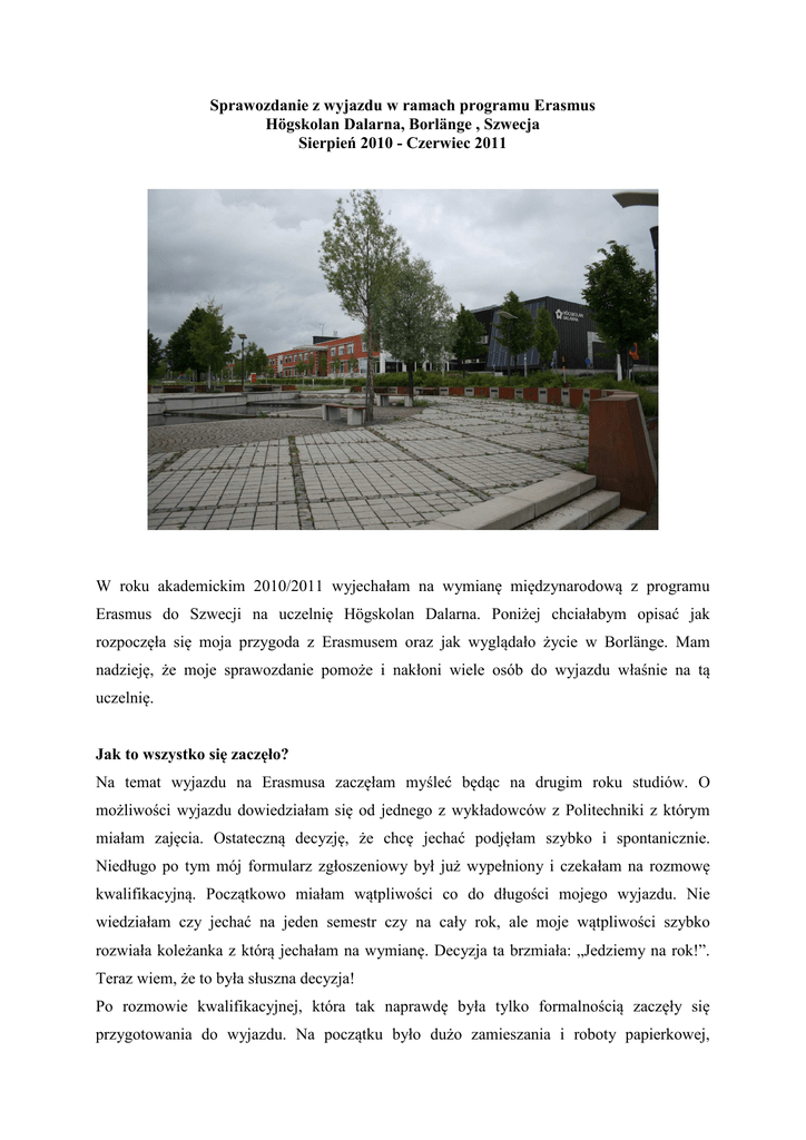 Sprawozdanie z wyjazdu w ramach programu Erasmus Högskolan Dalarna, Borlänge , Szwecja Sierpień 2010 - Czerwiec 2011 W roku akademickim 2010/2011 wyjechałam na wymianę międzynarodową z programu Erasmus do Szwecji na uczelnię Högskolan Dalarna. Poniżej chciałabym opisać jak rozpoczęła się moja przygoda z Erasmusem oraz jak wyglądało życie w Borlänge. Mam nadzieję, że moje sprawozdanie pomoże i nakłoni wiele osób do wyjazdu właśnie na tą uczelnię. Jak to wszystko się zaczęło? Na temat wyjazdu na Erasmusa zaczęłam myśleć będąc na drugim roku studiów. O możliwości wyjazdu dowiedziałam się od jednego z wykładowców z Politechniki z którym miałam zajęcia. Ostateczną decyzję, że chcę jechać podjęłam szybko i spontanicznie. Niedługo po tym mój formularz zgłoszeniowy był już wypełniony i czekałam na rozmowę kwalifikacyjną. Początkowo miałam wątpliwości co do długości mojego wyjazdu. Nie wiedziałam czy jechać na jeden semestr czy na cały rok, ale moje wątpliwości szybko rozwiała koleżanka z którą jechałam na wymianę. Decyzja ta brzmiała: „Jedziemy na rok!”. Teraz wiem, że to była słuszna decyzja! Po rozmowie kwalifikacyjnej, która tak naprawdę była tylko formalnością zaczęły się przygotowania do wyjazdu. Na początku było dużo zamieszania i roboty papierkowej, ponieważ trzeba było wypełnić wszystkie potrzebne do wyjazdu dokumenty, tzn. sporządzić Learning Agreement oraz Recognition Sheet, wyrobić Kartę Ubezpieczenia Zdrowotnego oraz podpisać umowę z uczelnią. Następnie zajęłam się organizacją mieszkania w Szwecji, było to dość łatwe, ponieważ wszystkie potrzebne informacje znalazłam na stronie uczelni partnerskiej. Kiedy dostałam potwierdzenie mieszkania zaczęłam się zastanawiać nad dojazdem. Jak dotrzeć na miejsce? Nie ulega żadnym wątpliwościom, że do Szwecji najlepiej jest się dostać samolotem. Na lotnisko położone około 15 km od Borlänge nie latają bezpośrednio samoloty z Polski, więc trzeba się przesiadać i jest to najdroższa opcja podróży. Samolotem z Polski można dolecieć albo na lotnisko Arlanda (położone około 40 km na północ od Sztokholmu), albo na lotnisko Skavsta (położone około 100 km na południowy zachód od Sztokholmu). Na Arlandę można dolecieć liniami LOT-u, natomiast na Skavstę liniami Wizzair. Ja osobiście korzystałam z LOT-u, ponieważ lotnisko Arlanda jest położone dużo bliżej Borlange i od razu na lotnisku wsiada się w bezpośredni pociąg, który jedzie około 2 godzin do Borlange. Z lotniska Skavsta podróż trwa dużo dłużej ponieważ najpierw trzeba dojechać autobusem do Sztokholmu i następnie przesiąść się w pociąg. Krótko o Borlänge Borlänge jest położone w środkowej części Szwecji, w regionie Dalarna, około 200 km na północ od Sztokholmu. Nie jest to duża miejscowość, ale naprawdę ładna. Wiosną i latem jest tam bardzo dużo zieleni i miejsc do spacerowania, natomiast zimą można wybrać się na narty. Kilkanaście kilometrów od Borlänge znajdują się stoki narciarskie. W sąsiedztwie uczelni znajduję się siłownia oraz centrum handlowe o nazwie „Kupolen”. W mieście jest również basen z Aquaparkiem, kręgielnia i kino. Mieszkanie Jak już wcześniej wspomniałam, ze znalezieniem miejsca do mieszkania nie ma problemu, ponieważ wszystkie informacje na temat zakwaterowania można znaleźć na stronie uczelni. Tunabyggen (firma, która zajmuje się zakwaterowaniem) ma do zaoferowania, albo miejsca w akademiku, albo w mieszkaniu studenckim. Osiedle na którym znajduje się akademik i mieszkania studenckie jest w dobrej lokalizacji jeśli chodzi o dojście na uczelnię (z akademika to około 10 minut, natomiast z mieszkań 10-20 minut). W Szwecji warunki mieszkaniowe są naprawdę dobre. Ja mieszkałam w mieszkaniu studenckim razem z koleżanką z którą wyjechałam na wymianę. W naszym mieszkaniu każda z nas miała swój własny pokój oraz wspólny salon, kuchnię, łazienkę i garderobę. Oprócz tego na klatce schodowej znajdowało się pomieszczenie służące do przechowywania nart i rowerów. Mieszkanie było wyposażone we wszystkie potrzebne meble, natomiast nie było w nim rzeczy takich jak: naczynia, sztućce, pościel. To każdy musiał sobie zapewnić we własnym zakresie. Uczelnia i zajęcia Högskolan Dalarna jest uczelnią, która ma siedziby w dwóch miastach: w Borlänge i Falun. W każdej z tych miejscowości prowadzone są inne zajęcia. Uczelnia w Falun oferuje bardziej humanistyczne i językowe przedmioty, natomiast pozostałe przedmioty prowadzone są w Borlänge. Uczelnia jest bardzo nowoczesna, znajdują się w niej sale komputerowe z których można korzystać całą dobę i z którymi połączone są xera i drukarki. Każdy ze studentów ma swoją własną kartę z kodem pin, dzięki której może o każdej porze wejść na uczelnię. Rok akademicki w Szwecji dzieli się na cztery semestry. Zajęcia zaczynają się pod koniec sierpnia, a kończą na początku czerwca. Jeśli chodzi o ofertę zajęć w języku angielskim to jest naprawdę spora. Ciekawą rzeczą jest to, że każdy przedmiot posiada 7,5 pkt. ECTS, w związku z tym podczas rocznego pobytu na wymianie, aby zdobyć komplet 60 punktów ECTS należy wybrać tylko 8 przedmiotów. Ja osobiście polecam równy podział przedmiotów na semestry, tzn. po dwa przedmioty na każdy semestr ponieważ wtedy zajęć nie ma dużo i bez problemu można się przygotować do egzaminów. Nie ma żadnych ulg dla Erasmusów. Wykładowcy nie zwracają uwagi na to kto jest z Erasmusa, ponieważ większość studentów na uczelni są to studenci międzynarodowi. Żadne ściąganie nie wchodzi w grę, bo Szwedzi są bardzo uczciwi i za oszukiwanie wyciągają poważne konsekwencje. Wydatki Jak wiadomo życie w Szwecji, tak samo jak we wszystkich innych krajach skandynawskich jest dość drogie. Stypendium 