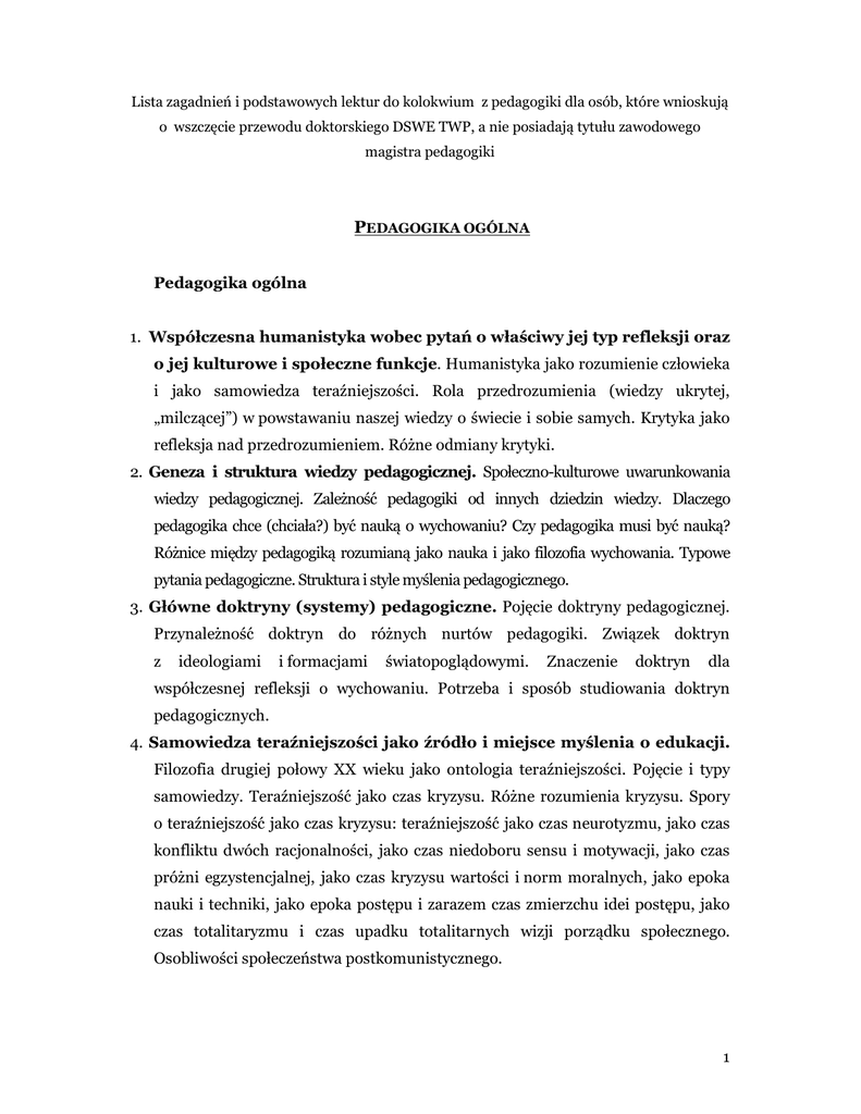 Lista zagadnień i podstawowych lektur do kolokwium z pedagogiki dla osób, które wnioskują o wszczęcie przewodu doktorskiego DSWE TWP, a nie posiadają tytułu zawodowego magistra pedagogiki PEDAGOGIKA OGÓLNA Pedagogika ogólna 1. Współczesna humanistyka wobec pytań o właściwy jej typ refleksji oraz o jej kulturowe i społeczne funkcje. Humanistyka jako rozumienie człowieka i jako samowiedza teraźniejszości. Rola przedrozumienia (wiedzy ukrytej, „milczącej”) w powstawaniu naszej wiedzy o świecie i sobie samych. Krytyka jako refleksja nad przedrozumieniem. Różne odmiany krytyki. 2. Geneza i struktura wiedzy pedagogicznej. Społeczno-kulturowe uwarunkowania wiedzy pedagogicznej. Zależność pedagogiki od innych dziedzin wiedzy. Dlaczego pedagogika chce (chciała?) być nauką o wychowaniu? Czy pedagogika musi być nauką? Różnice między pedagogiką rozumianą jako nauka i jako filozofia wychowania. Typowe pytania pedagogiczne. Struktura i style myślenia pedagogicznego. 3. Główne doktryny (systemy) pedagogiczne. Pojęcie doktryny pedagogicznej. Przynależność doktryn do różnych nurtów pedagogiki. Związek doktryn z ideologiami i formacjami światopoglądowymi. Znaczenie doktryn dla współczesnej refleksji o wychowaniu. Potrzeba i sposób studiowania doktryn pedagogicznych. 4. Samowiedza teraźniejszości jako źródło i miejsce myślenia o edukacji. Filozofia drugiej połowy XX wieku jako ontologia teraźniejszości. Pojęcie i typy samowiedzy. Teraźniejszość jako czas kryzysu. Różne rozumienia kryzysu. Spory o teraźniejszość jako czas kryzysu: teraźniejszość jako czas neurotyzmu, jako czas konfliktu dwóch racjonalności, jako czas niedoboru sensu i motywacji, jako czas próżni egzystencjalnej, jako czas kryzysu wartości i norm moralnych, jako epoka nauki i techniki, jako epoka postępu i zarazem czas zmierzchu idei postępu, jako czas totalitaryzmu i czas upadku totalitarnych wizji porządku społecznego. Osobliwości społeczeństwa postkomunistycznego. 1 5. Wychowanie jako fakt kulturowy określony przez teraźniejszość. Dzisiejsze spory o wychowanie jako świadectwo typowych dla teraźniejszości konfliktów ideologii i światopoglądów. Kryzys edukacyjny w perspektywie sporów o teraźniejszość jako czas kryzysu, czyli - kryzys edukacji jako zjawisko kulturowe wytwarzane przez: kryzys wartości norm moralnych, niedobór sensu i motywacji, próżnię egzystencjalną i utratę klarownych wizji świata, konflikt dwóch racjonalności i dominację racjonalności instrumentalnej nad komunikacyjną, zmierzch idei postępu, upadek totalitarnych wizji świata. Osobliwości kryzysu wychowania w społeczeństwie postkomunistycznym. 6. Różne odmiany myślenia o wychowaniu (różne pedagogiki) jako odpowiedzi na różne diagnozy teraźniejszości. Pedagogika humanistyczna a teraźniejszość rozumiana jako czas neurotyzmu. Pedagogika krytyczna a teraźniejszość rozumiana jako czas świadomości zniewolonej i czas dominacji rozumu instrumentalnego. Różne odmiany pedagogiki konserwatywnej a teraźniejszość rozumiana jako czas kryzysu norm i wartości, czas próżni egzystencjalnej i czas niedoboru sensu i motywacji. Antypedagogika jako przykład autodestrukcji i degeneracji myśli edukacyjnej i jako przykład jej bezsilności wobec różnych odmian kryzysu teraźniejszości. 7. Współczesny dyskurs edukacyjny. Nurt liberalny, konserwatywny, metadyskurs pedagogiczny (wybrane stanowiska pedagogiki krytyczno – hermeneutycznej). Literatura: Edukacja wobec zmiany społecznej, red. J. Brzeziński, L. Witkowski, Poznań Toruń 1994. Ewolucja tożsamości pedagogiki, red. H. Kwiatkowska, Warszawa 1994. Hołówka T., Myślenie potoczne, Warszawa 1988. Wprowadzenie do pedagogiki, Wybór tekstów, red. T. Jaworska, R. Leppert, Kraków 1996 . Kwaśnica R., Dwie racjonalności. Od filozofii sensu ku pedagogice ogólnej, Wrocław 1987. Kwaśnica R., Ku dialogowi w pedagogice, [w]: Prace Pedagogiczne CVIII, Wrocław 1995. 2 Kwaśnica R., Trzy wykładnie hasła „bądź krytyczny”, „Kwartalnik Pedagogiczny” 1989, nr 2. Kwaśnica R., Trzy wykładnie hasła „bądź krytyczny”. Wprowadzenie do rozumienia krytyczności pedagogiki, „Kwartalnik Pedagogiczny”1989, nr 2. Kwaśnica R., Ukryte założenia trzech krytyk. Przyczynek do samowiedzy pedagogii przejścia i pogranicza, [w:] Ku pedagogii pogranicza, red. Z. Kwieciński, L. Witkowski, Toruń 1990. Nieobecne dyskursy. cz. I, red. Z. Kwieciński, Toruń 1991 i wszystkie pozostałe części O kryzysie. Rozmowy w Castel Gandolfo 1985, t. II, red. K. Michalski, Warszawa 1990. Odmiany myślenia o edukacji, red. J. Rutkowiak, Kraków 1995. Pedagogika ogólna. Tradycja - teraźniejszość - nowe wyzwania, red. T. HejnickaBezwińska, Bydgoszcz 1995. Racjonalność współczesności, red. H. Kozakiewicz, E. Mokrzycki, M. J. Siemek, Warszawa 1992. Sośnicki K., Rozwój pedagogiki zachodniej na przełomie XIX i XX wieku, Warszawa 1967. Spory o edukację. Dylematy i kontrowersje we współczesnych pedagogiach, red. Z. Kwieciński, L. Witkowski, Warszawa 1993. Śliwerski B., Współczesne teorie i nurty wychowania. Kraków 1998. Znak 1985, nr 5 (cześć I, poświęcona kryzysowi nauki). Pedagogika, t. I - II, red. Z. Kwieciński, B. Śliwerski, Warszawa 2005. HISTORIA WYCHOWANIA 1. Grecka paideia w okresie helleńskim. 2. Systemy wychowawcze Sparty i Aten. 3. Koncepcje pedagogiczne Sokratesa, Platona i Arystotelesa. 4. Teoretycy wychowania w starożytnym Rzymie: Seneka Młodszy, Kwintylian, Plutarch z Cheronei. 5. Chrześcijaństwo a dorobek myśli pedagogicznej i szkolnictwa starożytności. 6. Powstanie najstarszych europejskich uniwersytetów. 3 7. Ideał stanu rycerskiego w średniowieczu i wychowanie rycerskie. 8. Pedagogika Erazma z Rotterdamu i Ludwika Vivesa. 9. Wpływ reformacji na wychowanie i szkolnictwo. 10. Szkolnictwo jezuickie w Polsce w okresie staropolskim. 11. Życie i myśl J.A. Kome