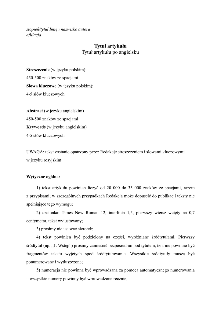 stopień/tytuł Imię i nazwisko autora afiliacja Tytuł artykułu Tytuł artykułu po angielsku Streszczenie (w języku polskim): 450-500 znaków ze spacjami Słowa kluczowe (w języku polskim): 4-5 słów kluczowych Abstract (w języku angielskim) 450-500 znaków ze spacjami Keywords (w języku angielskim) 4-5 słów kluczowych UWAGA: tekst zostanie opatrzony przez Redakcję streszczeniem i słowami kluczowymi w języku rosyjskim Wytyczne ogólne: 1) tekst artykułu powinien liczyć od 20 000 do 35 000 znaków ze spacjami, razem z przypisami; w szczególnych przypadkach Redakcja może dopuścić do publikacji teksty nie spełniające tego wymogu; 2) czcionka: Times New Roman 12, interlinia 1,5, pierwszy wiersz wcięty na 0,7 centymetra, tekst wyjustowany; 3) prosimy nie usuwać sierotek; 4) tekst powinien być podzielony na części, wyróżniane śródtytułami. Pierwszy śródtytuł (np. „1. Wstęp”) prosimy zamieścić bezpośrednio pod tytułem, tzn. nie powinno być fragmentów tekstu wyjętych spod śródtytułowania. Wszystkie śródtytuły muszą być ponumerowane i wytłuszczone; 5) numeracja nie powinna być wprowadzana za pomocą automatycznego numerowania – wszystkie numery powinny być wprowadzone ręcznie; 6) należy stosować wyłącznie przypisy dolne (Times New Roman 10, interlinia 1,0). Zasady konstrukcji przypisów: a) książki – Z. Ofiarski, Prawo finansowe, Warszawa 2010, s. 27; b) książki pisane we współautorstwie – B. Rakoczy (w:) B. Rakoczy, R. Stec, A. Woźniak, Prawo łowieckie. Komentarz, Warszawa 2014, s. 484. Jeżeli określenie, kto napisał daną część pracy, jest niemożliwe, prosimy o zastosowanie wzoru jak dla książki pisanej przez jednego autora. c) artykuły w pracy zbiorowej – G. Radecki, Odpowiednie stosowanie przepisów o dzierżawie do użytkowania górniczego (w:) G. Dobrowolski, G. Radecki (red.), Prawna regulacja geologii i górnictwa w Polsce, Czechach i na Słowacji. Wybrane zagadnienia, Katowice 2014, s. 201. d) artykuły z czasopism – J. Pokrzywniak, Obrót paliwem gazowym w punkcie wirtualnym – analiza cywilnoprawna, „Przegląd Ustawodawstwa Gospodarczego” 2014, nr 3, s. 11. e) akty prawne – Ustawa z dnia 10 lipca 2008 r. o odpadach wydobywczych (Dz. U. z 2013 r., poz. 1136 ze zm.) 1, ustawa z dnia 19 czerwca 1997 r. o zakazie stosowania ‑ wyrobów zawierających azbest (Dz. U. z 2004 r. Nr 3, poz. 20 ze zm.) 2 ustawa z dnia 3 ‑ lutego 2001 roku o ochronie dziedzictwa Fryderyka Chopina (Dz. U. Nr 16, poz. 168)3. ‑ f) akty prawa wtórnego – Dyrektywa Parlamentu Europejskiego i Rady 2008/98/WE z dnia 19 listopada 2008 r. w sprawie odpadów oraz uchylająca niektóre dyrektywy (Dz. Urz. UE L 312 z 22.11.2008). g) orzeczenia – uchwała SN z dnia 18 grudnia 2014 r., III SZP 3/14, Baza Orzeczeń Sądu Najwyższego. h) źródła internetowe – A. Ogniewska, Energetyka obywatelska do piachu?, http:// csr.forbes.pl/zmiany-w-ustawie-o-oze,artykuly,194592,1,1.html (dostęp na dzień: 20 maja 2015 r.). 7) w przypisach zawsze korzystamy ze skrótu „s.”, nie zaś „str.”; 8) każdy przypis należy zakończyć kropką; 1) Przypis do aktu prawnego z tekstem jednolitym opublikowanym nie wcześniej niż w 2012 roku. 2) Przypis do aktu prawnego z tekstem jednolitym opublikowanym nie później niż w 2011 roku. 3) Przypis do aktu prawnego z publikatorem tekstu pierwotnego ustawy. 9) nazwy czasopism zawsze należy zapisywać w całości i unikać stosowania nawet powszechnie znanych skrótów; 10) publikatory – aktów prawnych i orzeczeń – zawsze wprowadzamy w przypisie, nigdy w samym tekście. Jeśli w tekście pojawia się pełna nazwa ustawy (razem z datą uchwalenia), to w przypisie już jej nie powtarzamy, a jedynie podajemy publikator; 11) zawsze odsyłamy do najnowszych tekstów jednolitych ustaw; 12) do każdego z orzeczeń należy podać stosowny publikator. Jeśli orzeczenie pochodzi z bazy, w której wprowadzono numerację orzeczeń (np. Lex), konieczne jest podanie tego numeru; 13) w przypadku orzeczeń posługujemy się skrótami TK, SN, NSA, WSA (tu z dopiskiem „w Gliwicach” itp.). Nazwy sądów powszechnych zapisujemy w pełnej formie, np. „wyrok Sądu Apelacyjnego w Katowicach”; 14) należy wprowadzać skróty nazw ustaw i konsekwentnie posługiwać się nimi w tekście. Skróty należy wprowadzić w przypisie w sposób następujący: Ustawa z dnia 10 lipca 2008 r. o odpadach wydobywczych (Dz. U. z 2013 r., poz. 1136 ze zm.), dalej: u.od.w. Skróty powinny mieć właśnie taki format – małe litery przedzielone kropkami, bez spacji; 15) jeśli autor artykułu ze źródła internetowego jest nieznany, należy opuścić tę informację i rozpocząć przypis od podania tytułu źródła. Jeśli nie da się określić również tytułu, wystarczy podanie samego adresu z dniem dostępu; 16) w przypadku odwoływania się po raz kolejny do tego samego źródła prosimy o korzystanie ze zwrotu „Ibidem” lub – gdy nie jest to możliwe – z odwołania w skróconej postaci, np. G. Radecki, Odpowiednie stosowanie przepisów…, s. 204; 17) format pliku: DOC, DOCX. Prace powinny zawierać również bibliografię, gromadzącą informacje o wszystkich wykorzystanych źródłach (z wyjątkiem aktów prawnych), z podziałem na: 1) literaturę (książki, artykuły), 2) źródła elektroniczne, 3) czasopisma. Prosimy o alfabetyczne uporządkowanie źródeł w każdej z kategorii. Adresy bibliograficzne powinny mieć strukturę taką, jak przypisy, z tym, że w przypadku adresów zawierających imiona i nazwiska, należy rozpoczynać od nazwisk – np. Radecki G., Odpowiednie stosowanie przepisów o dzierżawie do użytkowania górniczego (w:) G. Dobrowolski, G. Radecki, Prawna regulacja geologii i górnictwa w Polsce, Czechach i na Słowacji. Wybrane zagadnienia, Katowice 2014.