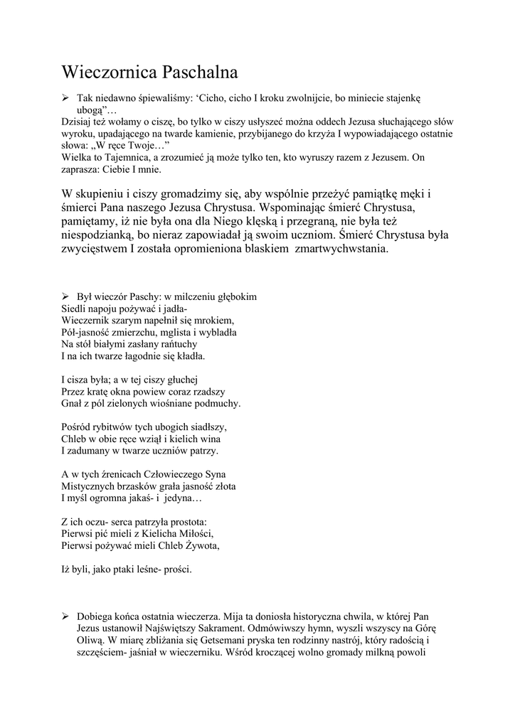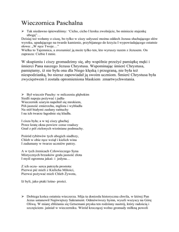 Wieczornica Paschalna Tak niedawno śpiewaliśmy: ‘Cicho, cicho I kroku zwolnijcie, bo miniecie stajenkę ubogą”… Dzisiaj też wołamy o ciszę, bo tylko w ciszy usłyszeć można oddech Jezusa słuchającego słów wyroku, upadającego na twarde kamienie, przybijanego do krzyża I wypowiadającego ostatnie słowa: „W ręce Twoje…” Wielka to Tajemnica, a zrozumieć ją może tylko ten, kto wyruszy razem z Jezusem. On zaprasza: Ciebie I mnie. W skupieniu i ciszy gromadzimy się, aby wspólnie przeżyć pamiątkę męki i śmierci Pana naszego Jezusa Chrystusa. Wspominając śmierć Chrystusa, pamiętamy, iż nie była ona dla Niego klęską i przegraną, nie była też niespodzianką, bo nieraz zapowiadał ją swoim uczniom. Śmierć Chrystusa była zwycięstwem I została opromieniona blaskiem zmartwychwstania. Był wieczór Paschy: w milczeniu głębokim Siedli napoju pożywać i jadłaWieczernik szarym napełnił się mrokiem, Pół-jasność zmierzchu, mglista i wybladła Na stół białymi zasłany rańtuchy I na ich twarze łagodnie się kładła. I cisza była; a w tej ciszy głuchej Przez kratę okna powiew coraz rzadszy Gnał z pól zielonych wiośniane podmuchy. Pośród rybitwów tych ubogich siadłszy, Chleb w obie ręce wziął i kielich wina I zadumany w twarze uczniów patrzy. A w tych źrenicach Człowieczego Syna Mistycznych brzasków grała jasność złota I myśl ogromna jakaś- i jedyna… Z ich oczu- serca patrzyła prostota: Pierwsi pić mieli z Kielicha Miłości, Pierwsi pożywać mieli Chleb Żywota, Iż byli, jako ptaki leśne- prości. Dobiega końca ostatnia wieczerza. Mija ta doniosła historyczna chwila, w której Pan Jezus ustanowił Najświętszy Sakrament. Odmówiwszy hymn, wyszli wszyscy na Górę Oliwą. W miarę zbliżania się Getsemani pryska ten rodzinny nastrój, który radością i szczęściem- jaśniał w wieczerniku. Wśród kroczącej wolno gromady milkną powoli słowa, cichnie głośny śmiech, zanika uśmiech. Jakieś dziwne zaniepokojenie wkrada się w szeregi wędrowców. Nawet uczniowie Jezusa tak niedawno jeszcze weseli, tak pełni życia idą zamyśleni, poważni. Jakby przeczuwali, że oto kroczą obok Chrystusa po raz ostatni. Czują podświadomie tragiczny splot wydarzeń, ową bolesną chwilę, która rozłączy ich z ukochanym Mistrzem. Jakaś bolesna obawa każe im skupić się w okół Chrystusa i jeszcze przez moment cieszyć się Jego bliskością. Wśród zapadających ciemności doszli wszyscy do ogrodu Getsemani. U jego wejścia Pan Jezus zostawił apostołów I zabrawszy ze sobą Piotra, Jakuba i Jana odszedł by się pomodlić. Śpiew: „O Getsemani” „Zostańcie tu i czuwajcie” mówi Jezus do wybranych uczniów a sam oddala się nieco na ustronne miejsce, pada na twarz i zanosi gorącą modlitwę do Ojca. Jakże nam trudno rozpoznać w tym leżącym w prochu ziemi Chrystusa Tego, który jeszcze tak niedawno kroczył po palestyńskiej ziemi spokojny i pełen majestatu. Jeszcze tak niedawno umacniał i pocieszał wszystkich, jednym słowem przywracał dookoła siebie spokój, odwracał od ludzi choroby i klęski, zażegnywał burze i śmierć. A teraz? Teraz Bóg-Człowiek leży w prochu ziemi. Patrzy w pełne grozy oblicze zbliżającego się cierpienia bardziej niż kiedykolwiek nam bliski- boi się. „Ojcze- jeśli być może niechaj odejdzie ode mnie ten kielich”. Kanon: „Zostań tu i ze mną się módl, razem czuwajmy” „Nadeszła godzina. Oto Syn Człowieczy będzie wydany w ręce grzeszników. Pójdźmy. Blisko jest ten, który mnie wyda”. Zbudziwszy śpiących apostołów wychodzi Jezus na spotkanie z tymi, którzy mają go pojmać. Jest spokojny. Żadnym gestem, żadnym słowem nie zdradza tego co za chwilę ma nastąpić. Stanęli na przeciwko siebie. Jezus i Judasz. Narzędzie Boga i narzędzie szatana. Judasz Ja także jestem objawieniem Beze mnie Nie wiedzielibyście tyle O nim i o sobie Zdradzając zdradzasz siebie Do tego potrzebna jest Jakaś imitacja miłości Np. pocałunek. Skrępowanego Chrystusa zawiedli wśród hałaśliwej radości i triumfu do Annasza. Jednak przesłuchanie nie dało upragnionego rezultatu. Była już północ, gdy Chrystus stanął przed wielką radą u Kajfasza. I znów pytania, fałszywe zeznania, sąd. „Czy Ty jesteś Chrystus- Syn Boga żywego?” – „Jam jest”. Faryzeusze odnieśli zwycięstwo- mieli bluźniercę. Teraz już tylko decydująca o życiu lub śmierci rozmowa z Piłatem.- „Czyś Ty jest królem?” „Tyś powiedział. Jam się na to narodził I na to przyszedłem na świat, aby dać świadectwo prawdzie”. „Cóż to jest prawda?!” Oto Człowiek Wizerunek boży Odtrącony, upokorzony, wyśmiany, Wysmagany rózgami, przebrany za błazna Król malowany krwią Wydany na urągowisko Ostatni pośród ostatnich Skazaniec Oto nasz Bóg. śpiew: „Ludu mój ludu cóżem ci uczynił” Stopy- stopy- piachy- kamieńNie prostujesz ramion bo- krzyż … W górę- w dół- słonecznym żarem: Stopy, Błękit, Kamienie, Żwir, Czoło zdarte broczy we krwiZnów do piersi przypadła ziemiaTęcza w kroplach potu znad brwi I kamienie o twarz, kamienie… Idziesz Panie, płonący strzęp, Ponad tobą sztandar błękitny… Krzyż i lazur- kamienne zboczeZiemia pełnią twarz upadła, Ryżym piachem sypnęła w oczy, Ostrym żwirem czoło rozdarła… Wokół pluskot tysiąca stóp, Poświst przekleństw I szum rozgwaru… Wokół pluskot miliarda stóp Tych, co przeszli, i tych , co przejdą, Tych, co znowu wiodą Cię w grób. Któż mi przyjdzie na pomoc? Rozglądam się wokół: „Oglądałem się, kto by współcierpiał ze mną I nie znalazłem”. Jaki jestem samotny, jaki opuszczony! Nikogo nie ma przy mnie, bo tym, którzy mnie miłują, zamarły serca. Ci zaś, którzy mnie nienawidzą, otworzyli usta swoje. „Powstali na mnie mężowie nieprawi, bez miłosierdzia I szukali, aby mnie zabić. I nie przepuścili mi!” nawet na tw