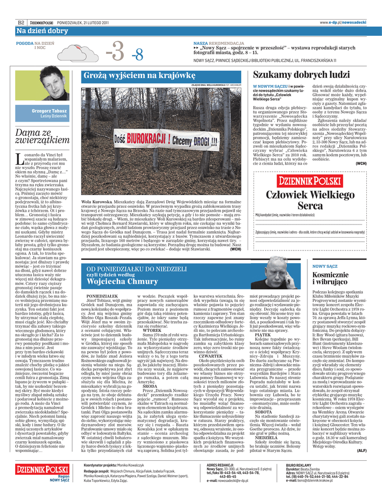 www.e-dp.pl/nowosadecki PONIEDZIAŁEK, 21 LUTEGO 2011 B2 Na dzień dobry POGODA NA DZIEŃ I NOC -3 -8 NASZA REKOMENDACJA ►► „Nowy Sącz – spojrzenie w przeszłość” – wystawa reprodukcji starych fotografii miasta, godz. 8 – 15. NOWY SĄCZ, PIWNICE SĄDECKIEJ BIBLIOTEKI PUBLICZNEJ, UL. FRANCISZKAŃSKA 11 Szukamy dobrych ludzi Grożą wyjściem na krajówkę ZDJĘCIE DNIA. WOLA KUROWSKA FOT. ARCHIWUM Rusza druga edycja plebiscytu organizowanego przez Stowa rzysze nie „Nowo są dec ka Wspólnota”. Przez najbliższe tygodnie w wydaniu nowosądeckim „Dziennika Polskiego”, patronującemu tej niezwykłej promocji, będziemy zamieszczać kupon plebiscytowy. Pozwoli on mieszkańcom Sądecczy zny wybrać „Człowie ka Wielkiego Serca” za 2010 rok. Plebiscyt ma na celu wydobycie z cienia ludzi, którzy na co Grzegorz Tabasz Leśny Dziennik Dama ze zwierzątkiem L eonardo da Vinci był wspaniałym malarzem, ale z przyrodą coś mu nie wyszło. Proszę rzucić okiem na słynną „Damę z…” No właśnie, damę – ale z czym? Sportretowana pani trzyma na ręku zwierzaka. Najczęściej nazywanego łasicą. Później zaczęto mówić o gronostaju, choć niektórzy podejrzewali, iż to albinotyczna fretka lub jej krzyżówka z tchórzem. Ot i problem… Gronostaj i łasica w zimowej szacie są łudząco podobne: to samo cylindryczne ciało, wąska głowa z małymi uszkami. Gdyby mistrz Leonardo raczył uwiecznić zwierzę w całości, sprawa byłaby prosta, gdyż tylko gronostaj ma czarny koniuszek ogona. A tak, to trzeba spekulować. Ja stawiam na gronostaja: jest dłuższy i prawdę mówiąc – jest co trzymać na dłoni, gdyż nawet dobrze utuczona łasica waży nie więcej niż dziesięć dekagramów. Cztery razy cięższy gronostaj świetnie pasuje do damskich rączek i na dodatek dłużej żyje, bo ma nieco wolniejszą przemianę materii niż jego drobniejsza kuzynka. Ten ostatni fakt jest bardzo istotny, gdyż łasica, by utrzymać stałą ciepłotę, musi ciągle jeść. Kto chciałby trzymać dla zabawy takiego wiecznego głodomora, który na okrągło je i kicha? Za to gronostaj ma dłuższe przerwy pomiędzy posiłkami i można z nim psocić. Jest przy tym bardzo ciekawski i w młodym wieku łatwo się oswaja. Tymczasem trudno znaleźć choćby plotkę o jakieś oswojonej łasiczce. Co ważniejsze, ówcześni bogacze cenili futra z gronostaja. Zimą łapano je żywcem w pułapki – tak, by nie uszkodzić bezcennej skóry. Być może kiedyś myśliwy złapał młodą sztukę i podarował kobiecie z możnego rodu. A może da Vinci z premedytacją namalował zwierzaka niedokładnie? Specjalnie. Niech potomni łamią sobie głowę, wymyślają spiski, kody i inne bzdury. O ile mniej uczonych artykułów i dysertacji powstałoby, gdyby zwierzak miał namalowany czarny koniuszek ogonka. O dzisiejszym felietonie nie wspominając… Wola Kurowska. Mieszkańcy dają Zarządowi Dróg Wojewódzkich miesiąc na formalne otwarcie przejazdu przez osuwisko. W przeciwnym wypadku grożą zablokowaniem trasy krajowej z Nowego Sącza na Brzesko. Na razie nad tymczasowym przejazdem pojawił się transparent ostrzegawczy. Mieszkańcy szykują petycję, a gdy i to nie pomoże – mają zrobić blokadę drogi. – Wiem, że mieszkańcy Woli Kurowskiej są bardzo zdesperowani – mówi wójt Chełmca Bernard Stawiarski, który w ubiegłym roku, nie czekając na wyniki badań geologicznych, zrobił ludziom prowizoryczny przejazd przez osuwisko na trasie z Nowego Sącza do Gródka nad Dunajcem. – Trasa jest nadal formalnie zamknięta. Najbardziej poszkodowani są najbiedniejsi, korzystający z busów. Tymczasem z utwardzonego przejazdu, liczącego 160 metrów i będącego w zarządzie gminy, korzystają nawet tiry. – Słyszałem, że badania geologiczne są korzystne. Porządną drogę można tu budować. Nasz przejazd jest ubezpieczony, więc po co zwlekać – dodaje wójt Stawiarski. (WCH) Mój kandydat (imię, nazwisko i teren działalności) ...................................................................................................................................................................... .................................................................................................................................................................. Zgłaszający (imię, nazwisko i adres - dla osób, które chcą wziąć udział w losowaniu nagrody) ...................................................................................................................................................................... ...................................................................................................................................................................... NOWY SĄCZ Kosmicznie i wibrująco czyli tydzień według Wojciecha Chmury PONIEDZIAŁEK Józef Tobiasz, wójt gminy Gródek nad Dunajcem, ma nową koleżankę do współpracy. Jest nią wójcina gminy Mielno Olga Roszak–Pezała. Wójt Józef ma w swoim życio rysie szkol ny dzien nik z ocenami celującymi. Właściwie jest to dziennik budowy impo nu ją cej szko ły w Gródku, której nie sposób nie zauważyć wjeżdżając. To na pewno był jeden z powodów, że ludzie znad Jeziora Rożnowskiego zagłosowali jesienią właśnie na niego. Sądecka perspektywa jest zbyt odległa, by mieć jasny obraz czym nowa wójcina Olga zasłu ży ła się dla Miel na, że mieszkańcy wybrali ją na gospodynię. Istota rzeczy polega na tym, że oboje debiutują w swoich rolach i postanowili potwierdzić czynem, że Gródek i Mielno to dwa bratanki. Pani Olga postanowiła więc zaprosić naszego wójta do siebie, wykorzystując międzynarodowy zlot morsów. Parafowanie umowy miało się odbyć w lodowatym Bałtyku. W ostatniej chwili bohaterowie skrewili i oglądali z plaży harce dwóch tysięcy z lekka tylko przyodzianych ciał w wodzie. Początek współpracy nowych samorządów zapowiada się zac