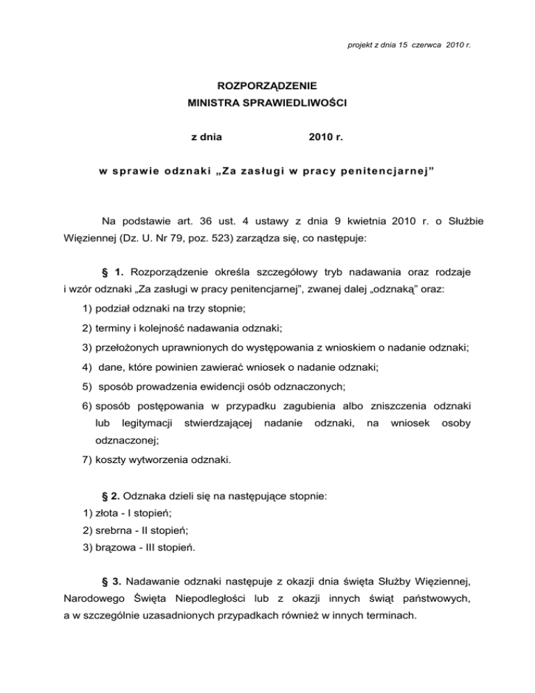 projekt z dnia 15 czerwca 2010 r. ROZPORZĄDZENIE MINISTRA SPRAWIEDLIWOŚCI z dnia 2010 r. w s praw ie odznaki „Za zas ł ugi w pra c y pe ni te nc ja rne j” Na podstawie art. 36 ust. 4 ustawy z dnia 9 kwietnia 2010 r. o Służbie Więziennej (Dz. U. Nr 79, poz. 523) zarządza się, co następuje: § 1. Rozporządzenie określa szczegółowy tryb nadawania oraz rodzaje i wzór odznaki „Za zasługi w pracy penitencjarnej”, zwanej dalej „odznaką” oraz: 1) podział odznaki na trzy stopnie; 2) terminy i kolejność nadawania odznaki; 3) przełożonych uprawnionych do występowania z wnioskiem o nadanie odznaki; 4) dane, które powinien zawierać wniosek o nadanie odznaki; 5) sposób prowadzenia ewidencji osób odznaczonych; 6) sposób postępowania w przypadku zagubienia albo zniszczenia odznaki lub legitymacji stwierdzającej nadanie odznaki, na wniosek osoby odznaczonej; 7) koszty wytworzenia odznaki. § 2. Odznaka dzieli się na następujące stopnie: 1) złota - I stopień; 2) srebrna - II stopień; 3) brązowa - III stopień. § 3. Nadawanie odznaki następuje z okazji dnia święta Służby Więziennej, Narodowego Święta Niepodległości lub z okazji innych świąt państwowych, a w szczególnie uzasadnionych przypadkach również w innych terminach. § 4. 1. Odznaka tego samego stopnia może być nadana tej samej osobie tylko raz. 2. Przy nadawaniu odznaki zachowuje się kolejność w jej stopniach, przy czym: 1) srebrna odznaka może być nadana osobie wyróżnionej brązową odznaką, jeżeli od jej nadania upłynęły co najmniej trzy lata; 2) złota odznaka może być nadana osobie wyróżnionej srebrną odznaką, jeżeli od jej nadania upłynęło co najmniej pięć lat. 3. W szczególnie uzasadnionych przypadkach można odstąpić od zasad określonych w ust. 2. 4. Odznaka może być nadana pośmiertnie. § 5. 1. Odznakę nadaje Minister Sprawiedliwości z własnej inicjatywy albo na wniosek Dyrektora Generalnego Służby Więziennej. 2. Wniosek w sprawie nadania odznaki przedstawia Dyrektorowi Generalnemu Służby Więziennej, za pośrednictwem dyrektora okręgowego Służby Więziennej, kierownik jednostki organizacyjnej Służby Więziennej, w której przedstawiona do wyróżnienia osoba pełni służbę albo pracuje. 3. Dyrektor okręgowy Służby Więziennej może także przedstawić wniosek w sprawie nadania odznaki osobie, o której mowa w ust. 2, z podległej mu jednostki organizacyjnej Służby Więziennej. 4. Dyrektor Generalny Służby Więziennej może z własnej inicjatywy przedstawić Ministrowi Sprawiedliwości wniosek w sprawie nadania odznaki funkcjonariuszom lub pracownikom Służby Więziennej oraz innym osobom. § 6. Wniosek o nadanie odznaki powinien w szczególności zawierać: 1) dane personalne osoby przedstawianej do wyróżnienia; 2) informacje o osiągnięciach uzasadniających nadanie odznaki, o których mowa w art. 36 ust. 2 ustawy o Służbie Więziennej; 3) opinię uprawnionego przełożonego, o którym mowa w § 5 ust. 2-4. § 7. 1. Odznaka ma kształt okrągłego medalu o średnicy 35 mm wykonanego w tombaku odpowiednio patynowanego, posrebrzanego i pozłacanego. Na licowej stronie w otoku znajduje się napis dwoma łukami: „MINISTER SPRAWIEDLIWOŚCI ZASŁUŻONEMU”, a pośrodku, na tle ciemnoczerwonej emalii, wizerunek godła państwowego ustawowego wzoru w kolorze srebrnym. Na odwrotnej stronie odznaki, w środkowej części, na tle stylizowanej odznaki Służby Więziennej, składającej się z pochodni skrzyżowanej z mieczem na tle wieńca z liści dębowych, umieszczony jest w trzech wierszach napis: „PENITENCJA/PRACA, OŚWIATA/KULTURA”. 2. Odznaka jest zawieszona na wstążce o szerokości 35 mm, granatowej, obrzeżonej prążkami szerokości 3 mm czerwono-białym i biało-czerwonym, z dwoma paskami białymi szerokości 4 mm w równych, 7 mm odstępach. 3. Wzór odznaki wraz ze wstążką określa załącznik do rozporządzenia. § 8. 1. Odznakę wraz z legitymacją stwierdzającą jej nadanie, wręcza Minister Sprawiedliwości lub osoba przez niego upoważniona. 2. Odznakę wraz z legitymacją wręcza się w sposób i w okolicznościach zapewniających uroczysty charakter aktu wręczenia. 3. Na legitymacji w sprawie nadania odznaki powinny być zamieszczone: godło Rzeczypospolitej Polskiej, numer i data wystawienia legitymacji, podstawa nadania odznaki, imię i nazwisko osoby wyróżnionej odznaką, imię jej ojca i stopień przyznanej odznaki oraz podpis i pieczęć organu przyznającego odznakę. § 9. Ewidencję osób odznaczonych prowadzi Centralny Zarząd Służby Więziennej. § 10. 1. W razie zgubienia albo zniszczenia odznaki wydaje się, na wniosek osoby odznaczonej, odznakę tego samego stopnia. Ponowne wydanie odznaki następuje za zwrotem kosztów jej wytworzenia. 2. W razie zgubienia albo zniszczenia legitymacji stwierdzającej nadanie odznaki, przepis ust. 1 stosuje się odpowiednio, z tym że ponowne wydanie legitymacji następuje nieodpłatnie. § 11. 1. Osobom, którym nadano brązową lub srebrną odznakę „W Służbie Penitencjarnej” lub odznakę „Za zasługi w pracy penitencjarnej” na podstawie dotychczas obowiązujących przepisów, może być nadana odpowiednio odznaka II lub I stopnia - z uwzględnieniem terminów przewidzianych w § 4 ust. 2. 2. Osoby, którym nadano odznakę, o której mowa w ust. 1, zachowują prawo do jej noszenia. § 12. Rozporządzenie wchodzi w życie po upływie 14 dni od dnia ogłoszenia.1) MINISTER SPRAWIEDLIWOŚCI 1) Rozporządzenie było poprzedzone rozporządzeniem Ministra Sprawiedliwości z dnia 25 marca 2003 r. w sprawie szczegółowego trybu nadawania oraz wzoru odznaki „Za zasługi w pracy penitencjarnej” (Dz. U. Nr 95, poz. 871), które traci moc z dniem wejścia w życie niniejszego rozporządzenia na podstawie art. 272 ustawy z dnia 9 kwietnia 2010 r. o Służbie Więziennej (Dz.U. Nr 79, poz. 523). Załącznik do rozporządzenia Ministra Spraw