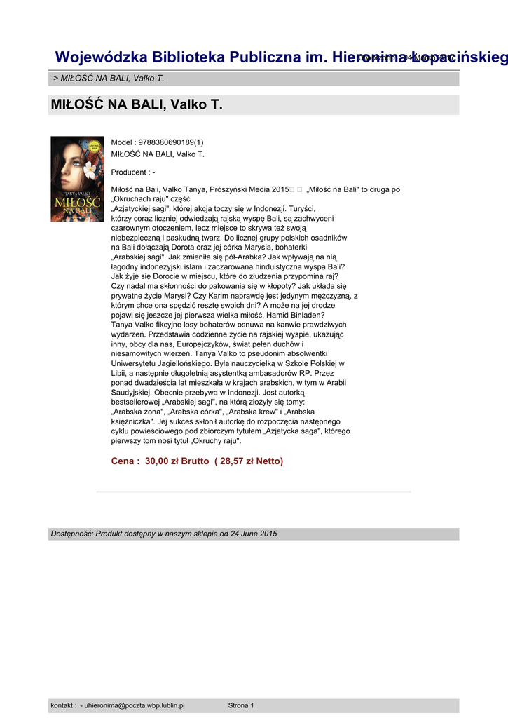 Utworzono : 04Łopacińskieg March 2017 Wojewódzka Biblioteka Publiczna im. Hieronima > MIŁOŚĆ NA BALI, Valko T. MIŁOŚĆ NA BALI, Valko T. Model : 9788380690189(1) MIŁOŚĆ NA BALI, Valko T. Producent : Miłość na Bali, Valko Tanya, Prószyński Media 2015�� „Miłość na Bali" to druga po „Okruchach raju" część „Azjatyckiej sagi", której akcja toczy się w Indonezji. Turyści, którzy coraz liczniej odwiedzają rajską wyspę Bali, są zachwyceni czarownym otoczeniem, lecz miejsce to skrywa też swoją niebezpieczną i paskudną twarz. Do licznej grupy polskich osadników na Bali dołączają Dorota oraz jej córka Marysia, bohaterki „Arabskiej sagi". Jak zmieniła się pół-Arabka? Jak wpływają na nią łagodny indonezyjski islam i zaczarowana hinduistyczna wyspa Bali? Jak żyje się Dorocie w miejscu, które do złudzenia przypomina raj? Czy nadal ma skłonności do pakowania się w kłopoty? Jak układa się prywatne życie Marysi? Czy Karim naprawdę jest jedynym mężczyzną, z którym chce ona spędzić resztę swoich dni? A może na jej drodze pojawi się jeszcze jej pierwsza wielka miłość, Hamid Binladen? Tanya Valko fikcyjne losy bohaterów osnuwa na kanwie prawdziwych wydarzeń. Przedstawia codzienne życie na rajskiej wyspie, ukazując inny, obcy dla nas, Europejczyków, świat pełen duchów i niesamowitych wierzeń. Tanya Valko to pseudonim absolwentki Uniwersytetu Jagiellońskiego. Była nauczycielką w Szkole Polskiej w Libii, a następnie długoletnią asystentką ambasadorów RP. Przez ponad dwadzieścia lat mieszkała w krajach arabskich, w tym w Arabii Saudyjskiej. Obecnie przebywa w Indonezji. Jest autorką bestsellerowej „Arabskiej sagi", na którą złożyły się tomy: „Arabska żona", „Arabska córka", „Arabska krew" i „Arabska księżniczka". Jej sukces skłonił autorkę do rozpoczęcia następnego cyklu powieściowego pod zbiorczym tytułem „Azjatycka saga", którego pierwszy tom nosi tytuł „Okruchy raju". Cena : 30,00 zł Brutto ( 28,57 zł Netto) Dostępność: Produkt dostępny w naszym sklepie od 24 June 2015 kontakt : - [email protected] Strona 1