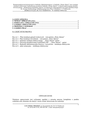 Remont pomieszczeń piwnicznych w budynku Administracyjnym i w budynku „Domu Aktora” oraz wymiana instalacji elektrycznej i hydraulicznej na parterze budynku „Domu Aktora” w ramach realizowanego projektu inwestycyjnego „ Modernizacja dziedzińca, placów wewnętrznych i dróg dojazdowych Teatru Dramatycznego im. Jerzego Szaniawskiego zlokalizowanego przy Placu Teatralnym 1 w Wałbrzychu (działka nr 413,415, obr. Nr 27 Śródmieście) – br. instalacje elektryczne I. CZĘŚĆ OPISOWA 1. TEMAT OPRACOWANIA ................................................................................................ 2 2. PODSTAWA OPRACOWANIA ....................................................................................... 2 3. ZAKRES OPRACOWANIA .............................................................................................. 2 4. PRZEPISY I NOWRMY ..................................................................................................... 2 5. ZAKRES PRAC.................................................................................................................... 2 II. CZĘŚĆ RYSUNKOWA Rys nr 1 – Plan instalacji gniazd wtykowych – rzut parteru „Dom Aktora” Rys nr 2 - Plan instalacji oświetlenia – rzut parteru „Dom Aktora” Rys nr 3 - Schemat zasilania elektrycznego – „Dom Aktora” parter Rys nr 4 - Elewacja projektowanej rozdzielnicy RP – „ Dom Aktora” - parter Rys nr 5 - Budynek administracyjno-biurowy rzut piwnic - instalacja elektryczna Rys nr 6 – plan sytuacyjny – instalacja elektryczna OŚWIADCZENIE Niniejsze opracowanie jest wykonane zgodnie z zawartą umową, kompletne z punktu widzenia celu, któremu ma służyć i może zostać skierowane do realizacji LUK MEDIA PROJEKT, ul. Kasztelańska 60, 58-314 Wałbrzych tel. (074) 666 55 82, 509 950 590 e-mail: [email protected] 1 Remont pomieszczeń piwnicznych w budynku Administracyjnym i w budynku „Domu Aktora” oraz wymiana instalacji elektrycznej i hydraulicznej na parterze budynku „Domu Aktora” w ramach realizowanego projektu inwestycyjnego „ Modernizacja dziedzińca, placów wewnętrznych i dróg dojazdowych Teatru Dramatycznego im. Jerzego Szaniawskiego zlokalizowanego przy Placu Teatralnym 1 w Wałbrzychu (działka nr 413,415, obr. Nr 27 Śródmieście) – br. instalacje elektryczne 1. TEMAT OPRACOWANIA Tematem opracowania jest wykonanie projektu budowlanego pn. Remont pomieszczeń piwnicznych w budynku Administracyjnym i w budynku „Domu Aktora” oraz wymiana instalacji elektrycznej i hydraulicznej na parterze budynku „Domu Aktora” w ramach realizowanego projektu inwestycyjnego „ Modernizacja dziedzińca, placów wewnętrznych i dróg dojazdowych Teatru Dramatycznego im. Jerzego Szaniawskiego zlokalizowanego przy Placu Teatralnym 1 w Wałbrzychu (działka nr 413,415, obr. Nr 27 Śródmieście) branży elektrycznej 2. PODSTAWA OPRACOWANIA • zlecenia Inwestora, • Umowa nr 07/AG/2015 • wytyczne oraz uzgodnienia z Inwestorem, • wizja lokalna w terenie, • dokumentacja fotograficzna sporządzona przez autorów opracowania, • obowiązujące przepisy prawne i normy; 3. ZAKRES OPRACOWANIA Niniejsze opracowanie zawiera część opisową i graficzną projektu br. instalacje elektryczne dla przedmiotowego zadania inwestycyjnego 4. PRZEPISY I NOWRMY [1]. PN-IEC 60364-5-523 „Instalacje elektryczne w obiektach budowlanych. Dobór i montaż wyposażenia elektrycznego. Obciążalność prądowa długotrwała przewodów.”; [2]. PN-EN 12464-1:2004 „Światło i oświetlenie. Oświetlenie miejsc pracy. Część 1: Miejsca pracy we wnętrzach.” [3]. N-SEP-0004 „Elektroenergetyczne i sygnalizacyjne linie kablowe. Projektowanie i budowa”; [4]. PN-EN 1838 „Zastosowanie oświetlenia. Oświetlenie awaryjne.” [5]. Rozporządzenie Ministra Spraw Wewnętrznych i Administracji z 21 kwietnia 2006r. w sprawie ochrony przeciwpożarowej budynków, innych obiektów budowlanych i terenów (Dz.U.Nr.80,poz.563). [6]. Rozporządzenia Ministra Infrastruktury z dn. 12 kwietnia 2002 ( Dz. U. Nr 75 z dn. 15 czerwca 2002 r. Poz. 690 ). 5. ZAKRES PRAC OPIS TECHNICZNY I. Remont wewnętrznej instalacji elektrycznej na poziomie parteru w budynku „Domu Aktora” zlokalizowanego przy ul. Plac Teatralny w Wałbrzychu. 1. Opis stanu istniejącego Istniejąca instalacja elektryczna zabudowana na poziomie parteru w budynku „Domu Aktora” jest wykonana w całości na przewodach aluminiowych i w układzie sieci TN-C. W związku z powyższym istniejącą instalację przewiduje się wymienić na nową i wykonać zgodnie z obowiązującymi przepisami i normami. 2. Zasilanie Zasilania remontowanej instalacji należy wykonać z istniejącej rozdzielnicy piętrowej TP-0 zabudowanej na klatce schodowej na poziomie parteru. W istniejącej rozdzielnicy dla potrzeb zasilania nowych obwodów elektrycznych należy zabudować dodatkowe zabezpieczenia. Istniejąca rozdzielnica TP-0 pozwala na zabudowę dodatkowych zabezpieczeń. 3. Rozdzielnica TP-0 Dla potrzeb zasilanie w energię elektryczną instalacji gniazd wtykowych, oświetlenia w istniejącej rozdzielnicy TP-0 należy zabudować dodatkowe zabezpieczenia zgodnie ze schematem zasilania pokazanym w części rysunkowej projektu. Rozdzielnica posiada 2 LUK MEDIA PROJEKT, ul. Kasztelańska 60, 58-314 Wałbrzych tel. (074) 666 55 82, 509 950 590 e-mail: [email protected] Remont pomieszczeń piwnicznych w budynku Administracyjnym i w budynku „Domu Aktora” oraz wymiana instalacji elektrycznej i hydraulicznej na parterze budynku „Domu Aktora” w ramach realizowanego projektu inwestycyjnego „ Modernizacja dziedzińca, placów wewnętrznych i dróg dojazdowych Teatru Dramatycznego im. Jerzego Szaniawskiego zlokalizowanego przy Placu Teatralnym 1 w Wałbrzychu (działka nr 413,415, obr. Nr 27 Śródmieście) – br. instalacje elektryczne wystarczającą rezerwę pod zabudowę projektowanych zabezpieczeń. Istniejące zabezpieczenia w 