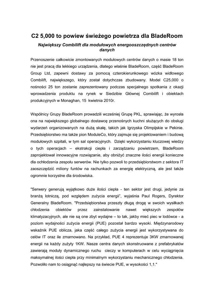 C2 5,000 to powiew świeżego powietrza dla BladeRoom Największy Combilift dla modułowych energooszczędnych centrów danych Przenoszenie całkowicie zmontowanych modułowych centrów danych o masie 18 ton nie jest pracą dla lekkiego urządzenia, dlatego właśnie BladeRoom, część BladeRoom Group Ltd, zapewni dostawy za pomocą czterokierunkowego wózka widłowego Combilift, największego, który został dotychczas zbudowany. Model C25,000 o nośności 25 ton zostanie zaprezentowany podczas specjalnego spotkania z okazji wprowadzenia produktu na rynek w Siedzibie Głównej Combilift i obiektach produkcyjnych w Monaghan, 15 kwietnia 2010r. Wspólnicy Grupy BladeRoom prowadzili wcześniej Grupę PKL, sprawiając, że wyrosła ona na największego globalnego dostawcę przenośnych kuchni służących do obsługi wydarzeń organizowanych na dużą skalę, takich jak Igrzyska Olimpijskie w Pekinie. Przedsiębiorstwo ma także pion ModuleCo, który zajmuje się projektowaniem i budową modułowych szpitali, w tym sal operacyjnych. Dzięki wykorzystaniu kluczowej wiedzy o tych operacjach – ekstrakcji ciepła i zarządzaniu powietrzem, BladeRoom zaprojektował innowacyjne rozwiązanie, aby obniżyć znaczne ilości energii konieczne dla ochłodzenia zespołu serwerów. Nie tylko pozwoli to przedsiębiorstwom z sektora IT zaoszczędzić miliony funtów na rachunkach za energię elektryczną, ale jest także ogromnie korzystne dla środowiska. "Serwery generują wyjątkowo duże ilości ciepła - ten sektor jest drugi, jedynie za branżą lotniczą, pod względem zużycia energii”, wyjaśnia Paul Rogers, Dyrektor Generalny BladeRoom. "Przedsiębiorstwa przeszły długą drogę w swoich wysiłkach chłodzenia obiektów przez zainstalowanie nawet większych zespołów klimatyzacyjnych, ale nie są one zbyt wydajne – to tak, jakby mieć piec w lodówce - a poziom wydajności zużycia energii (PUE) pozostał bardzo wysoki. Międzynarodowy wskaźnik PUE oblicza, jaka część całego zużycia energii jest wykorzystywana do celów IT oraz ile zmarnowano. Na przykład, PUE 4 reprezentuje 3KW zmarnowanej energii na każdy zużyty 1KW. Nasze centra danych skonstruowane z prefabrykatów zawierają moduły dynamicznego ruchu cieczy w komputerach w celu wyciągnięcia maksymalnej ilości ciepła przy minimalnym wykorzystaniu mechanicznego chłodzenia. Pozwoliło nam to osiągnąć najlepszy na świecie PUE, w wysokości 1,1." Korzyści tego systemu są bezsporne – wydajne energetycznie centra danych, kompletnie przygotowane do natychmiastowego stosowania, dostarczone w krótkim czasie, co minimalizuje nakłady kapitałowe klientów w porównaniu z tradycyjnymi obiektami. Kluczową częścią optymalnego i wydajnego procesu produkcyjnego jest wodoszczelny system obsługi w nowym obiekcie produkcyjnym BladeRoom w Cinderford, w hrabstwie Gloucestershire. Po przyjrzeniu się wielu dostępnym na rynku, konwencjonalnym pojazdom do obsługi, oczywistym stało się, że nie będą one w stanie sprostać wyzwaniu łatwo i szybko manewrujących gotowych modułów o wymiarach 14m x 4,2m, w i wokół zakładu. Konsultanci ds. obsługi materiałów BladeRoom, HFT Forklifts Ltd (Hereford) zbadali dla Paula wiele różnych możliwości, w tym napowietrzne dźwigi suwnicowe i bardzo duże wózki z przeciwwagą. Dźwigi okazały się być za mało elastyczne, nie praktyczne do zainstalowania w budynku w kształcie litery L oraz niezwykle kosztowne. Sama wielkość fizyczna wózka widłowego z przeciwwagą zdolnego do przemieszczania ładunków o masie 18t przy wydłużonych środkach ciężkości obciążenia zajęłaby zdecydowanie zbyt dużo przestrzeni w obszarze produkcji. "Obsługa materiałów stanowi kluczową część procesu tworzenia" mówi Paul, "a przy pomocy Kevin Heath, HFT, zdaliśmy sobie sprawę, że jedną z możliwości była o wiele większa wersja wózków Combilift o masie 12t i nośności 14t, które już wtedy były w użyciu. Było one nieocenione dla przenoszenia surowców, takich jak RSJ o długości 14m, oraz podnoszenia zamontowanych zespołów dachowych na zespoły podstawy, dlatego wydawało się rozsądnym, aby przyjrzeć się także czterokierunkowemu zindywidualizowanemu podejściu do obsługi gotowych modułów. ” Wraz z oficjalnym dystrybutorem Combilift w West Midlands, Abex Ltd, a także inżynierami projektu w fabryce w Monaghan, sporządzono specyfikacje dla ogromnego modelu C25,000, który zostanie wysłany do Cinderford po prezentacji. Jego nośność umożliwi BladeRoom łatwe podnoszenie całkowicie zmontowanych modułów do miejsca badania przed dostawą. "Idealnym, z naszego punktu widzenia, rozwiązaniem była maszyna, która mogłaby przenosić moduły w taki sam sposób, jak palety – oczywiście na o wiele większą skalę" mówi Paul, "a dzięki znakomitej obsłudze klienta wszystkich zaangażowanych storn – HFT, Paul Raymond z, Abex i Combilift, jest to dokładnie to, co posiadamy" Mimo wielkości wózka – jego wymiary to 5m na 5m, wysokość kabiny wynosi 3,2m, jest on wyjątkowo zwrotny, co pozwoli BladeRoom bardziej wydajnie zorganizować obszar produkcji. Moduły będą umieszczane w rzędach, aby umożliwić Combilift przemieszczanie się wzdłuż znajdującyCH się między nimi pomostów roboczych, a dźwig o wysokości 4m umożliwi ustawianie modułów w dwóch warstwach. Jakościowe modułowe centra danych typu "plug and play" BladeRoom mogą być dostarczone w przeciągu 18 lub 20 tygodni, w porównaniu do okresów liczonych w miesiącach w przypadku realizacji tradycyjnych struktur. Elastyczność Combilift, którą można określić: "pójdzie gdziekolwiek i zrobi cokolwiek", jak to wyjaśnia Paul, umożliwi przedsiębiorstwu postępować w wymaganym tempie w celu wypełnienia zamówień, a także radzić sobie z wzrostem, którego można się spodziewać z uwagi na coraz większe zainteresowanie ze strony dużych spółek akcyjnych na całym 