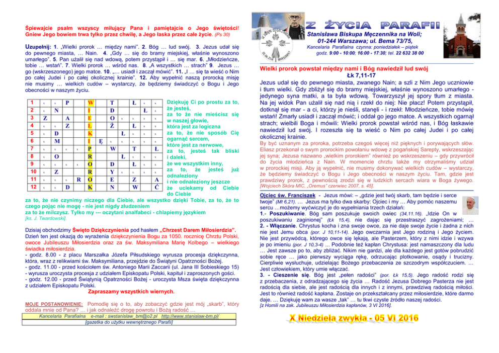 Śpiewajcie psalm wszyscy miłujący Pana i pamiętajcie o Jego świętości! Gniew Jego bowiem trwa tylko przez chwilę, a Jego łaska przez całe życie. (Ps 30) Uzupełnij: 1. „Wielki prorok … między nami”. 2. Bóg … lud swój. 3. Jezus udał się do pewnego miasta, … Nain. 4. „Gdy … się do bramy miejskiej, właśnie wynoszono umarłego”. 5. Pan użalił się nad wdową, potem przystąpił i … się mar. 6. „Młodzieńcze, tobie … wstań”. 7. Wielki prorok … wśród nas. 8. „A wszystkich … strach” 9. Jezus … go (wskrzeszonego) jego matce. 10. „… usiadł i zaczął mówić”. 11. „I … się ta wieść o Nim po całej Judei i po całej okolicznej krainie”. 12. Aby wypełnić naszą prorocką misję nie musimy … wielkich cudów – wystarczy, że będziemy świadczyć o Bogu i Jego obecności w naszym życiu. Dziękuję Ci po prostu za to, że jesteś, x N Ł x za to że nie mieścisz się x x x x E Z A w naszej głowie, x x x Z L Ł x która jest za logiczna za to, że nie sposób Cię x x x D K Ł x ogarnąć sercem, x x x x x M I Ę x które jest za nerwowe, x x x x P W T Ł za to, jesteś tak bliski x x x O R Ł x i daleki, że we wszystkim inny, x x x x x x O D Ł za to, że jesteś już x x x x Z R Y x odnaleziony x x x R O E Z A i nie odnaleziony jeszcze x x D K N W Ć że uciekamy od Ciebie do Ciebie za to, że nie czynimy niczego dla Ciebie, ale wszystko dzięki Tobie, za to, że to czego pojąc nie mogę - nie jest nigdy złudzeniem za to że milczysz. Tylko my --- oczytani analfabeci - chlapiemy językiem 1 2 3 4 5 6 7 8 9 10 11 12 x x P W I T D O Ż Ł x x [ks. J. Twardowski]. Dzisiaj obchodzimy Święto Dziękczynienia pod hasłem „Chrzest Darem Miłosierdzia”. Dzień ten jest okazją do wyrażenia dziękczynienia Bogu za 1050. rocznicę Chrztu Polski, owoce Jubileuszu Miłosierdzia oraz za św. Maksymiliana Marię Kolbego – wielkiego świadka miłosierdzia. - godz. 8.00 - z placu Marszałka Józefa Piłsudskiego wyrusza procesja dziękczynna, która, wraz z relikwiami św. Maksymiliana, przejdzie do Świątyni Opatrzności Bożej. - godz. 11.00 - przed kościołem św. Antoniego Marii Zaccarii (ul. Jana III Sobieskiego 15) - wyrusza uroczysta procesja z udziałem Episkopatu Polski, kapituł i zaproszonych gości. - godz. 12.00 - przed Świątynią Opatrzności Bożej - uroczysta Msza święta dziękczynna z udziałem Episkopatu Polski. Zapraszamy wszystkich wiernych. MOJE POSTANOWIENIE: Pomodlę się o to, aby zobaczyć gdzie jest mój „skarb”, który oddala mnie od Pana? … i jak odnaleźć drogę powrotu i Bożą radość … Kancelaria Parafialna e-mail : [email protected] http://www.stanislaw-bm.pl/ [gazetka do użytku wewnętrznego Parafii] Stanisława Biskupa Męczennika na Woli; 01-244 Warszawa; ul. Bema 73/75, Kancelaria Parafialna czynna: poniedziałek – piątek godz. 9:00 - 10:00; 16:00 - 17:30; tel. 22 632 38 00 Wielki prorok powstał między nami i Bóg nawiedził lud swój Łk 7,11-17 Jezus udał się do pewnego miasta, zwanego Nain; a szli z Nim Jego uczniowie i tłum wielki. Gdy zbliżył się do bramy miejskiej, właśnie wynoszono umarłego jedynego syna matki, a ta była wdową. Towarzyszył jej spory tłum z miasta. Na jej widok Pan użalił się nad nią i rzekł do niej: Nie płacz! Potem przystąpił, dotknął się mar - a ci, którzy je nieśli, stanęli - i rzekł: Młodzieńcze, tobie mówię wstań! Zmarły usiadł i zaczął mówić; i oddał go jego matce. A wszystkich ogarnął strach; wielbili Boga i mówili: Wielki prorok powstał wśród nas, i Bóg łaskawie nawiedził lud swój. I rozeszła się ta wieść o Nim po całej Judei i po całej okolicznej krainie. By być uznanym za proroka, potrzeba czegoś więcej niż pięknych i porywających słów. Eliasz przekonał o swym prorockim powołaniu wdowę z pogańskiej Sarepty, wskrzeszając jej syna; Jezusa nazwano „wielkim prorokiem” również po wskrzeszeniu – gdy przywrócił do życia młodzieńca z Nain. W momencie chrztu także my otrzymaliśmy udział w prorockiej misji. Aby ją wypełnić, nie musimy dokonywać wielkich cudów – wystarczy, że będziemy świadczyć o Bogu i Jego obecności w naszym życiu. Tam, gdzie jest prawdziwy prorok, z pewnością zrodzi się w ludzkich sercach wiara w Boga żywego. [Wojciech Skóra MIC, „Oremus” czerwiec 2007, s. 45]. Ojciec św. Franciszek - Jezus mówi: – „gdzie jest twój skarb, tam będzie i serce twoje” (Mt 6,21). … Jezus ma tylko dwa skarby: Ojciec i my … Aby pomóc naszemu sercu …możemy wyćwiczyć je do wypełniania trzech działań: 1.- Poszukiwanie. Bóg sam poszukuje swoich owiec (34,11.16). „Idzie On w poszukiwaniu zaginionej” (Łk 15,4), nie dając się przestraszyć zagrożeniami; … 2. - Włączanie. Chrystus kocha i zna swoje owce, za nie daje swoje życie i żadna z nich nie jest Jemu obca (por. J 10,11-14). Jego owczarnia jest Jego rodziną i Jego życiem. Nie jest przywódcą, którego owce się lękają, ale Pasterzem, który z nimi idzie i wzywa je po imieniu (por. J 10,3-4) … Podobnie też kapłan Chrystusa: jest namaszczony dla ludu … Jest zawsze po to, aby zbliżać. Nikim nie gardzi, ale dla każdego jest gotów pobrudzić sobie ręce … jako pierwszy wyciąga rękę, odrzucając plotkowanie, osądy i trucizny. Cierpliwie wysłuchuje, udzielając Bożego przebaczenia ze szczodrym współczuciem. … Jest człowiekiem, który umie włączać. 3. - Cieszenie się. Bóg jest „pełen radości” (por. Łk 15,5). Jego radość rodzi się z przebaczenia, z odradzającego się życia … Radość Jezusa Dobrego Pasterza nie jest radością dla siebie, ale jest radością dla innych i z innymi, prawdziwą radością miłości. Jest to również radość kapłana. Zostaje on przekształcany przez miłosierdzie, które darmo daje. … Dziękuję wam za wasze „tak” … tu tkwi czyste źródło naszej radości. [z Homili na zak. Jub