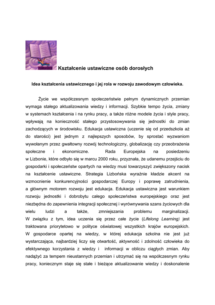 Kształcenie ustawiczne osób dorosłych Idea kształcenia ustawicznego i jej rola w rozwoju zawodowym człowieka. śycie we współczesnym społeczeństwie pełnym dynamicznych przemian wymaga stałego aktualizowania wiedzy i informacji. Szybkie tempo Ŝycia, zmiany w systemach kształcenia i na rynku pracy, a takŜe róŜne modele Ŝycia i style pracy, wpływają na konieczność stałego przystosowywania się jednostki do zmian zachodzących w środowisku. Edukacja ustawiczna (uczenie się od przedszkola aŜ do starości) jest jednym z najlepszych sposobów, by sprostać wyzwaniom wywołanym przez gwałtowny rozwój technologiczny, globalizację czy przeobraŜenia społeczne i ekonomiczne. Rada Europejska na posiedzeniu w Lizbonie, które odbyło się w marcu 2000 roku, przyznała, Ŝe udanemu przejściu do gospodarki i społeczeństw opartych na wiedzy musi towarzyszyć zwiększony nacisk na kształcenie ustawiczne. Strategia Lizbońska wyraźnie kładzie akcent na wzmocnienie konkurencyjności gospodarczej Europy i poprawę zatrudnienia, a głównym motorem rozwoju jest edukacja. Edukacja ustawiczna jest warunkiem rozwoju jednostki i dobrobytu całego społeczeństwa europejskiego oraz jest niezbędna do zapewnienia integracji społecznej i wyrównywania szans Ŝyciowych dla wielu ludzi a takŜe, zmniejszania problemu marginalizacji. W związku z tym, idea uczenia się przez całe Ŝycie (Lifelong Learning) jest traktowana priorytetowo w polityce oświatowej wszystkich krajów europejskich. W gospodarce opartej na wiedzy, w której edukacja szkolna nie jest juŜ wystarczająca, najbardziej liczy się otwartość, aktywność i zdolność człowieka do efektywnego korzystania z wiedzy i informacji w obliczu ciągłych zmian. Aby nadąŜyć za tempem nieustannych przemian i utrzymać się na współczesnym rynku pracy, koniecznym staje się stałe i bieŜące aktualizowanie wiedzy i doskonalenie kompetencji oraz nabywanie nowych umiejętności zawodowych i społecznych w formie kształcenia formalnego, nieformalnego i nieoficjalnego. Oprócz solidnych podstaw, jakie daje kształcenie formalne, odbywające się w placówkach szkolnych i ośrodkach szkoleniowych, które kończy się uzyskaniem uznawanych dyplomów i świadectw, istnieje równolegle kształcenie nieformalne, w postaci zajęć czy usług organizowanych przez róŜne ośrodki czy organizacje obywatelskie (np.: organizacje młodzieŜowe, związki zawodowe czy partie polityczne). NiezaleŜnie od tych dwóch form kształcenia, do rozwoju wiedzy i człowieka umiejętności przyczynia się równieŜ często w sposób nieświadomy kształcenie nieoficjalne, czyli informacje i umiejętności pochodzące z róŜnych źródeł (w rodzinie, w przedsiębiorstwie, na drodze samokształcenia). Idea kształcenia ustawicznego zakłada właśnie komplementarność tych trzech form uczenia się, zwracając uwagę na to, Ŝe powinien to być proces całoŜyciowy, trwający od wczesnego dzieciństwa (faza przedszkolna) aŜ do starości (faza emerytalna), dostępny dla wszystkich obywateli w równym stopniu. Oczekiwania odnośnie kwalifikacji pracowników na współczesnym rynku pracy. W gospodarce opartej na wiedzy, utrzymanie przewagi konkurencyjnej zaleŜy głównie od rozwoju i pełnego wykorzystania zasobów ludzkich. Oczekiwania pracodawców wobec pracowników są coraz większe, a znalezienie satysfakcjonującego zatrudnienia na współczesnym rynku pracy zaleŜy od posiadania przez potencjalnych pracowników aktualnej wiedzy merytorycznej i kompetencji. Brak odpowiednich kwalifikacji zwiększa ryzyko bezrobocia oraz wpływa na długość czasu poszukiwania pracy. PoniewaŜ pracodawcy poszukują wysoko wykwalifikowanej kadry a konkurencja na rynku pracy jest ogromna, coraz większy teŜ staje się popyt na naukę potwierdzoną oficjalnym świadectwem, dyplomem czy certyfikatem. Nie bez znaczenia są równieŜ umiejętności „miękkie” oraz zdolności do poszukiwania i utrzymania pracy. W związku z powyŜszym, bez nastawienia na rozwój i stałe podwyŜszanie kwalifikacji oraz doskonalenia i nabywania nowych umiejętności zawodowych i społecznych, cięŜko będzie sprostać ostrej rywalizacji na dzisiejszym rynku pracy. Istotny staje się tu nie tylko dostęp do nowoczesnych technologii informacyjnych i telekomunikacyjnych oraz umiejętności związane z obsługą komputera i Internetu, ale takŜe dyspozycyjność i mobilność, oznaczająca gotowość do przemieszczania w poszukiwaniu zatrudnienia. Obecnie, najbardziej poszukiwani kandydaci to ci, którzy oprócz wiedzy merytorycznej i biegłej znajomości języków obcych posiadają ponadto umiejętności miękkie, jak na przykład wysokie umiejętności komunikacyjne, samodzielność, umiejętność organizacji pracy czy umiejętność współpracy w zespole. Sukces odniosą ci pracownicy, którzy nastawieni są na podnoszenie kwalifikacji, wykazują się inicjatywą, determinacją w dąŜeniu do celu, aktywnością i kreatywnością w poszukiwaniu zatrudnienia. Osoby, które priorytetowo traktują swój własny rozwój zawodowy i inwestują w swoją przyszłość, niezaleŜnie od wieku, poradzą sobie w sytuacji ogromnej konkurencyjności na dzisiejszym rynku pracy. Dla wielu pracodawców liczy się przede wszystkim potencjał danego kandydata, jego zapał do nauki i pracy, zorientowanie na zdobywanie nowej wiedzy, oraz elastyczność czyli, umiejętność i wymagań, adaptacji jakie stawia do stale rynek pracy, zmieniających a co za się tym idzie warunków umiejętność przekwalifikowania się w razie potrzeby. Wiedza, informacje szybko się jednak dziś dezaktualizują, dlatego współczesny pracownik, niezaleŜnie od zajmowanego stanowiska i specjalności zawodowej, czy jest właścicielem firmy czy teŜ pracuje na etacie, musi być otwarty na wyzwania i zmiany, z jakimi muszą się zmierzyć firmy czy organizacje w gospodarce rynkowej. Jak widać umiejętność szybkie