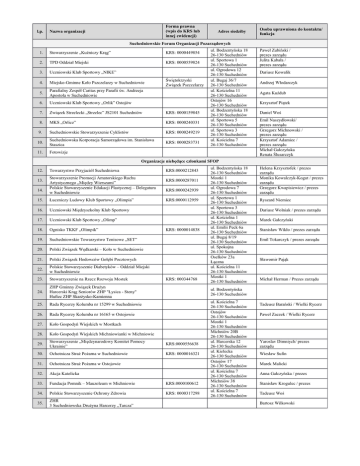 l.p. Forma prawna (wpis do KRS lub innej ewidencji) Nazwa organizacji Adres siedziby Osoba uprawniona do kontaktu/ funkcja Suchedniowskie Forum Organizacji Pozarządowych 1. Stowarzyszenie „Kuźniczy Krąg” KRS: 0000449854 2. TPD Oddział Miejski KRS: 0000559824 3. Uczniowski Klub Sportowy „NIKE” Świętokrzyski Związek Pszczelarzy 4. Miejsko-Gminne Koło Pszczelarzy w Suchedniowie 5. Parafialny Zespół Caritas przy Parafii św. Andrzeja Apostoła w Suchedniowie 6. Uczniowski Klub Sportowy „Orlik” Ostojów 7. Związek Strzelecki „Strzelec” JS2101 Suchedniów KRS: 0000159845 8. MKS „Orlicz” KRS: 0000240331 9. Suchedniowskie Stowarzyszenie Cyklistów KRS: 0000249219 10. Suchedniowska Korporacja Samorządowa im. Stanisława Staszica KRS: 0000283731 11. Fotowizje ul. Bodzentyńska 18 26-130 Suchedniów ul. Sportowa 1 26-130 Suchedniów ul. Ogrodowa 12 26-130 Suchedniów ul. Bugaj 36/7 26-130 Suchedniów ul. Kościelna 11 26-130 Suchedniów Ostojów 16 26-130 Suchedniów ul. Bodzentyńska 18 26-130 Suchedniów ul. Sportowa 5 26-130 Suchedniów ul. Sportowa 3 26-130 Suchedniów ul. Kościelna 7 26-130 Suchedniów Paweł Zubiński / prezes zarządu Julita Kabała / prezes zarządu Dariusz Kowalik Andrzej Włodarczyk Agata Kuźdub Krzysztof Piątek Daniel Woś Emil Naszydłowski/ prezes zarządu Grzegorz Michnowski / prezes zarządu Krzysztof Adamiec / prezes zarządu Michał Gałczyńska Renata Ślusarczyk Organizacje niebędące członkami SFOP 12. 13. 14. Towarzystwo Przyjaciół Suchedniowa Stowarzyszenie Promocji Amatorskiego Ruchu Artystycznego „Między Wierszami” Polskie Stowarzyszenie Edukacji Plastycznej – Delegatura w Suchedniowie KRS:0000212843 KRS:0000287011 KRS:0000242939 15. Łuczniczy Ludowy Klub Sportowy „Olimpia” KRS:0000112959 16. Uczniowski Międzyszkolny Klub Sportowy 17. Uczniowski Klub Sportowy „Olimp” 18. Ognisko TKKF „Olimpik” 19. Suchedniowskie Towarzystwo Tenisowe „SET” 20. Polski Związek Wędkarski – Koło w Suchedniowie 21. Polski Związek Hodowców Gołębi Pocztowych 22. Polskie Stowarzyszenie Diabetyków – Oddział Miejski w Suchedniowie 23. Stowarzyszenie na Rzecz Rozwoju Mostek 24. ZHP Gminny Związek Drużyn Harcerski Krąg Seniorów ZHP "Łysica - Steny" Hufiec ZHP Skarżysko-Kamienna 25. Rada Rycerzy Kolumba nr 15299 w Suchedniowie 26. Rada Rycerzy Kolumba nr 16165 w Ostojowie 27. Koło Gospodyń Wiejskich w Mostkach 28. Koło Gospodyń Wiejskich Michniowianki w Michniowie 29. Stowarzyszenie „Międzynarodowy Komitet Pomocy Ukrainie” KRS:0000556638 30. Ochotnicza Straż Pożarna w Suchedniowie KRS: 0000016321 31. Ochotnicza Straż Pożarna w Ostojowie 32. Akcja Katolicka 33. Fundacja Pomnik – Mauzoleum w Michniowie KRS:0000100612 34. Polskie Stowarzyszenie Ochrony Zdrowia KRS: 0000317298 35. ZHR 3 Suchedniowska Drużyna Harcerzy „Tarcza” KRS: 0000014838 KRS: 000344768 ul. Bodzentyńska 18 26-130 Suchedniów Mostki 1 26-130 Suchedniów ul. Ogrodowa 7 26-130 Suchedniów ul. Sportowa 1 26-130 Suchedniów ul. Sportowa 3 26-130 Suchedniów ul. Kościelna 1 26-130 Suchedniów ul. Emilii Peck 6a 26-130 Suchedniów ul. Bugaj 8/19 26-130 Suchedniów ul. Spokojna 26-130 Suchedniów Osełków 23a Łączna ul. Kościelna 11 26-130 Suchedniów Mostki 1 26-130 Suchedniów Helena Krzysztofek / prezes zarządu Monika Kowalczyk-Kogut / prezes zarządu Grzegorz Kwapisiewicz / prezes zarządu Ryszard Niemiec Dariusz Wolniak / prezes zarządu Marek Gałczyński Stanisław Wikło / prezes zarządu Emil Tokarczyk / prezes zarządu Sławomir Pająk Michał Herman / Prezes zarządu ul. Bodzentyńska 26-130 Suchedniów ul. Kościelna 7 26-130 Suchedniów Ostojów 26-130 Suchedniów Mostki 1 26-130 Suchedniów Michniów 20B 26-130 Suchedniów ul. Harcerska 12 26-130 Suchedniów ul. Kielecka 26-130 Suchedniów Ostojów 17 26-130 Suchedniów ul. Kościelna 7 26-130 Suchedniów Michniów 38 26-130 Suchedniów ul. Kościelna 7 26-130 Suchedniów Tadeusz Barański / Wielki Rycerz Paweł Zaczek / Wielki Rycerz Yaroslav Dimniych/ prezes zarządu Wiesław Sufin Marek Malicki Anna Gałczyńska / prezes Stanisław Krogulec / prezes Tadeusz Woś Bartosz Wilkowski