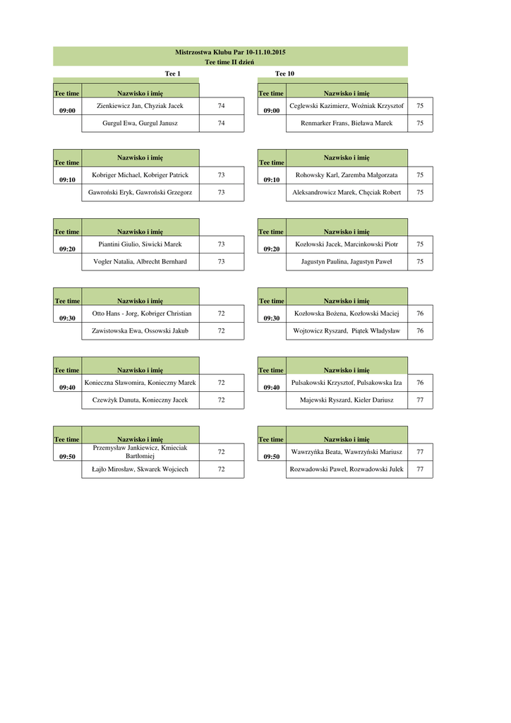 Mistrzostwa Klubu Par 10-11.10.2015 Tee time II dzień Tee 1 Tee 10 Tee time Nazwisko i imię 09:00 Zienkiewicz Jan, Chyziak Jacek 74 Gurgul Ewa, Gurgul Janusz 74 Tee time 09:10 Nazwisko i imię Kobriger Michael, Kobriger Patrick 73 Gawroński Eryk, Gawroński Grzegorz 73 Nazwisko i imię 09:20 Piantini Giulio, Siwicki Marek 73 Vogler Natalia, Albrecht Bernhard 73 Tee time Nazwisko i imię 09:30 Otto Hans - Jorg, Kobriger Christian 72 Zawistowska Ewa, Ossowski Jakub 72 Tee time Nazwisko i imię 09:40 Konieczna Sławomira, Konieczny Marek 72 Czewżyk Danuta, Konieczny Jacek 72 09:50 Nazwisko i imię Przemysław Jankiewicz, Kmieciak Bartłomiej Łajło Mirosław, Skwarek Wojciech Nazwisko i imię 09:00 Ceglewski Kazimierz, Woźniak Krzysztof 75 Renmarker Frans, Bieława Marek 75 Tee time Tee time Tee time Tee time 72 72 09:10 Nazwisko i imię Rohowsky Karl, Zaremba Małgorzata 75 Aleksandrowicz Marek, Chęciak Robert 75 Tee time Nazwisko i imię 09:20 Kozłowski Jacek, Marcinkowski Piotr 75 Jagustyn Paulina, Jagustyn Paweł 75 Tee time Nazwisko i imię 09:30 Kozłowska Bożena, Kozłowski Maciej 76 Wojtowicz Ryszard, Piątek Władysław 76 Tee time Nazwisko i imię 09:40 Pulsakowski Krzysztof, Pulsakowska Iza 76 Majewski Ryszard, Kieler Dariusz 77 Tee time Nazwisko i imię 09:50 Wawrzyńka Beata, Wawrzyński Mariusz 77 Rozwadowski Paweł, Rozwadowski Julek 77 Tee time Nazwisko i imię 10:00 Łęcka Antonina, Łęcki Andrzej 72 Libera Mariola, Madoń Dorota 72 Tee time Nazwisko i imię 10:10 Torta Maria, Torta Nello 71 Sowa Joanna, Sowa Mariusz 71 Tee time Nazwisko i imię 10:20 Ramos Grzegorz, Juchacz Maciej 71 Hanysz Mariusz, Matysiak Marek 71 Tee time Nazwisko i imię 10:30 Juhong Kim, Szramowski Jerzy 70 Drzewiecki Sebastian, Mroziński Artur 70 Tee time Nazwisko i imię 10:40 Polguj Maciej Piechowski Piotr Werner Sabian Budziński Harry 70 Tee time Nazwisko i imię 10:00 Pawłowska Renata, Pawłowski Krzysztof 77 Duczmal Marianna, Angeli Federico 77 Tee time Nazwisko i imię 10:10 Christensen Kim, McMurtrie Dean 78 Skoczyńska Alicja, Zimniak Anna 78 Tee time Nazwisko i imię 10:20 Staniul Bogusław, Rabiko Robert 78 Hałas Przemysław, Werens Józef 79 Tee time Nazwisko i imię 10:30 Jakubowska Agnieszka, Kaczarek Robert 79 Schuhl Andre, Pedersen Jan 80 Tee time Nazwisko i imię 10:40 Burdalski Krzysztof, Uchański Jacek 80 Jesiołkiewicz Anna, Krzyżaniak Jacek 80 70 Tee time Nazwisko i imię 10:50 Kaczmarek Robert, Malinowski Marcin 70 Czernicki Filip, Łodyga Dariusz 69 Tee time Nazwisko i imię 11:00 Sęk Ireneusz, Kasprowicz Michał 67 Herzberg Mayra, Fritsche Andreas 67 Tee time Nazwisko i imię 11:10 Walther Niels, Mehling Thomas 66 Sierewicz Tadeusz, Popin Arkadiusz 64 Tee time Nazwisko i imię 10:50 Kozłowska Mirosława, Kajkowski Piotr 82 Wierzbicki Dariusz, Jereminowicz Alan 83 Tee time Nazwisko i imię 11:00 Dudek Małgorzata, Dudek Adrian 84