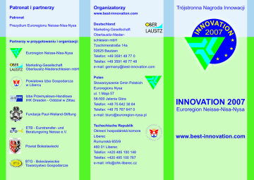Patronat i partnerzy Organizatorzy Trójstronna Nagroda Innowacji www.best-innovation.com Patronat Prezydium Euroregionu Neisse-Nisa-Nysa Partnerzy w przygotowaniu i organizacji: Euroregion Neisse-Nisa-Nysa Marketing-Gesellschaft Oberlausitz-Niederschlesien mbH Powiatowa Izba Gospodarcza w Libercu Izba Przemysłowo-Handlowa IHK Dresden - Oddział w Zittau Fundacja Paul-Weiland-Stiftung ETB - Eurotransfer- und Beratungsring Neisse e.V. Powiat Boleslawiecki BTG - Boleslawieckie Towarzystwo Gospodarcze Deutschland Marketing-Gesellschaft Oberlausitz-Niederschlesien mbH Tzschirnerstraße 14a 02625 Bautzen Telefon: +49 3591 48 77 0 Telefax: +49 3591 48 77 48 e-mail: [email protected] Polen Stowarzyszenie Gmin Polskich Euroregionu Nysa ul. 1 Maja 57 58-500 Jelenia Góra Telefon: +48 75 642 38 84 Telefax: +48 75 767 647 0 e-mail: [email protected] Tschechische Republik Okresní hospodárská komora Liberec Rumunská 655/9 460 01 Liberec Telefon: +420 485 100 148 Telefax: +420 485 100 767 e-mail: [email protected] 2007 INNOVATION 2007 Euroregion Neisse-Nisa-Nysa www.best-innovation.com Nagroda INNOVATION 2007 Warunki uczestnictwa Komisja ekspercka W roku 2007 Euroregion Neisse-Nysa-Nisa przyznaje po raz drugi trójstronną Nagrodę INNOVATION 2007 w kategoriach: „Najlepsza Innowacja” (Best Innovation), „Najlepsza współpraca transgraniczna” (Best Partnership) i „Najlepsza współpraca publiczno - prywatna” (Best Pri vate Public Partnership). W kategorii „Best Innovation” będą wyróżnione nowe produkty i technologie, decydujące o sukcesie gospodarczym na rynku i świadczące o postępie gospodarczym. W kategorii „Best Partnership” nagradza się transgraniczne powiązania kooperacyjne, odnoszące sukcesy przy opracowywaniu nowych produktów i technologii. W kategorii „Best Private Public Partnership” będą nagrodzone najlepsze przedsięwzięcia i współpraca gmin z przedsiębiorcami i firmami tworzącymi nowe miejsca pracy, sprzyjające rozwojowi istniejących firm i tworzące najlepsze warunki do inwestowania w regionie oraz prowadzące dzi ałalność na rzecz ochrony środowiska naturalnego. Wyróżnienie nagrodą „INNOVATION 2007” powinno stanowić drogę do publicznego uznania sukcesów gospodarczych małych i średnich przedsiębiorstw oraz Gmin. O nagrodę w konkursie INNOVATION 2007 w kategoriach BEST INNOVATION i BEST PARTNERSHIP mogą się ubiegać małe i średnie przedsiębiorstwa¹ mające swoje siedziby na terenie Euroregionu Neisse-NisaNysa, a w kategorii BEST PRIVATE PUBLIC PARTNERSHIP także inne instytucje publiczne. Zgłoszenia rozpatrywane będą przez komisję składającą się z niemieckich, polskich i czeskich ekspertów. W skład powyższych komisji wchodzą: • przedstawiciele wyższych uczelni, • organizacje gospodarcze, • władze samorządowe, • instytucje transferu technologii, • instytucje doradcze, • przedstawiciele z Euroregionu Neisse-Nisa-Nysa. Komisja Ekspercka wyłoni laureatów do Nagrody w poszczególnych kategoriach. Warunkiem przyjęcia zgłoszenia będzie: • Formularz zgłoszenia należy w całości wypełnić i nadesłać w formie pisemnej i elektronicznej; • załączenie materiałów wymienionych w formularzu zgłoszenia (zgłoszenie ma obejmować maks. 6 stron (formatu A4) z załącznikami włącznie). Zgłoszenia można nadsyłać do partnerów kontaktowych do 30 września 2007 r. Nagrody W kategoriach „Best Innovation” (BI), „Best Partnership” (BP) i „Best Private Public Partnership” (BPPP) przyznane zostaną następujące nagrody: BI I nagroda: 1.100 € II nagroda: 700 € III nagroda: 400 € Wręczenie nagród Uroczystość wręczenia nagród laureatom odbędzie się w dniu 30 listopada 2007 r. 1 Obowiązują aktualne kryteria UE dla małych i średnich przedsiębiorstw (MŚP). BP 900 € 500 € 300 € BPPP 800 € 500 € 300 € Ponadto laureatom i nominatom zostaną wręczone dyplomy i znak logo. Laureaci w ramach marketingu przedsiębiorstwa mogą stosować markę „INNOVATION 2007 Euroregion Neisse-Nysa-Nisa”. Będą również promowani w środkach masowego przekazu w ramach public relations Nagrody INNOVATION 2007.