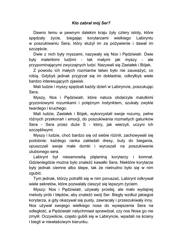 Kto zabrał mój Ser? Dawno temu w pewnym dalekim kraju żyły cztery istoty, które spędzały życie, biegając korytarzami wielkiego Labiryntu w poszukiwaniu Sera, który służył im za pożywienie i dawał im szczęście. Dwie z nich były myszami, nazywały się Nos i Pędziwiatr. Dwie były maleńkimi ludźmi - tak małymi jak myszy - ale przypominającymi zwyczajnych ludzi. Nazywali się Zastałek i Bójek. Z powodu ich małych rozmiarów łatwo było nie zauważyć, co robią. Gdybyś jednak przyjrzał się im dokładnie, odkryłbyś wiele bardzo interesujących zjawisk. Mali ludzie i myszy spędzali każdy dzień w Labiryncie, poszukując Sera. Myszy, Nos i Pędziwiatr, które natura obdarzyła malutkimi gryzoniowymi rozumkami i potężnym instynktem, szukały zwykle twardego i kruchego. Mali ludzie, Zastałek i Bójek, wykorzystali swoje rozumy, pełne różnych przekonań i emocji, do poszukiwania rozmaitych gatunków Sera - Sera przez duże S - który, jak wierzyli, uczyni ich szczęśliwymi. Myszy i ludzie, choć bardzo się od siebie różnili, zachowywali się podobnie: każdego ranka zakładali dresy, buty do biegania, opuszczali swoje małe domki i wyruszali na poszukiwanie ulubionego sera. Labirynt był niesamowitą plątaniną korytarzy i komnat. Gdzieniegdzie można było znaleźć kawałki Sera. Niektóre korytarze były jednak ciemne albo ślepe, tak że nietrudno było się w nim zgubić. Tym jednak, którzy potrafili się w nim poruszać, Labirynt odkrywał wiele sekretów, które pozwalały cieszyć się lepszym życiem. Myszy: Nos i Pędziwiatr, używały prostej, ale mało wydajnej metody prób i błędów, aby znaleźć swój Ser. Biegły wzdłuż jakiegoś korytarza, a gdy okazywał się pusty, zawracały i przeszukiwały inny. Nos używał swojego wielkiego nosa do wywęszenia Sera na odległość, a Pędziwiatr natychmiast sprawdzał, czy nos Nosa go nie zmylił. Oczywiście, często gubili się w Labiryncie, wpadali na ściany i biegli w niewłaściwym kierunku. Mali ludzie postępowali podobnie. Polegali wprawdzie na swojej umiejętności myślenia i korzystania z wcześniejszych doświadczeń, ale ich skomplikowane mózgi, poszukujące wielce uczonych rozwiązań, często wpędzały ich w kłopoty. W końcu każdy z nich, działając swoimi metodami, znalazł to, czego szukał - ulubiony Ser w Magazynie Sera S, ukrytym w jednym z korytarzy Labiryntu. Od tej chwili każdego ranka myszy i ludzie, ubrani w swoje sportowe stroje, biegli do Magazynu Sera S. Po pewnym czasie wszyscy przywykli do ustalonego porządku dnia. Nos i Pędziwiatr codziennie wczesnym rankiem pędzili przez Labirynt tą samą drogą. Gdy docierali do celu, zdejmowali buty i zawieszali je na szyjach ze związanymi sznurowadłami (dzięki temu, gdyby było to konieczne, mogli szybko je założyć) i cieszyli się dostatkiem swojego sera. Zastałek i Bójek początkowo także co rano biegli do Magazynu S, aby zjeść pyszny kawałek Sera, który czekał na nich u celu. Po niedługim czasie zmienili jednak obyczaje. Każdego dnia budzili się później, ubierali wolniej i niespiesznie udawali do Magazynu Sera. W końcu przecież wiedzieli, gdzie jest Ser i że zawsze go znajdą. Nie mieli pojęcia, skąd bierze się Ser ani kto go tam umieszcza. Zakładali, że każdego dnia tam będzie. Po przybyciu na miejsce chwilę odpoczywali, wieszali stroje na wieszaku, zdejmowali buty i zakładali kapcie. Czuli się jak u siebie w domu. Mieli przecież swój Ser. - To wspaniałe - powiedział Zastałek. - Tego Sera wystarczy nam do końca życia. - Mali ludzie byli szczęśliwi i czuli się bezpieczni. Nie minęło wiele czasu, a Zastałek i Bójek zaczęli nazywać Ser z Magazynu S „swoim" Serem. Było go tak dużo, że przenieśli swoje domy bliżej Magazynu i wokół niego skoncentrowali swoje życie. Aby uczynić Magazyn przytulniejszym, Zastałek i Bójek udekorowali ściany wesołymi napisami i rysunkami przedstawiającymi Ser. Jeden z napisów głosił: Jeśli masz Ser, jesteś szczęśliwy. Niekiedy Zastałek i Bójek zapraszali swoich przyjaciół, aby obejrzeli sterty Sera w Magazynie S. Wskazywali nań z dumą, mówiąc: „Niezły kawał Sera, co?" Częstowali przyjaciół, a czasem tylko go pokazywali. - Zasłużyliśmy na ten Ser - powiedział Zastałek pewnego dnia. Pracowaliśmy długo i ciężko, aby go znaleźć. - Odłamał spory kawałek i zjadł ze smakiem. Potem zasnął, co zwykł czynić po posiłku. Wieczorem mali ludzie wracali do swoich domów z ogromnymi porcjami Sera, a rano wracali do Magazynu po świeży Ser. Trwało to jakiś czas. Wiara Zastałka i Bójka w nieskończone zapasy Sera przerodziła się w arogancję. Poczuli się tak pewni siebie, że nie zauważyli zachodzących zmian. Tymczasem Nos i Pędziwiatr postępowali jak zawsze. Każdego ranka przybiegali do Magazynu S i zaczynali od obwąchania jego ścian. Okrążali budynek kilkakrotnie i skrobali pazurami jego ściany, sprawdzając, czy nic nie zmieniło się od poprzedniego dnia. Potem dopiero siadali, aby ucieszyć się małym co nieco. Pewnego dnia, gdy przybyli do Magazynu, stwierdzili, że nie ma w nim ani kawałka Sera. Nie byli wcale zaskoczeni, ponieważ zauważyli, że od kilku dni zapasy Sera w Magazynie stopniowo malały. Byli przygotowani na to, co nieuchronne, i instynktownie wiedzieli, co robić. Spojrzeli na siebie, założyli buty i ruszyli na poszukiwanie Nowego Sera. Myszy nie przejmowały się analizą sytuacji. Nie hołdowały też fałszywym przekonaniom i wierzeniom. Dla nich problem i jego rozwiązanie były proste. Sytuacja w Magazynie S się zmieniła. Nos i Pędziwiatr pogodzili się ze zmianą. Rozejrzeli się po Labiryncie. Nos jak zwykle zaczął węszyć, wskazał Pędziwiatrowi kierunek ruchem głowy i już po chwili biegli korytarzami w poszukiwaniu Nowego Sera. Nieco później tego samego dnia Zastałek i Bójek przybyli do Magazynu S. Nie dostrzegli wcześniej zmian za