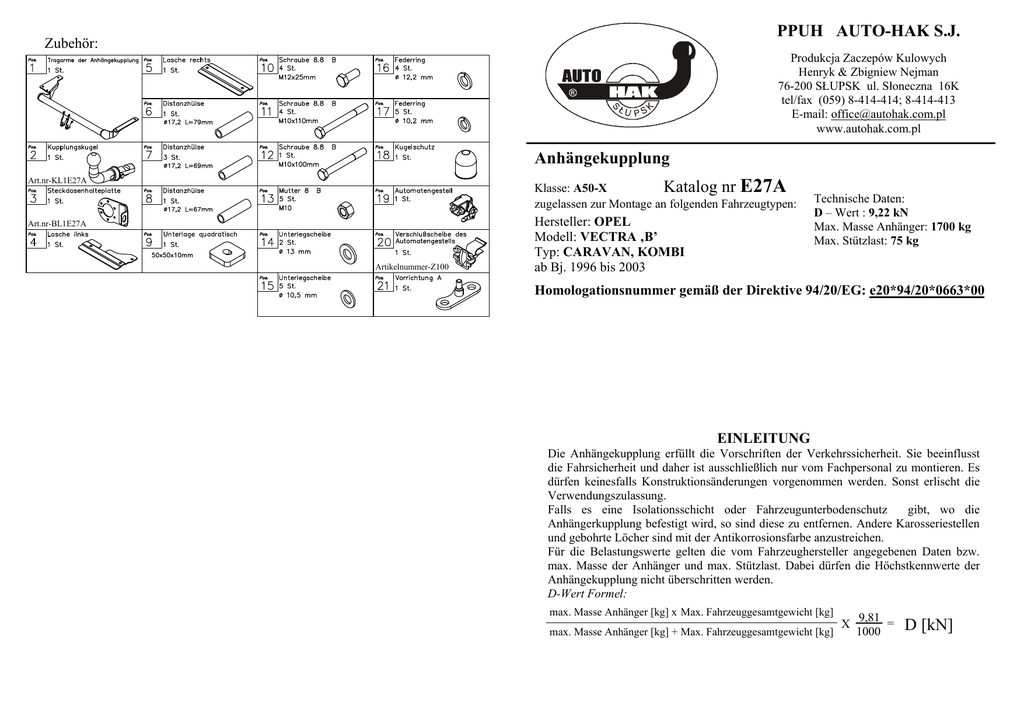 PPUH AUTO-HAK S.J. Zubehör: Produkcja Zaczepów Kulowych Henryk & Zbigniew Nejman 76-200 SŁUPSK ul. Słoneczna 16K tel/fax (059) 8-414-414; 8-414-413 E-mail: [email protected] www.autohak.com.pl Anhängekupplung Art.nr-KL1E27A Klasse: A50-X Katalog nr E27A zugelassen zur Montage an folgenden Fahrzeugtypen: Art.nr-BL1E27A Artikelnummer-Z100 Hersteller: OPEL Modell: VECTRA ‚B’ Typ: CARAVAN, KOMBI ab Bj. 1996 bis 2003 Technische Daten: D – Wert : 9,22 kN Max. Masse Anhänger: 1700 kg Max. Stützlast: 75 kg Homologationsnummer gemäß der Direktive 94/20/EG: e20*94/20*0663*00 EINLEITUNG Die Anhängekupplung erfüllt die Vorschriften der Verkehrssicherheit. Sie beeinflusst die Fahrsicherheit und daher ist ausschließlich nur vom Fachpersonal zu montieren. Es dürfen keinesfalls Konstruktionsänderungen vorgenommen werden. Sonst erlischt die Verwendungszulassung. Falls es eine Isolationsschicht oder Fahrzeugunterbodenschutz gibt, wo die Anhängerkupplung befestigt wird, so sind diese zu entfernen. Andere Karosseriestellen und gebohrte Löcher sind mit der Antikorrosionsfarbe anzustreichen. Für die Belastungswerte gelten die vom Fahrzeughersteller angegebenen Daten bzw. max. Masse der Anhänger und max. Stützlast. Dabei dürfen die Höchstkennwerte der Anhängekupplung nicht überschritten werden. D-Wert Formel: max. Masse Anhänger [kg] x Max. Fahrzeuggesamtgewicht [kg] max. Masse Anhänger [kg] + Max. Fahrzeuggesamtgewicht [kg] X 9,81 = 1000 D [kN] MONTAGE - und BETRIEBSANLEITUNG DER ANHÄNGEKUPPLUNG 1. M10x110 5 Distanzhülse L=79mm Distanzhülse L=69mm 9 M10x110 M10x100 1 4 M12x25 Distanzhülse L=67mm 21 3 Distanzhülse L=69mm 19 Anbauanleitung Die Stoßstange demontieren und den Teppichboden im Kofferraum nach hinten ziehen. 2. An der rechten Seite des Kofferraumes sind zwei deutlich markierte Punkte zu suchen. Dort sind die Löcher mit ø17mm zu bohren. 3. An der linken Seite des Kofferraumes sind drei deutlich markierte Punkte zu suchen. Dort sind die Löcher mit ø17mm zu bohren. 4. In die ausgeführten Löchern die Distanzhülsen einsetzen und die Laschen (Pos. 4 und 5) anlegen. Dann die Schrauben M10 (Pos. 11 und 12) gemäß der Zeichnung hineinstecken. 5. Die Tragarme der Anhängekupplung (Pos. 1) von der unteren Seite des Fahrzeuges auf die Schrauben anlegen und festdrehen. 6. Die Stoßstange montieren, zuerst die Schaumfüllung (Styropor) entfernen. 7. Das Automatengestell (Pos. 19) mit Hilfe von den Schrauben M12x25mm (Pos. 10) und das Halteblech der Steckdosenplatte (Pos. 3) fixieren. Die Kupplungskugel gemäß der Anbauanleitung der Anhängekupplung mit dem schnelldemontierbaren Aufsatz anbringen. 8. Alle Schrauben gemäß den Angaben in der Tabelle festdrehen. 9. Die Elektroinstallation gemäß der Bedienungsanleitung des Herstellers anschließen. 10. Falls nötig, den durch die Montage beschädigten Farbanstrich an der Anhängekupplung ausbessern. 2 Drehmomente für Schrauben und Muttern 8.8: M6 - 11 Nm M8 - 25 Nm M10 - 50 Nm M12 - 87 Nm M14 - 138 Nm M16 - 210 Nm Die Anhängekupplung (Katalognummer E27A) ist für folgende Fahrzeugtypen zugelassen: OPEL VECTRA ‚B’, CARAVAN, KOMBI ab Bj. 1996 bis 2003 dient zum ziehen der Anhänger mit der Gesamtlast von 1700 kg und der Kugelstützlast von max. 75 kg. VON DEM HERSTELLER Die Zuverlässigkeit der Anhängekupplung ist jedoch auch von der ordnungsgemäßen Montage und der richtigen Nutzung abhängig. Daher werden Sie gebeten, sorgfältig die folgende Montageanleitung zu lesen und sich an die entsprechenden Anweisungen zu beachten. Die Anhängekupplung muss an den vom Fahrzeughersteller vorgeschriebenen Befestigungsstellen montiert werden. ACHTUNG Nach dem Anbau der Anhängekupplung sind die nationalen Vorschriften zur Anbauabnahme und zur Änderung der Fahrzeugpapiere zu beachten. Das Fahrzeug sollte mit seitlichen Blinkern und Rückspiegeln, deren Abstand mindestens der Anhängerbreite entspricht, ausgestattet werden. Alle Befestigungsschrauben sind nach ca. 1000 km Anhängerbetrieb zu prüfen und nachzuziehen. Die Kugel der Anhängekupplung ist sauber zu halten und zu fetten. Der Freiraum nach Anhang VII, Abbildung 30 der Richtlinie 94/20/EG ist zu gewährleisten Bei zulässigem Gesamtgewicht des Fahrzeuges To install the towbar you need electric drill and bit ø17mm. FITTING INSTRUCTION Clamp mark in acc. with ISO PN 1 L 2 + 3 31 4 R 5 58R 6 54 7 58L M10x110 Cables joining Left directional lights Rear fog lights Ground Right directional lights Right side parking lights Stoplights Left side parking lights The instruction of the assembly 1. 2. 3. 4. 5 Distance sleeve L=79mm Distance sleeve L=69mm 9 M10x110 M10x100 4 5. 6. 7. 1 8. 9. M12x25 Distance sleeve L=67mm 19 10. 3 Distance sleeve L=69mm 2 This towbar is designed to assembly in following cars: OPEL VECTRA “B” ESTATE, produced since 1996 till 2003, catalogue number E27A and is prepared to tow trailers max total weight 1700 kg and max vertical mass 75 kg. From manufacturer Thank you for buying our product. Their reliability has been confirmed in many tests. Reliability of towbar depends also on correct assembly and correct exploitation. For this reasons we kindly ask to read carefully this instruction and apply to hints. The towbar should be install in points described by a car producer. Disassemble a bumper, and pull a boot carpet back. Find two marked holes on the right and drill it ø17mm. Find three marked holes on the left and drill it ø17mm. Put distance sleeves through the just made holes and position elements (pos. 4 and 5), then put screws M10 (pos. 11 and 12) (as it shown in the drawing). Position element (pos. 1) on the sticking bolts out. Reassemble the bumper (earlier take a foam out the bumper ) Fix body of the automat (pos. 19) and the socket plate (pos. 3) using bolts M12x25mm (pos. 10) from accessories. Place towball (pos. 2) according to supplied instruction. Tighten all bolts according to the torque shown in the table. Connect electric wire