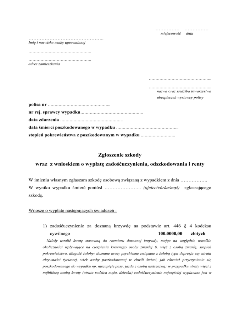…………… miejscowość …………… dnia ……………………………………….. Imię i nazwisko osoby uprawnionej ……………………………………….. ……………………………………….. adres zamieszkania ……………………………………….. ……………………………………….. nazwa oraz siedziba towarzystwa ubezpieczeń wystawcy polisy polisa nr ……………………………………….. nr rej. sprawcy wypadku……………………………………….. data zdarzenia ……………………………………….. data śmierci poszkodowanego w wypadku ……………………………………….. stopień pokrewieństwa z poszkodowanym w wypadku …………………….. Zgłoszenie szkody wraz z wnioskiem o wypłatę zadośćuczynienia, odszkodowania i renty W imieniu własnym zgłaszam szkodę osobową związaną z wypadkiem z dnia …………….. W wyniku wypadku śmierć poniósł ………………….. (ojciec/córka/mąż) zgłaszającego szkodę. Wnoszę o wypłatę następujących świadczeń : 1) zadośćuczynienie za doznaną krzywdę na podstawie art. 446 § 4 kodeksu cywilnego 100.0000,00 złotych Należy ustalić kwotę stosowną do rozmiaru doznanej krzywdy, mając na względzie wszelkie okoliczności wpływające na cierpienia krewnego osoby zmarłej tj. więź z osobą zmarłą, stopień pokrewieństwa, długość żałoby; doznane urazy psychiczne związane z żałobą typu depresja czy utrata aktywności życiowej, wiek osoby poszkodowanej w chwili śmieci, jak również przyczynienie się poszkodowanego do wypadku np. niezapięte pasy, jazda z osobą nietrzeźwą; w przypadku utraty więzi z najbliższą osobą kwoty (utrata rodzica męża, dziecka) zadośćuczynienie najczęściej wypłacane jest w kwotach od 50.000 zł do 250.000 zł, natomiast dalsza rodzina (rodzeństwo, dziadkowie) zadośćuczynienie najczęściej wypłacane jest w kwotach od 10.000 zł do 50.000 zł, 2) stosowne odszkodowanie na podstawie art. 446 § 3 kodeksu cywilnego 75.000 zł (odszkodowanie z art. 446 § 3 k.c. ma na celu pokrycie różnych strat materialnych, trudnych do uchwycenia bądź wyliczenia, a więc wymaga wzięcia pod uwagę całokształtu okoliczności sprawy. Należy także podkreślić, iż wysokość odszkodowania powinna być umiarkowana, utrzymana w rozsądnych granicach. Celem odszkodowania przyznanego na podstawie art. 446 § 3 k.c. ma być zrekompensowanie rzeczywistego znacznego pogorszenia sytuacji życiowej najbliższych członków rodziny zmarłego. Nie może być ono natomiast źródłem wzbogacenia się tych osób, roszczenie to zasadne jest dla najbliższej rodziny -utrata rodzica męża, dziecka) ; 3) odszkodowanie tytułem poniesionych kosztów pogrzebu na podstawie art. 446 § 1 kodeksu cywilnego : (należy wskazać wszelkie koszty związane z pogrzebem : wydatki na nagrobek, stypę, ubranie, zwrot należy pomniejszyć o wypłacony zasiłek pogrzebowy, nadto poniesione koszty należy udokumentować odpowiednimi rachunkami) 5.000 zł 4) renta alimentacyjna na podstawie art. 446 § 2 kodeksu cywilnego płatna od dnia ………… wysokości 500 zł miesięcznie (roszczenie to jest zasadne dla osoby małoletniej lub uczącej się, w skutek uraty rodzica lub opiekuna prawnego, również renta może być wypłacana dla małżonka jeżeli zmarły był jedynym lub głównym żywicielem rodziny, żądną kwotę należy pomniejszyć o kwotę uzyskiwanej renty z Zakładu Ubezpieczeń Społecznych lub innego podmiotu). Łącznie kwota …………………… Wnoszę o wypłatę wymienionych świadczeń na mój rachunek bankowy : Bank…………nr………………………………………. w terminie 30 dni od daty otrzymania przedmiotowego pisma, w przeciwnym razie będę żądać odsetek ustawowych lub skieruje sprawę na drogę postępowania sądowego. Uzasadnienie Należy opisać miejsce oraz okoliczności wypadku i śmierci krewnego zgłaszającego szkodę np. : W dniu ……..doszło do zdarzenia drogowego na drodze …………. gmina ……, podczas którego kierujący pojazdem marki …………z nieustalonych przyczyn zjechał na przeciwległy pas ruchu. Wskutek tego manewru przedmiotowy samochód zderzył się czołowo z samochodem……………, powodując ……. uszkodzenia ciała, a w konsekwencji jego zgon dnia……….. W chwili zdarzenia………poszkodowany miał zapięte pasy bezpieczeństwa. Prawomocnym wyrokiem z dnia …………….. Sądu …………………..Wydział Karny o sygn. …………..(imię nazwisko sprawcy wypadku) został uznany za winnego popełnienia czynu z art. …….. kodeksu karnego. Sprawca wypadku w dniu zdarzenia korzystał z ochrony ubezpieczeniowej w zakresie odpowiedzialności cywilnej posiadaczy pojazdów mechanicznych, udzielanej przez Państwa towarzystwo na podstawie umowy ubezpieczenia nr ………………..(dowód : notatka policyjna ze zdarzenia, wyrok ze sprawy karnej, akt zgonu ). Zmarły był moim …………….(ojcem/bratem/córką/małżonkiem). Poniosłem ogromną stratę. (Należy zwięźle opisać relacje ze zmarłym, oraz skutki psychiczne oraz krewnego). materialne związane ze śmiercią (dowód : akt stanu cywilnego potwierdzający stopień pokrewieństwa ze zmarłym, zdjęcia zgłaszającego szkodę ze zmarłym ……). Zgodnie z art. 14 ust. 1 ustawy z dnia 22 maja 2003 roku o ubezpieczeniach obowiązkowych, Ubezpieczeniowym Funduszu Gwarancyjnym i Polskim Biurze Ubezpieczycieli Komunikacyjnych, zakład ubezpieczeń wypłaca odszkodowanie w terminie 30 dni licząc od dnia złożenia przez poszkodowanego lub uprawnionego zawiadomienia o szkodzie. Ponadto zgodnie z art. 14 ust 2 powyższej ustawy, zakład ubezpieczeń w terminie 30 dni od dnia złożenia zawiadomienia o szkodzie, zawiadamia na piśmie uprawnionego o przyczynach niemożności zaspokojenia jego roszczeń w całości lub części, jak również 