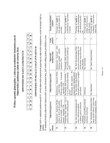 2 B 3 D 5 C 6 D 7 A 8 C 9 B 10 11 12 13 14 15 16 17 18 19 20 D B C B D A C A D C B ODPOWIEDZI I PUNKTACJA ZADAŃ OTWARTYCH 4 A Np.: domownicy. Strona 1 z 6 Np.: ludzie; właściciel domu. Np.: mieszkaniec (mieszkańcy) bloku; miasta; dziecko (dzieci); rodzice (matka lub ojciec) usypiający dziecko. 25. 24. 1 1 1 Np.: dom wita powracającą Zofię; ojczyzna wita powracającego właściciela domu; zniszczone miasto wita człowieka. Np.: porównanie. Np.: dom wita powracającego człowieka z radością (przyjaźnie; z czułością; gorąco; serdecznie; z miłością). Przenośnia; personifikacja (antropomorfizacja; uosobienie). 23. Animizacja. 1 Przełamując chleb, powiedziała: — Wy jesteście moimi ostatnimi gośćmi? 22. 1 Burmistrzowa – Katarzyna – zabór. Waleczny czeladnik – szlachta – insurekcja 1794. Burmistrzowa – Katarzyna Wielka – rozbiór Polski. Waleczny czeladnik – Kościuszko – insurekcja 1794. Przełamując chleb, powiedziała: — Czy wy jesteście moimi ostatnimi gośćmi? Przełamując chleb, zapytała: — Wy jesteście moimi ostatnimi gośćmi? Np.: ruiny domu witają dawnego mieszkańca (lokatora) z wyciągniętymi rękami. Burmistrzowa – Katarzyna Wielka – rozbiory (I lub II, lub III rozbiór). Waleczny czeladnik – Tadeusz Kościuszko – insurekcja 1794. Przełamując chleb, zapytała: – Czy wy jesteście moimi ostatnimi gośćmi? 21. Liczba punktów Odpowiedzi niedopuszczalne Odpowiedzi dopuszczalne Odpowiedzi poprawne Nr zadania Przyznaje się 1 punkt za odpowiedź uwzględniającą obie okoliczności powitania. Przyznaje się 1 punkt za podanie właściwej nazwy środka wyrazu. Przyznaje się 1 punkt za wynikające z wiersza określenie osoby. Przyznaje się 1 punkt za przekształcenie wypowiedzi w pytanie. Przyznaje się 1 punkt za dwie poprawne, pełne odpowiedzi. Zasady przydzielania punktów Uwaga! Jeśli w zadaniach punktowanych 0-1 wśród odpowiedzi poprawnych pojawiają się odpowiedzi niepoprawne, uczeń otrzymuje 0 pkt za zadanie. W zadaniach krótkiej odpowiedzi dopuszczalne są inne sformułowania, jeśli trafnie oddają podany przykładowo sens. 1 C ODPOWIEDZI DO ZADAŃ ZAMKNIĘTYCH Próbny egzamin gimnazjalny z zakresu przedmiotów humanistycznych Odpowiedzi i punktacja zadań do zestawu Dom Np.: dla zamożnych Rzymian winda była wyrazem ich pozycji społecznej; znamieniem komfortu; luksusu, a dla ludzi z wiersza stała się utrapieniem. Kolumna (kolumny); portyk; belkowanie. Np.: dom jest dziełem sztuki, gdyż posiada falisty (wymyślny; nietypowy; niekonwencjonalny) dach; ozdobną wieżyczkę; ozdobne balkony; artystyczną dachówkę. 28. 30. 29. 27. Np.: niewygodne łóżka; hałaśliwa winda; hałaśliwe rury; krzywe okna; brak elektryczności. Niechaj. Odpowiedzi poprawne 26. Nr zadania Np.: rozłożysta szafa; problemy z ogrzewaniem. Odpowiedzi niedopuszczalne Attyka. 1 Np.: dom jest inny; wygląda jak z bajki; ma oryginalne kształty. Strona 2 z 6 1 1 1 1 Liczba punktów Np.: dach. Niechaj w rurach nic nie płacze; Niechaj dym odpłynie z miasta; Niechaj błyśnie dobra gwiazda. Np.: dla bogatych Rzymian była Np.: dla Rzymian i ludzi z wiersza ciekawym wynalazkiem, a dla ludzi była środkiem transportu. z wiersza czymś codziennym. Np.: hałas; brak spokoju. Odpowiedzi dopuszczalne Przyznaje się 1 punkt za podanie właściwego przykładu elementu architektonicznego. Przyznaje się 1 punkt za uzasadnienie zawierające jeden przykład. Przyznaje się 1 punkt za wskazanie różnicy. Przyznaje się 1 punkt za podanie właściwego słowa. Przyznaje się 1 punkt za podanie dwóch utrudnień. Zasady przydzielania punktów ZADANIE ROZSZERZONEJ ODPOWIEDZI Zad. 31. KRYTERIA OCENY NOTATKI Kryteria Realizacja tematu Kompozycja Zasady przyznawania punktów Punktacja celowe i rzeczowo poprawne wykorzystanie informacji z Tekstu III 0–1 • zwięzłość wypowiedzi 0–1 • spójność wypowiedzi 0–1 Język poprawność językowa – słownictwo; odmiana wyrazów; budowa zdań pojedynczych i złożonych (nie powtarzają się te same struktury zdaniowe, nie pojawiają się: kolokwializmy, wielosłowie, wieloznaczność, nieuzasadnione powtarzanie wyrazów); dopuszczalny 1 błąd 0–1 Zapis ortografia i interpunkcja (dopuszczalny 1 błąd ortograficzny i 1 błąd interpunkcyjny) 0–1 Razem: 0–5 Strona 3 z 6 ZADANIE ROZSZERZONEJ ODPOWIEDZI Zad. 32. KRYTERIA OCENY KARTKI Z PAMIĘTNIKA Kryteria oceniania Punktacja 1 TEMAT (0 – 5 pkt) Praca w całości zgodna z tematem. * Wypowiadanie się w 1. osobie liczby pojedynczej. Opisanie domu. Przedstawienie mieszkańców domu. Argumentacja (wrażenia i doznania). 2 KOMPOZYCJA (0 – 3 pkt)** Dwupłaszczyznowość narracji (zaznaczenie dystansu czasowego). Spójność tekstu (istnieją językowe nawiązania pomiędzy poszczególnymi częściami pracy). Logiczne uporządkowanie (występują związki przyczynowo-skutkowe, nie pojawiają się nieuzasadnione powtórzenia). 3 JĘZYK I STYL (0 – 4 pkt)** Poprawne (pod względem znaczeniowym) słownictwo, również w związkach frazeologicznych. Poprawna odmiana wyrazów oraz łączenie wyrazów w zdania i zdań pojedynczych w zdania złożone (nie pojawia się powtarzanie tych samych struktur zdaniowych). Trafnie dobrane środki językowe (nie pojawiają się: wulgaryzmy, nieuzasadnione kolokwializmy, wielosłowie, wieloznaczność, nieuzasadnione powtarzanie wyrazów, nadużywanie wyrazów obcych i nieuzasadnionych wyrażeń typu: praktycznie rzecz biorąc, dajmy na to, powiedzmy). Funkcjonalność stylu (słownictwo nacechowane emocjonalnie). 4 ZAPIS (0 – 3 pkt)** Interpunkcja (dopuszczalne 3 błędy). Ortografia. Razem: 0–1 0–1 0–1 0–1 0–1 0–1 0–1 0–1 0–3 (dopuszczalne trzy błędy, niezależnie od kategorii) 3 bł. – 3 pkt 4 bł. – 2 pkt 5 bł. – 1 pkt 6 bł. – 0 pkt 0–1 0–1 0–2 0 bł. – 2 pkt 1 bł. – 1 pkt 2 bł. – 0 pkt 0 – 15 *Jeśli praca przynajmniej w połowie nie jest zgodna z tema