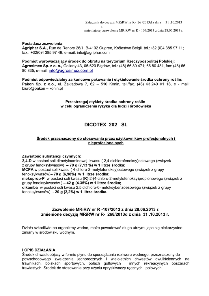 Załącznik do decyzji MRiRW nr R- 26 /2013d z dnia 31 .10.2013 r. zmieniającej zezwolenie MRiRW nr R - 107/2013 z dnia 28.06.2013 r. Posiadacz zezwolenia: Agriphar S.A., Rue de Renory 26/1, B-4102 Ougree, Królestwo Belgii. tel.:+32 (0)4 385 97 11; fax.: +32(0)4 385 97 49, e-mail: [email protected] Podmiot wprowadzający środek do obrotu na terytorium Rzeczypospolitej Polskiej: Agrosimex Sp. z o. o., Goliany 43, 05-620 Błędów, tel.: (48) 66 80 471; 66 80 481, fax: (48) 66 80 835, e-mail: [email protected] Podmiot odpowiedzialny za końcowe pakowanie i etykietowanie środka ochrony roślin: Pakon Sp. z o.o., ul. Zakładowa 7, 62 – 510 Konin, tel./fax. (48) 63 240 01 18, e - mail: biuro@pakon – konin.pl Przestrzegaj etykiety środka ochrony roślin w celu ograniczenia ryzyka dla ludzi i środowiska DICOTEX 202 SL Środek przeznaczony do stosowania przez użytkowników profesjonalnych i nieprofesjonalnych Zawartość substancji czynnych: 2,4-D w postaci soli dimetyloaminowej kwasu ( 2,4 dichlorofenoksy)octowego (związek z grupy fenoksykwasów) – 70 g (7,13 %) w 1 litrze środka; MCPA w postaci soli kwasu ( 4-chloro-2-metylofenoksy)octowego (związek z grupy fenoksykwasów)– 70 g (6,98%) w 1 litrze środka; mekoprop-P w postaci soli kwasu (R)-2-(4-chloro-2-metylofenoksy)propionowego (związek z grupy fenoksykwasów ) – 42 g (4.35%) w 1 litrze środka; dikamba w postaci soli kwasu 2,5 dichloro-6-metoksybenzoesowego (związek z grupy fenoksykwasów) - 20 g (2,2%) w 1 litrze środka. Zezwolenie MRiRW nr R -107/2013 z dnia 28.06.2013 r. zmienione decyzją MRiRW nr R- 268/2013d z dnia 31 .10.2013 r. Działa szkodliwie na organizmy wodne, może powodować długo utrzymujące się niekorzystne zmiany w środowisku wodnym. I OPIS DZIAŁANIA Środek chwastobójczy w formie płynu do sporządzania roztworu wodnego, przeznaczony do powschodowego zwalczania jednorocznych i wieloletnich chwastów dwuliściennych na trawnikach, boiskach sportowych, polach golfowych i innych rekreacyjnych obszarach trawiastych. Środek do stosowania przy użyciu opryskiwaczy ręcznych i polowych. II DZIAŁANIE NA CHWASTY Środek pobierany jest przez liście chwastów powodując ich deformację, a następnie zahamowanie wzrostu i zamieranie. Pierwsze objawy widoczne są po kilku dniach a proces obumierania następuje po około tygodniu od zastosowania. Pogoda ciepła i sprzyjająca rozwojowi roślin wzmaga działanie chwastobójcze środka. Chwasty wrażliwe np.: bylica pospolita, jaskier rozłogowy, koniczyna biała, mniszek lekarski, rdest ptasi, stokrotka polna, szczaw tępolistny, tasznik pospolity Chwasty średnio wrażliwe np.: babka zwyczajna, bodziszek drobny, krwawnik pospolity Chwasty odporne np.: bluszczyk kurdybanek, podagrycznik pospolity III SPORZĄDZANIE CIECZY UŻYTKOWEJ Przed przystąpieniem do sporządzania cieczy użytkowej dokładnie ustalić potrzebną jej ilość. Zawartością opakowania przed użyciem wstrząsnąć. Odmierzoną ilość środka wlać do zbiornika opryskiwacza napełnionego częściowo wodą i uzupełnić wodą do potrzebnej ilości. Ciecz wymieszać zgodnie z instrukcją obsługi dla danego typu opryskiwacza, lub mechanicznie. Po każdej przerwie, przed ponownym przystąpieniem do pracy, dokładnie wymieszać ciecz użytkową w zbiorniku opryskiwacza. Opróżnione opakowania przepłukać trzykrotnie wodą, a popłuczyny wlać do zbiornika z cieczą użytkową. Ciecz użytkową zużyć bezpośrednio po jej sporządzeniu. Po pracy aparaturę dokładnie wymyć. IV ZAKRES STOSOWANIA, TERMINY I DAWKI: Trawniki, boiska sportowe, pola golfowe 1. Termin i warunki stosowania: Środek można stosować na wieloletnie trawniki w czasie całego okresu wegetacji traw od wiosny do jesieni (od kwietnia do połowy września) w okresie intensywnego wzrostu chwastów. Zabieg najlepiej wykonać gdy chwasty dwuliścienne znajdują się w fazie siewki do fazy 6 liści właściwych. Warunki sprzyjające dla wzrostu roślin: (temperatura powyżej 12 0C,odpowiednia wilgotność gleby, światło słoneczne ) wzmagają skuteczność działania środka. Maksymalna dawka dla jednorazowego zastosowania: 10 l/ha (odpowiednio 100 ml środka /5 l wody/100 m2). Zalecana dawka: 10 l/ha (odpowiednio 100 ml środka /5 l wody/100 m2). Maksymalna liczba zabiegów w sezonie wegetacyjnym – 1. Zalecana ilość wody: 500 l/ha. Zalecane opryskiwanie: średniokropliste. UWAGI: Stosować co najmniej 5-7 dni po skoszeniu trawnika ( zwalczane chwasty powinny wytworzyć odpowiednią powierzchnię liści). Nie kosić trawnika co najmniej 7 dni po zastosowaniu środka (środek powinien przemieścić się do korzeni chwastów). Deszcz w ciągu 24 godzin od zabiegu zmniejsza skuteczność działania środka (zmywanie). Podczas zabiegu nie dopuścić do znoszenia cieczy użytkowej na rośliny nie przeznaczone do zniszczenia. Roślin traktowanych środkiem nie przeznaczać na paszę w roku stosowania środka. 2. Przeciwwskazania: Nie stosować : − na liście, pędy i młodą korę roślin nie przeznaczonych do zniszczenia, − w czasie suszy, − na rośliny chore, uszkodzone, mokre lub osłabione suszą, − w temperaturze poniżej 100C i powyżej 250C, − przed spodziewanym deszczem i przymrozkiem. Podczas stosowania środka nie dopuścić do: − znoszenia cieczy użytkowej na sąsiednie rośliny uprawne, − nakładania się cieczy użytkowej na stykach pasów zabiegowych i uwrociach. 3. Następstwo roślin Wysiew traw w celu renowacji trawnika nie wcześniej niż 5-6 tygodni od ostatniego zabiegu. Środek stosowany w zalecanych dawkach rozkłada się w okresie wegetacji, nie stwarzając zagrożenia dla roślin uprawianych w następnym sezonie wegetacyjnym. IV ŚRODKI OSTROŻNOŚCI 1. OKRES OD ZASTOSOWANIA ŚRODKA DO DNIA W KTÓRYM NA OBSZAR NA KTÓRYM ZASTOSOWANO ŚRODEK MOGĄ WEJŚĆ LUDZIE ORAZ ZOSTAĆ WPROWADZONE ZWIERZĘTA (okres prewencji) 6 godzin Zaleca się opuścić teren oprysku do momentu, aż środek