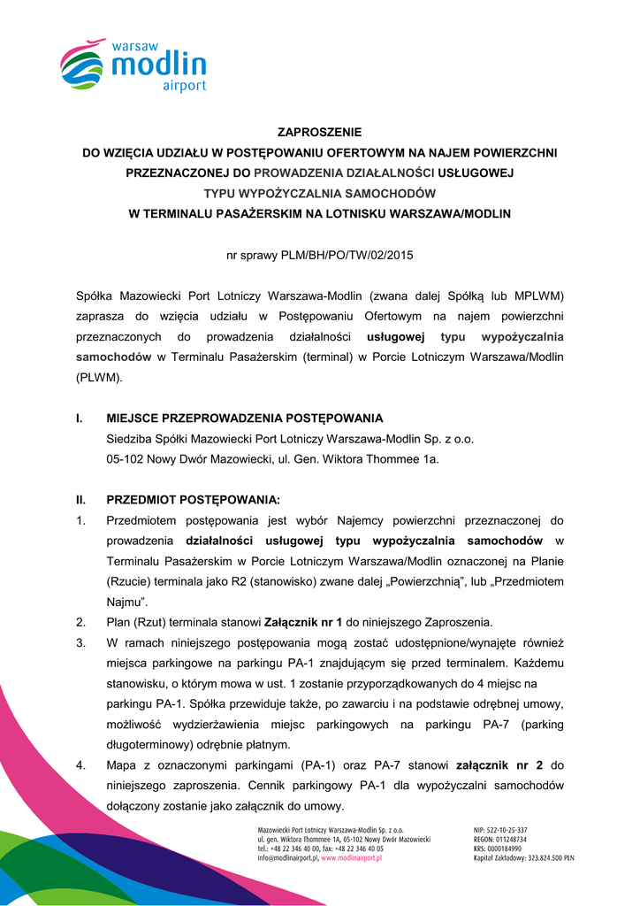 ZAPROSZENIE DO WZIĘCIA UDZIAŁU W POSTĘPOWANIU OFERTOWYM NA NAJEM POWIERZCHNI PRZEZNACZONEJ DO PROWADZENIA DZIAŁALNOŚCI USŁUGOWEJ TYPU WYPOŻYCZALNIA SAMOCHODÓW W TERMINALU PASAŻERSKIM NA LOTNISKU WARSZAWA/MODLIN nr sprawy PLM/BH/PO/TW/02/2015 Spółka Mazowiecki Port Lotniczy Warszawa-Modlin (zwana dalej Spółką lub MPLWM) zaprasza do wzięcia udziału w Postępowaniu Ofertowym na najem powierzchni przeznaczonych do prowadzenia działalności usługowej typu wypożyczalnia samochodów w Terminalu Pasażerskim (terminal) w Porcie Lotniczym Warszawa/Modlin (PLWM). I. MIEJSCE PRZEPROWADZENIA POSTĘPOWANIA Siedziba Spółki Mazowiecki Port Lotniczy Warszawa-Modlin Sp. z o.o. 05-102 Nowy Dwór Mazowiecki, ul. Gen. Wiktora Thommee 1a. II. PRZEDMIOT POSTĘPOWANIA: 1. Przedmiotem postępowania jest wybór Najemcy powierzchni przeznaczonej do prowadzenia działalności usługowej typu wypożyczalnia samochodów w Terminalu Pasażerskim w Porcie Lotniczym Warszawa/Modlin oznaczonej na Planie (Rzucie) terminala jako R2 (stanowisko) zwane dalej „Powierzchnią”, lub „Przedmiotem Najmu”. 2. Plan (Rzut) terminala stanowi Załącznik nr 1 do niniejszego Zaproszenia. 3. W ramach niniejszego postępowania mogą zostać udostępnione/wynajęte również miejsca parkingowe na parkingu PA-1 znajdującym się przed terminalem. Każdemu stanowisku, o którym mowa w ust. 1 zostanie przyporządkowanych do 4 miejsc na parkingu PA-1. Spółka przewiduje także, po zawarciu i na podstawie odrębnej umowy, możliwość wydzierżawienia miejsc parkingowych na parkingu PA-7 (parking długoterminowy) odrębnie płatnym. 4. Mapa z oznaczonymi parkingami (PA-1) oraz PA-7 stanowi załącznik nr 2 do niniejszego zaproszenia. Cennik parkingowy PA-1 dla wypożyczalni samochodów dołączony zostanie jako załącznik do umowy. III. ZASADY OGÓLNE 1. Postępowanie Ofertowe przygotowuje i przeprowadza Spółka Mazowiecki Port Lotniczy Warszawa-Modlin Sp. z o.o. 2. Zaproszenie określa warunki i zasady prowadzenia niniejszego Postępowania Ofertowego. 3. Wszystkie koszty udziału oraz przygotowania oferty pokrywa Oferent. 4. Postępowanie Ofertowe zostanie przeprowadzone w języku polskim. 5. W Postępowaniu Ofertowym może wziąć udział każdy podmiot prowadzący działalność gospodarczą, niezależnie od jego formy prawnej, miejsca rejestracji czy struktury własności, który spełni warunki określone w niniejszym Zaproszeniu i przedłoży w wymaganym terminie wszystkie niezbędne dokumenty. 6. Z ubiegania się o udział w postępowaniu wyklucza się: a) podmioty, które w związku z wykonywaniem działalności wyrządziły szkodę swoim kontrahentom nie wywiązując się ze swoich zobowiązań lub wykonując je nienależycie jeżeli szkoda ta została stwierdzona orzeczeniem sądu, które uprawomocniło się w okresie 3 lat przed wszczęciem postępowania, b) podmioty, w odniesieniu do których wszczęto postępowanie likwidacyjne/upadłościowe/układowe lub ogłoszono upadłość, c) podmioty, które zalegają z uiszczaniem podatków, opłat oraz składek na ubezpieczenie społeczne, d) osoby fizyczne, a w przypadku pozostałych przedsiębiorców, członkowie organów zarządzających, którzy zostali prawomocnie skazani za przestępstwo płatnej protekcji, przestępstwo przeciw obrotowi gospodarczemu lub inne przestępstwo popełnione w celu osiągnięcia korzyści majątkowych. e) Podmioty, które w dniu złożenia oferty posiadają nieuregulowane i przeterminowane należności wobec PLWM. f) Oferentów, którzy złożyli niepełne (nie odpowiadające wymogom zawartym w Zaproszeniu) oferty, g) Oferentów, którzy złożyli oferty po terminie wyznaczonym przez Spółkę, h) Oferentów, którzy nie spełnią warunków udziału określonych w niniejszym Zaproszeniu. i) Oferentów, którzy w dniu składania oferty są już Najemcami standów w terminalu pasażerskim w Porcie Lotniczym Warszawa/Modlin, na podstawie zawartych umów najmu 7. Spółka wymaga złożenia stosownego oświadczenia w zakresie pkt. 6 lit. a-d, którego wzór stanowi załącznik nr 3 do niniejszego zaproszenia. Złożenie oświadczenia nieprawdziwego wyklucza z postępowania, a po zawarciu umowy jest rażącym jej naruszeniem i stanowi podstawę do odstąpienia od umowy. 8. Postępowanie nie jest jawne i nie przewiduje się publicznego otwierania ofert oraz informowania o biorących udział w postępowaniu Oferentach, jak również udostępniania protokołów z niniejszego postępowania. 9. Weryfikacji, oceny i wyboru ofert dokona Komisja powołana przez Zarząd Spółki. 10. Spółka zastrzega sobie prawo do: odwołania lub zmiany warunków zaproszenia, unieważnienia postępowania bez podawania przyczyn i może to zrobić w dowolnym czasie bez ponoszenia odpowiedzialności wobec Oferentów, którzy złożyli oferty. 11. Spółka udostępni powierzchnie, o których mowa w pkt I. wybranemu w niniejszym postępowaniu Najemcy. 12. Umowa zostanie zawarta na czas nieokreślony. 13. Postępowanie ofertowe zostanie przeprowadzone jednoetapowo, przy czym: Komisja rezerwuje sobie prawo, po otrzymaniu i otwarciu ofert, do dodatkowych negocjacji z wybranymi oferentami, w wypadku, gdy: a) więcej niż jeden oferent przedstawi taką samą stawkę miesięcznego czynszu za metr kwadratowy wybranej powierzchni, b) oferent, który był rekomendowany jako najemca powierzchni, z jakichkolwiek przyczyn odmówi podpisania umowy lub wycofa ofertę po terminie jej złożenia, c) nastąpi jakakolwiek inna okoliczność która, w ocenie Komisji wymagać będzie podjęcia takiego kroku. 14. Z Oferentem, którego oferta uzyska najwyższą liczbę punktów zostanie podpisana umowa na wynajem standu nr R2. 15. Składane oferty muszą zawierać propozycję stawki czynszu za 1m2. IV. WARUNKI UDZIAŁU W POSTĘPOWANIU: Warunkiem przystąpienia do Postępowania jest: 1. Posiadanie doświadczenia w prowadzeniu działalności usługowej typu wypożyczalnia samocho