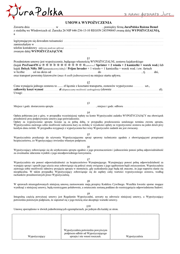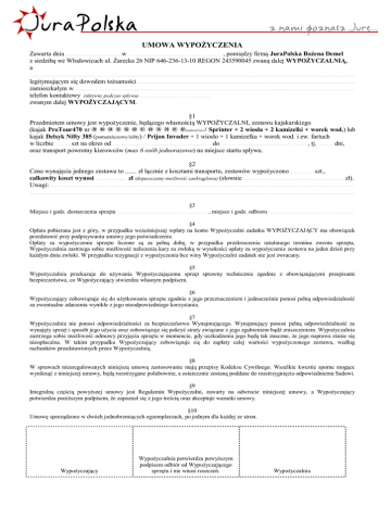 UMOWA WYPOŻYCZENIA Zawarta dnia ..................................w ……...........................…...…………, pomiędzy firmą JuraPolska Bożena Demel z siedzibą we Włodowicach ul. Żarecka 26 NIP 646-236-13-10 REGON 243590045 zwaną dalej WYPOŻYCZALNIĄ, a ...................................................................................................................................................................................................... legitymującym się dowodem tożsamości .................................................................................................................................... zamieszkałym w ................................................……………...………………………………...........…..…………………….. telefon kontaktowy (aktywny podczas spływu) ...…..…………………….. zwanym dalej WYPOŻYCZAJĄCYM. §1 Przedmiotem umowy jest wypożyczenie, będącego własnością WYPOŻYCZALNI, zestawu kajakarskiego (kajak ProTour470 nr (zakreśl nr) / Sprinter + 2 wiosła + 2 kamizelki + worek wod.) lub kajak Delsyk Nifty 385 (pomarańczowy/żółty) / Prijon Invader + 1 wiosło + 1 kamizelka + worek wod. i ew. fartuch w liczbie …..... szt na okres od ……........……................................… do……….........................…………., tj. ……. dni, oraz transport powrotny kierowców (max 6 osób jednorazowo) na miejsce startu spływu. §2 Cena wynajęcia jednego zestawu to ....... zł łącznie z kosztami transportu, zestawów wypożyczono ............. szt., całkowity koszt wynosi ................... zł (dopuszczamy możliwość zaokrąglenia) (słownie ............................................................. zł). Uwagi:.......................................................................................................................................................................................... ...................................................................................................................................................................................................... §3 Miejsce i godz. dostarczenia sprzętu .............................................................., miejsce i godz. odbioru .......................................................... §4 Opłata pobierana jest z góry, w przypadku wcześniejszej wpłaty na konto Wypożyczalni zadatku WYPOŻYCZAJĄCY ma obowiązek przedstawić przy podpisywaniu umowy jego poświadczenie. Opłaty za wypożyczenie sprzętu liczone są za pełną dobę, w przypadku przekroczenia ustalonego terminu zwrotu sprzętu, Wypożyczalnia zastrzega sobie możliwość naliczenia kary za zwłokę w wysokości opłaty za wypożyczenie zestawu na jeden dzień przy każdym dniu zwłoki. W przypadku rezygnacji z wypożyczenia bez winy Wypożyczalni zadatek nie jest zwracany. §5 Wypożyczalnia przekazuje do używania Wypożyczającemu sprzęt sprawny technicznie zgodnie z obowiązującymi przepisami bezpieczeństwa, co Wypożyczający stwierdza własnym podpisem. §6 Wypożyczający zobowiązuje się do użytkowania sprzętu zgodnie z jego przeznaczeniem i jednocześnie ponosi pełną odpowiedzialność za ewentualne zdarzenia wynikłe z jego nieodpowiedniego korzystania. §7 Wypożyczalnia nie ponosi odpowiedzialności za bezpieczeństwo Wynajmującego. Wynajmujący ponosi pełną odpowiedzialność za wynajęty sprzęt i sposób jego użycia oraz zobowiązuje się pokryć straty związane z jego zgubieniem bądź zniszczeniem. Wypożyczalnia zastrzega sobie możliwość odmowy przyjęcia sprzętu w momencie, gdy uszkodzenia jego będą tak znaczne, że jego naprawa stanie się nieopłacalna. W takim przypadku Wypożyczający zobowiązuje się do zapłaty całej wartości wypożyczonego zestawu, według rachunków przedstawionych przez Wypożyczalnię. §8 W sprawach nieuregulowanych niniejszą umową zastosowanie mają przepisy Kodeksu Cywilnego. Wszelkie kwestie sporne mogące wyniknąć z niniejszej umowy, będą rozstrzygane polubownie, a ostatecznie zostaną poddane do rozstrzygnięcia odpowiedniemu Sadowi. §9 Integralną częścią powyższej umowy jest Regulamin Wypożyczalni, zawarty na odwrocie niniejszej umowy, a Wypożyczający potwierdza poniższym podpisem, że zapoznał się z jego treścią oraz akceptuje warunki umowy. §10 Umowę sporządzono w dwóch jednobrzmiących egzemplarzach, po jednym dla każdej ze stron. Wypożyczający Wypożyczalnia potwierdza powyższym podpisem odbiór od Wypożyczającego sprzętu i nie wnosi roszczeń. Wypożyczalnia