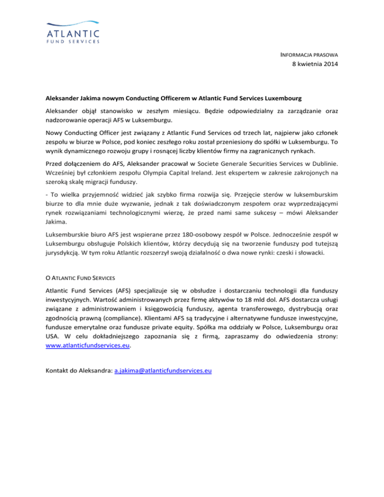 INFORMACJA PRASOWA 8 kwietnia 2014 Aleksander Jakima nowym Conducting Officerem w Atlantic Fund Services Luxembourg Aleksander objął stanowisko w zeszłym miesiącu. Będzie odpowiedzialny za zarządzanie oraz nadzorowanie operacji AFS w Luksemburgu. Nowy Conducting Officer jest związany z Atlantic Fund Services od trzech lat, najpierw jako członek zespołu w biurze w Polsce, pod koniec zeszłego roku został przeniesiony do spółki w Luksemburgu. To wynik dynamicznego rozwoju grupy i rosnącej liczby klientów firmy na zagranicznych rynkach. Przed dołączeniem do AFS, Aleksander pracował w Societe Generale Securities Services w Dublinie. Wcześniej był członkiem zespołu Olympia Capital Ireland. Jest ekspertem w zakresie zakrojonych na szeroką skalę migracji funduszy. - To wielka przyjemność widzieć jak szybko firma rozwija się. Przejęcie sterów w luksemburskim biurze to dla mnie duże wyzwanie, jednak z tak doświadczonym zespołem oraz wyprzedzającymi rynek rozwiązaniami technologicznymi wierzę, że przed nami same sukcesy – mówi Aleksander Jakima. Luksemburskie biuro AFS jest wspierane przez 180-osobowy zespół w Polsce. Jednocześnie zespół w Luksemburgu obsługuje Polskich klientów, którzy decydują się na tworzenie funduszy pod tutejszą jurysdykcją. W tym roku Atlantic rozszerzył swoją działalność o dwa nowe rynki: czeski i słowacki. O ATLANTIC FUND SERVICES Atlantic Fund Services (AFS) specjalizuje się w obsłudze i dostarczaniu technologii dla funduszy inwestycyjnych. Wartość administrowanych przez firmę aktywów to 18 mld dol. AFS dostarcza usługi związane z administrowaniem i księgowością funduszy, agenta transferowego, dystrybucją oraz zgodnością prawną (compliance). Klientami AFS są tradycyjne i alternatywne fundusze inwestycyjne, fundusze emerytalne oraz fundusze private equity. Spółka ma oddziały w Polsce, Luksemburgu oraz USA. W celu dokładniejszego zapoznania się z firmą, zapraszamy do odwiedzenia strony: www.atlanticfundservices.eu. Kontakt do Aleksandra: [email protected]