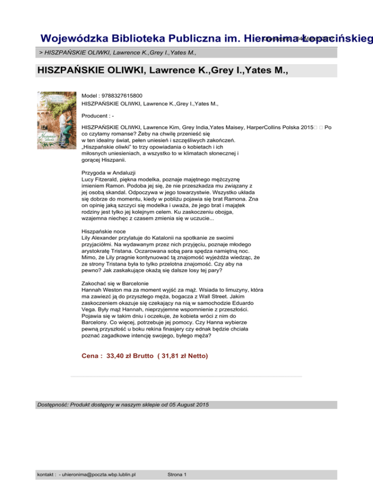 Utworzono : 04Łopacińskieg March 2017 Wojewódzka Biblioteka Publiczna im. Hieronima > HISZPAŃSKIE OLIWKI, Lawrence K.,Grey I.,Yates M., HISZPAŃSKIE OLIWKI, Lawrence K.,Grey I.,Yates M., Model : 9788327615800 HISZPAŃSKIE OLIWKI, Lawrence K.,Grey I.,Yates M., Producent : HISZPAŃSKIE OLIWKI, Lawrence Kim, Grey India,Yates Maisey, HarperCollins Polska 2015��Po co czytamy romanse? Żeby na chwilę przenieść się w ten idealny świat, pełen uniesień i szczęśliwych zakończeń. „Hiszpańskie oliwki” to trzy opowiadania o kobietach i ich miłosnych uniesieniach, a wszystko to w klimatach słonecznej i gorącej Hiszpanii. Przygoda w Andaluzji Lucy Fitzerald, piękna modelka, poznaje majętnego mężczyznę imieniem Ramon. Podoba jej się, że nie przeszkadza mu związany z jej osobą skandal. Odpoczywa w jego towarzystwie. Wszystko układa się dobrze do momentu, kiedy w pobliżu pojawia się brat Ramona. Zna on opinię jaką szczyci się modelka i uważa, że jego brat i majątek rodziny jest tylko jej kolejnym celem. Ku zaskoczeniu obojga, wzajemna niechęc z czasem zmienia się w uczucie... Hiszpańskie noce Lily Alexander przylatuje do Katalonii na spotkanie ze swoimi przyjaciółmi. Na wydawanym przez nich przyjęciu, poznaje młodego arystokratę Tristana. Oczarowana sobą para spędza namiętną noc. Mimo, że Lily pragnie kontynuować tą znajomość wyjeżdża wiedząc, że ze strony Tristana była to tylko przelotna znajomość. Czy aby na pewno? Jak zaskakujące okażą się dalsze losy tej pary? Zakochać się w Barcelonie Hannah Weston ma za moment wyjść za mąż. Wsiada to limuzyny, która ma zawiezć ją do przyszłego męża, bogacza z Wall Street. Jakim zaskoczeniem okazuje się czekający na nią w samochodzie Eduardo Vega. Były mąż Hannah, nieprzyjemne wspomnienie z przeszłości. Pojawia się w takim dniu i oczekuje, że kobieta wróci z nim do Barcelony. Co więcej, potrzebuje jej pomocy. Czy Hanna wybierze pewną przyszłość u boku rekina finasjery czy ednak będzie chciała poznać zagadkowe intencję swojego, byłego męża? Cena : 33,40 zł Brutto ( 31,81 zł Netto) Dostępność: Produkt dostępny w naszym sklepie od 05 August 2015 kontakt : - [email protected] Strona 1