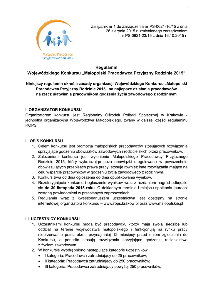 . Załącznik nr 1 do Zarządzenia nr PS-0621-16/15 z dnia 26 sierpnia 2015 r. zmienionego zarządzeniem nr PS-0621-23/15 z dnia 16.10.2015 r. Regulamin Wojewódzkiego Konkursu „Małopolski Pracodawca Przyjazny Rodzinie 2015” Niniejszy regulamin określa zasady organizacji Wojewódzkiego Konkursu „Małopolski Pracodawca Przyjazny Rodzinie 2015” na najlepsze działania pracodawców na rzecz ułatwiania pracownikom godzenia życia zawodowego z rodzinnym I. ORGANIZATOR KONKURSU Organizatorem konkursu jest Regionalny Ośrodek Polityki Społecznej w Krakowie jednostka organizacyjna Województwa Małopolskiego, zwany w dalszej części regulaminu ROPS. II. OPIS KONKURSU 1. Celem konkursu jest promocja małopolskich pracodawców stosujących rozwiązania sprzyjające godzeniu obowiązków zawodowych i rodzicielskich przez pracowników. 2. Założeniem konkursu jest wyłonienie Małopolskiego Pracodawcy Przyjaznego Rodzinie 2015, który wykraczając poza obowiązki uregulowane w powszechnie obowiązujących przepisach prawa pracy, stosuje również inne rozwiązania mające na celu wsparcie pracowników w godzeniu życia zawodowego z rodzinnym. 3. Konkurs trwa od dnia ogłoszenia do dnia opublikowania wyników. 4. Rozstrzygnięcie konkursu i ogłoszenie wyników wraz z rozdaniem nagród odbędzie się do 30 listopada 2015 roku. O dokładnym terminie i miejscu spotkania laureaci zostaną powiadomieni w przesłanych zaproszeniach. 5. Regulamin wraz z kwestionariuszem uczestnictwa jest dostępny na stronie internetowej organizatora konkursu – www.rops.krakow.pl oraz www.malopolskie.pl III. UCZESTNICY KONKURSU 1. Uczestnikami konkursu mogą być pracodawcy, którzy mają swoją siedzibę lub oddział na terenie województwa małopolskiego i funkcjonują na rynku pracy nieprzerwanie przez okres przynajmniej 12 miesięcy przed dniem zgłoszenia do Konkursu, a ponadto stosują rozwiązania sprzyjające godzeniu rodzicielstwa z życiem zawodowym. 2. W konkursie wyodrębniono następujące kategorie uczestników: I kategoria: Pracodawca zatrudniający do 25 pracowników; II kategoria: Pracodawca zatrudniający do 250 pracowników; III kategoria: Pracodawca zatrudniający powyżej 250 pracowników; . IV. WARUNKI UCZESTNICTWA W KONKURSIE 1. Przystąpienie do konkursu następuje poprzez dostarczenie kwestionariusza uczestnictwa (załącznik nr 1) w terminie do 26 października 2015 roku: w wersji elektronicznej na adres e - mail: [email protected] oraz w wersji papierowej na adres: Regionalny Ośrodek Polityki Społecznej w Krakowie, ul. Piastowska 32, 30-070 Kraków 2. Kwestionariusz powinien być wypełniony komputerowo, maszynowo lub pismem drukowanym. 3. Wypełnienie i wysłanie kwestionariusza uczestnictwa w konkursie oznacza akceptację Regulaminu Konkursu przez Uczestnika. 4. Do kwestionariusza uczestnictwa w konkursie fakultatywnie można dołączyć materiały/dokumenty (będące załącznikami do kwestionariusza) świadczące o podejmowanych przez Uczestnika konkursu działaniach na rzecz ułatwiania godzenia obowiązków zawodowych i rodzicielskich przez pracowników. Kwestionariusze uczestnictwa w konkursie nie spełniające powyższych warunków oraz nadesłane po terminie nie będą rozpatrywane przez Komisję Konkursową. V. ZAŁOŻENIA ORGANIZACYJNE 1. Nadesłane egzemplarze kwestionariuszy wraz z załącznikami przechodzą nieodpłatnie na własność organizatora konkursu i nie będą zwracane uczestnikom konkursu. 2. Na etapie weryfikacji zgłoszeń do konkursu organizator może poprosić o uszczegółowienie nadesłanego kwestionariusza lub o dodatkowe informacje. Organizator zastrzega sobie również prawo do wizytacji zgłoszonych podmiotów. VI. KOMISJA KONKURSOWA 1. Działania pracodawców na rzecz ułatwiania pracownikom godzenia życia zawodowego z rodzinnym będzie oceniać Komisja Konkursowa powołana przez organizatora konkursu. 2. W skład Komisji wchodzą: przedstawiciele Komisji Polityki Prorodzinnej i Społecznej Sejmiku Województwa Małopolskiego, przedstawiciele Departamentu Zdrowia i Polityki Społecznej UMWM, przedstawiciele Regionalnego Ośrodka Polityki Społecznej w Krakowie, przedstawiciele Wojewódzkiego Urzędu Pracy, przedstawiciele organizacji pozarządowych oraz reprezentanci podmiotów patronujących inicjatywie. 3. Członkowie Komisji pełnią swą funkcję w okresie trwania konkursu, tj. od dnia jego ogłoszenia do dnia wyboru laureatów. Członkostwo w Komisji jest nieodpłatne. 4. Komisja Konkursowa zobowiązana jest do zachowania bezstronności i kierowania się kryteriami zapisanymi w niniejszym regulaminie. 5. Od werdyktu Komisji nie przysługuje odwołanie. VII. KRYTERIA OCENY I NAGRODY 1. Ocenie podlegać będą działania Pracodawcy ułatwiające pracownikom godzenie życia zawodowego z rodzinnym podejmowane w 2015 roku. . 2. Ocena działań realizowanych przez podmioty zgłoszone do konkursu dokonywana będzie w oparciu o następujące kryteria: Lp. Kryteria PUNKTY 1. Zatrudnienie i organizacja pracy 1. 1.1 Proces rekrutacji pracowników pozbawiony przejawów dyskryminacji ze względu na rodzicielstwo 1.2 Elastyczne formy zatrudnienia (np. praca w niepełnym wymiarze; praca w elastycznych godzinach; praca w domu; telepraca; zadaniowy czas pracy) 0-30 1.3 Zmianowy czas pracy uwzględniający sytuację rodzinną pracowników 1.4 Zapewnienie możliwości stopniowego powrotu do pracy po urlopie macierzyńskim 2. Organizacja opieki nad dziećmi pracownika 2. 2.1 Przestrzeń w miejscu pracy stworzona z myślą o rodzicach (np. pokój dla karmiącej matki, pokój do wykonywania pracy połączonej z opieką nad dzieckiem) 2.2 Prowadzenie przyzakładowego przedszkola lub żłobka dla dzieci/ dofinansowanie opieki nad dzieckiem pracownika w żłobkach i przedszkolach lub innej formy opieki 0-20 3. Materialne wsparcie pracowników w pełnieniu funkcji rodzicielskich 3.1 Bony pieniężne lub paczki okolicznościowe 3. 3.2 Dofinansowanie wyjazdów zimo