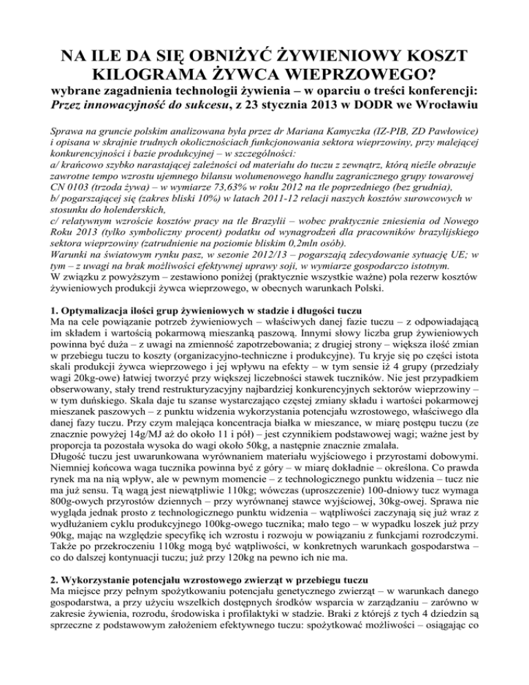 NA ILE DA SIĘ OBNIŻYĆ ŻYWIENIOWY KOSZT KILOGRAMA ŻYWCA WIEPRZOWEGO? wybrane zagadnienia technologii żywienia – w oparciu o treści konferencji: Przez innowacyjność do sukcesu, z 23 stycznia 2013 w DODR we Wrocławiu Sprawa na gruncie polskim analizowana była przez dr Mariana Kamyczka (IZ-PIB, ZD Pawłowice) i opisana w skrajnie trudnych okolicznościach funkcjonowania sektora wieprzowiny, przy malejącej konkurencyjności i bazie produkcyjnej – w szczególności: a/ krańcowo szybko narastającej zależności od materiału do tuczu z zewnątrz, którą nieźle obrazuje zawrotne tempo wzrostu ujemnego bilansu wolumenowego handlu zagranicznego grupy towarowej CN 0103 (trzoda żywa) – w wymiarze 73,63% w roku 2012 na tle poprzedniego (bez grudnia), b/ pogarszającej się (zakres bliski 10%) w latach 2011-12 relacji naszych kosztów surowcowych w stosunku do holenderskich, c/ relatywnym wzroście kosztów pracy na tle Brazylii – wobec praktycznie zniesienia od Nowego Roku 2013 (tylko symboliczny procent) podatku od wynagrodzeń dla pracowników brazylijskiego sektora wieprzowiny (zatrudnienie na poziomie bliskim 0,2mln osób). Warunki na światowym rynku pasz, w sezonie 2012/13 – pogarszają zdecydowanie sytuację UE; w tym – z uwagi na brak możliwości efektywnej uprawy soji, w wymiarze gospodarczo istotnym. W związku z powyższym – zestawiono poniżej (praktycznie wszystkie ważne) pola rezerw kosztów żywieniowych produkcji żywca wieprzowego, w obecnych warunkach Polski. 1. Optymalizacja ilości grup żywieniowych w stadzie i długości tuczu Ma na cele powiązanie potrzeb żywieniowych – właściwych danej fazie tuczu – z odpowiadającą im składem i wartością pokarmową mieszanką paszową. Innymi słowy liczba grup żywieniowych powinna być duża – z uwagi na zmienność zapotrzebowania; z drugiej strony – większa ilość zmian w przebiegu tuczu to koszty (organizacyjno-techniczne i produkcyjne). Tu kryje się po części istota skali produkcji żywca wieprzowego i jej wpływu na efekty – w tym sensie iż 4 grupy (przedziały wagi 20kg-owe) łatwiej tworzyć przy większej liczebności stawek tuczników. Nie jest przypadkiem obserwowany, stały trend restrukturyzacyjny najbardziej konkurencyjnych sektorów wieprzowiny – w tym duńskiego. Skala daje tu szanse wystarczająco częstej zmiany składu i wartości pokarmowej mieszanek paszowych – z punktu widzenia wykorzystania potencjału wzrostowego, właściwego dla danej fazy tuczu. Przy czym malejąca koncentracja białka w mieszance, w miarę postępu tuczu (ze znacznie powyżej 14g/MJ aż do około 11 i pół) – jest czynnikiem podstawowej wagi; ważne jest by proporcja ta pozostała wysoka do wagi około 50kg, a następnie znacznie zmalała. Długość tuczu jest uwarunkowana wyrównaniem materiału wyjściowego i przyrostami dobowymi. Niemniej końcowa waga tucznika powinna być z góry – w miarę dokładnie – określona. Co prawda rynek ma na nią wpływ, ale w pewnym momencie – z technologicznego punktu widzenia – tucz nie ma już sensu. Tą wagą jest niewątpliwie 110kg; wówczas (uproszczenie) 100-dniowy tucz wymaga 800g-owych przyrostów dziennych – przy wyrównanej stawce wyjściowej, 30kg-owej. Sprawa nie wygląda jednak prosto z technologicznego punktu widzenia – wątpliwości zaczynają się już wraz z wydłużaniem cyklu produkcyjnego 100kg-owego tucznika; mało tego – w wypadku loszek już przy 90kg, mając na względzie specyfikę ich wzrostu i rozwoju w powiązaniu z funkcjami rozrodczymi. Także po przekroczeniu 110kg mogą być wątpliwości, w konkretnych warunkach gospodarstwa – co do dalszej kontynuacji tuczu; już przy 120kg na pewno ich nie ma. 2. Wykorzystanie potencjału wzrostowego zwierząt w przebiegu tuczu Ma miejsce przy pełnym spożytkowaniu potencjału genetycznego zwierząt – w warunkach danego gospodarstwa, a przy użyciu wszelkich dostępnych środków wsparcia w zarządzaniu – zarówno w zakresie żywienia, rozrodu, środowiska i profilaktyki w stadzie. Braki z którejś z tych 4 dziedzin są sprzeczne z podstawowym założeniem efektywnego tuczu: spożytkować możliwości – osiągając co można w danych warunkach, a więc to na co pozwala technologia produkcji – bez szkód dla stada. Wskaźnikiem podstawowym (i miarą sukcesu funkcjonowania spójnego systemu) jest tu obniżenie zużycia paszy na kg przyrostu – ponieważ niski nakład paszy/kg przyrostu znamionuje optymalność w żywieniu, które: a/ zorganizowano w powiązaniu z funkcjami rozrodu, b/ wsparto korzystnym wpływem środowiska, c/ uzupełniono systemem profilaktyki – ograniczającym problemy zdrowotne (i straty) do minimum – adekwatnym do problemów właściwych dla różnych faz produkcji. Tu jest miejsce na podkreślenie związku wykorzystania potencjału wzrostu tuczników i warunków stad, z którego się one wywodzą. Jest i tu część odpowiedzi na pytanie o źródła rosnącego importu warchlaków, które – w coraz większym stopniu – zajmują miejsce krajowego materiału do tuczu. To po dłuższym czasie skutkuje zerwaniem związku polskiego sektora wieprzowiny z krajową bazą produkcyjną (ze wszystkimi możliwymi skutkami długofalowymi). Tu jest także miejsce na zwrócenie uwagi na wyniki loszek i wieprzków – pod względem zużycia paszy/kg przyrostu. To jest coś czego nie można zbagatelizować – mając na względzie organizację żywienia w dużym gospodarstwie i całość kosztów produkcji. W przebiegu cyklu produkcyjnego – najszybszy wzrost obserwujemy u tucznika w przedziale wagi 60-70kg, a więc mniej więcej w połowie jego trwania. Natomiast w dalszym okresie tuczu niestety już widzimy tendencję do zwiększenia odkładania tłuszczu – szczególnie gdy w żywieniu określone minimum zapotrzebowania jest przekraczane (z różnych powodów). 3. Uwzględnienie ograniczeń dawkowania ważniejszych komponentów paszowych 