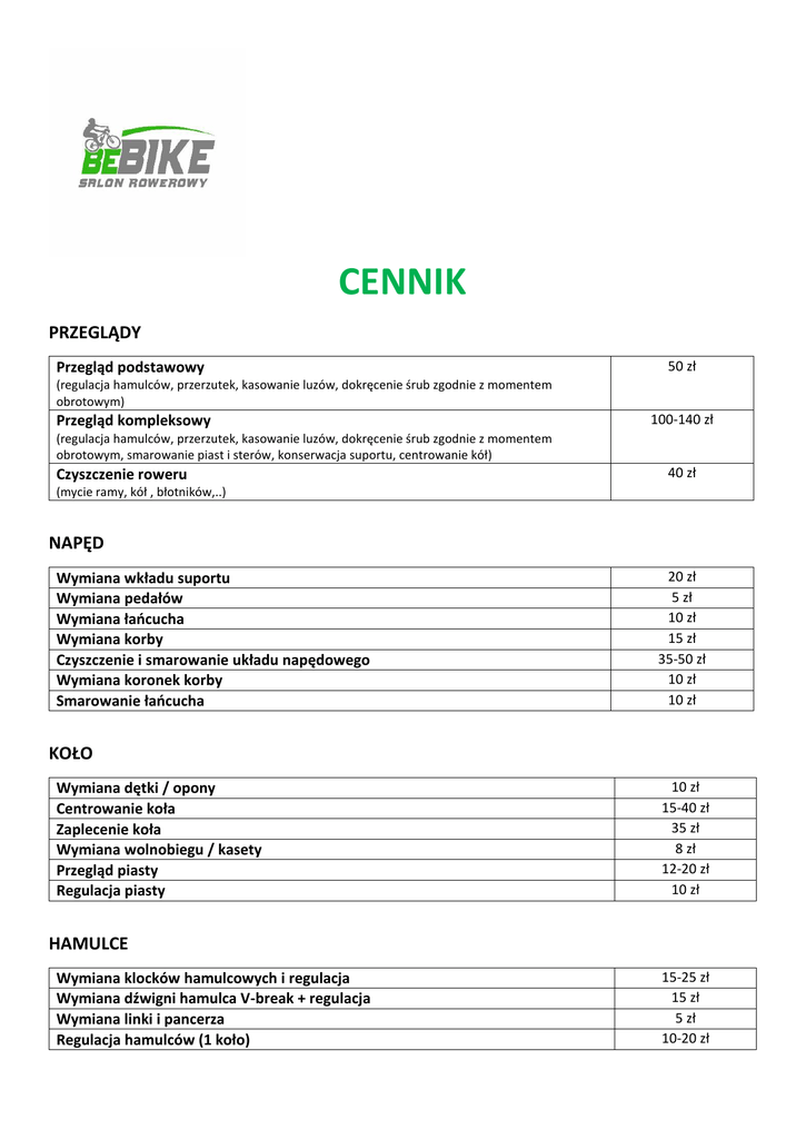 CENNIK PRZEGLĄDY Przegląd podstawowy 50 zł (regulacja hamulców, przerzutek, kasowanie luzów, dokręcenie śrub zgodnie z momentem obrotowym) Przegląd kompleksowy 100-140 zł (regulacja hamulców, przerzutek, kasowanie luzów, dokręcenie śrub zgodnie z momentem obrotowym, smarowanie piast i sterów, konserwacja suportu, centrowanie kół) Czyszczenie roweru 40 zł (mycie ramy, kół , błotników,..) NAPĘD Wymiana wkładu suportu Wymiana pedałów Wymiana łańcucha Wymiana korby Czyszczenie i smarowanie układu napędowego Wymiana koronek korby Smarowanie łańcucha 20 zł 5 zł 10 zł 15 zł 35-50 zł 10 zł 10 zł KOŁO Wymiana dętki / opony Centrowanie koła Zaplecenie koła Wymiana wolnobiegu / kasety Przegląd piasty Regulacja piasty 10 zł 15-40 zł 35 zł 8 zł 12-20 zł 10 zł HAMULCE Wymiana klocków hamulcowych i regulacja Wymiana dźwigni hamulca V-break + regulacja Wymiana linki i pancerza Regulacja hamulców (1 koło) 15-25 zł 15 zł 5 zł 10-20 zł UKŁAD KIEROWNICZY Wymiana widelca - amortyzatora Wymiana wspornika kierownicy Montaż owijki Przegląd / Smarowanie sterów Montaż chwytów Regulacja łożysk sterów 30 zł 15 zł 20 zł 20 zł 5-10 zł 10 zł PRZERZUTKI Wymiana manetki Regulacja przerzutki przedniej Regulacja przerzutki tylnej Wymiana i regulacja przerzutki przedniej Wymiana i regulacja przerzutki tylnej Wymiana linki, pancerza 10 zł 15 zł 12 zł 30 zł 25 zł 10 zł RAMA Wymiana ramy Złożenie roweru Montaż siodła Wymiana sztycy podsiodłowej Montaż fotelika dziecięcego Montaż błotników Montaż koszyka Montaż bagażnika Montaż podpórki (nóżki) Montaż rogów Montaż licznika 100-200 zł 100-200 zł 10 zł 10 zł 10 zł 5-25 zł 10 zł 20 zł 5 zł 5 zł 5-10 zł