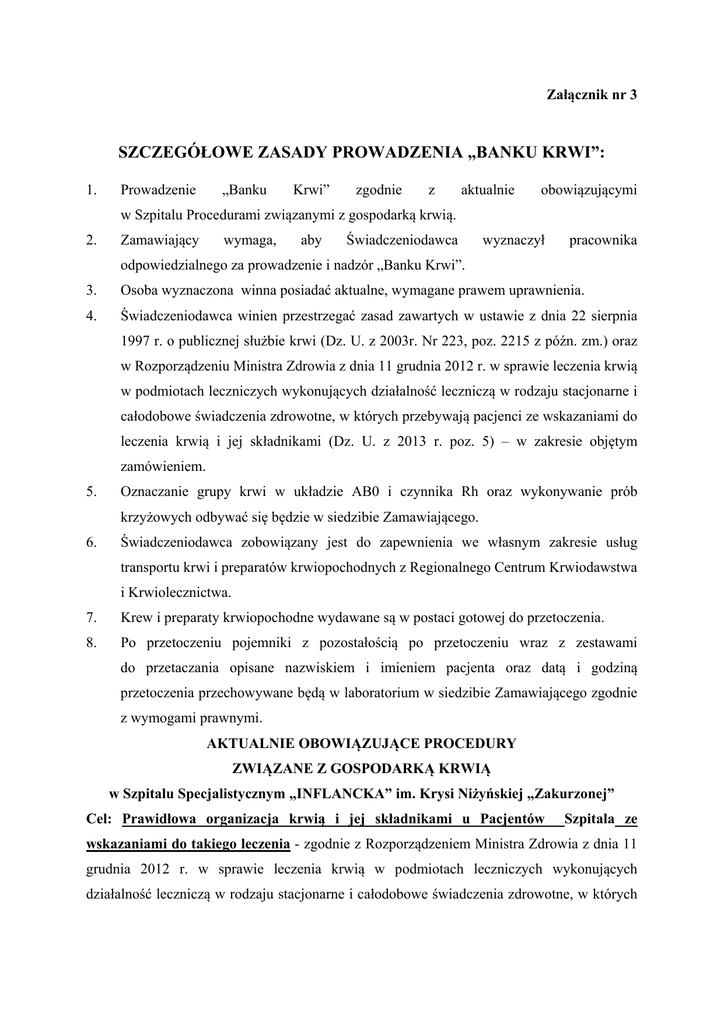 Załącznik nr 3 SZCZEGÓŁOWE ZASADY PROWADZENIA „BANKU KRWI”: 1. Prowadzenie „Banku Krwi” zgodnie z aktualnie obowiązującymi w Szpitalu Procedurami związanymi z gospodarką krwią. 2. Zamawiający wymaga, aby Świadczeniodawca wyznaczył pracownika odpowiedzialnego za prowadzenie i nadzór „Banku Krwi”. 3. Osoba wyznaczona winna posiadać aktualne, wymagane prawem uprawnienia. 4. Świadczeniodawca winien przestrzegać zasad zawartych w ustawie z dnia 22 sierpnia 1997 r. o publicznej służbie krwi (Dz. U. z 2003r. Nr 223, poz. 2215 z późn. zm.) oraz w Rozporządzeniu Ministra Zdrowia z dnia 11 grudnia 2012 r. w sprawie leczenia krwią w podmiotach leczniczych wykonujących działalność leczniczą w rodzaju stacjonarne i całodobowe świadczenia zdrowotne, w których przebywają pacjenci ze wskazaniami do leczenia krwią i jej składnikami (Dz. U. z 2013 r. poz. 5) – w zakresie objętym zamówieniem. 5. Oznaczanie grupy krwi w układzie AB0 i czynnika Rh oraz wykonywanie prób krzyżowych odbywać się będzie w siedzibie Zamawiającego. 6. Świadczeniodawca zobowiązany jest do zapewnienia we własnym zakresie usług transportu krwi i preparatów krwiopochodnych z Regionalnego Centrum Krwiodawstwa i Krwiolecznictwa. 7. Krew i preparaty krwiopochodne wydawane są w postaci gotowej do przetoczenia. 8. Po przetoczeniu pojemniki z pozostałością po przetoczeniu wraz z zestawami do przetaczania opisane nazwiskiem i imieniem pacjenta oraz datą i godziną przetoczenia przechowywane będą w laboratorium w siedzibie Zamawiającego zgodnie z wymogami prawnymi. AKTUALNIE OBOWIĄZUJĄCE PROCEDURY ZWIĄZANE Z GOSPODARKĄ KRWIĄ w Szpitalu Specjalistycznym „INFLANCKA” im. Krysi Niżyńskiej „Zakurzonej” Cel: Prawidłowa organizacja krwią i jej składnikami u Pacjentów Szpitala ze wskazaniami do takiego leczenia - zgodnie z Rozporządzeniem Ministra Zdrowia z dnia 11 grudnia 2012 r. w sprawie leczenia krwią w podmiotach leczniczych wykonujących działalność leczniczą w rodzaju stacjonarne i całodobowe świadczenia zdrowotne, w których przebywają pacjenci ze wskazaniami do leczenia krwią i jej składnikami (Dz. U. z 2013r. poz.5). Dotyczy: Lekarze/pielęgniarki/położne/pracownicy laboratorium Zakres: Procedura ma zastosowanie w przypadku zakwalifikowania pacjenta hospitalizowanego w Szpitalu do leczenia krwią lub preparatami krwiopochodnymi Zasady postępowania: Zapewnienie całodobowej dostępności do leczenia krwią i jej składnikami 1. W strukturze Szpitala zadania Banku Krwi sprawuje Dział Diagnostyki Laboratoryjnej (DDL). 2. Krew i jej składniki dla pacjentów Szpitala zgodnie z umową o współpracy zapewnia Regionalne Centrum Krwiodawstwa i Krwiolecznictwa (RCKiK) ul. Saska 63/75, 03958 Warszawa, tel. (22) 617-75-81, które sprawuje także merytoryczny nadzór nad prawidłowością Standardowych Procedur Operacyjnych dotyczących tego zagadnienia. 3. Badania serologiczne dla pacjentów Szpitala (grupy krwi i próby zgodności) wykonuje zewnętrzne laboratorium medyczne zgodnie z umową. 4. Zlecenie badań serologicznych odbywa się zgodnie ze Standardową Procedurą Operacyjną Laboratorium Medycznego. 5. Pobieranie materiału do badań odbywa się zgodnie z procedurami w Szpitalu. Transport materiału do badań odbywa się zgodnie z procedurami w/w Laboratorium Diagnostycznego. 6. Wynik badań serologicznych przekazywane są do laboratorium w siedzibie Szpitala. 7. Krew i jej składniki zamówione w RCKiK dla pacjentów Szpitala, które wymagają wykonania próby krzyżowej, są bezpośrednio przekazywane do Laboratorium. 8. Laboratorium jest odpowiedzialne za wydawanie krwi i preparatów krwiopochodnych w postaci gotowej do przetaczania. 9. Pojemniki z pozostałością po przetoczeniu wraz z zestawami do przetaczania opisane nazwiskiem i imieniem pacjenta oraz datą i godziną przetoczenia przekazywane są do laboratorium. 10. Za koordynowanie działań związanych z krwiolecznictwem i dokumentowaniem działań związanych z leczeniem krwią i jej składnikami odpowiada lekarz odpowiedzialny za gospodarkę krwią w Szpitalu, który odbywa przeszkolenie w RCKiK w Warszawie nie rzadziej niż co 4 lata. 11. Do zadań Lekarza wyznaczonego przez Dyrektora Szpitala jako odpowiedzialnego za gospodarkę krwią należy w szczególności: • opracowanie Standardowych Procedur Operacyjnych i nadzorowanie ich przestrzegania, • szkolenie pracowników medycznych (lekarzy, pielęgniarek i położnych) w zakresie organizacji krwiolecznictwa, • rejestrowanie i sporządzanie raportów o wszelkich nieprzewidzianych zdarzeniach, a w szczególności o błędach i wypadkach związanych z przetoczeniem, • niezwłoczne informowanie o tym fakcie RCKiK oraz informowanie Dyrektora Szpitala, • sporządzenie i przekazywanie do RCKiK sprawozdań z działalności w zakresie krwiolecznictwa, • 12. • nadzorowanie prawidłowości prowadzenia książek transfuzyjnych. Kierownik Pracowni Diagnostyki Laboratoryjnej jest odpowiedzialny za: kompletowanie Standardowych Procedur Operacyjnych w zakresie pobierania materiału do badania i jego transportu od zewnętrznego Laboratorium Diagnostycznego świadczącego usługi w zakresie badań serologicznych dla Szpitala zgodnie z umową oraz sprawowanie nadzoru nad ich przestrzeganiem, • opracowywanie wspólnie z lekarzem odpowiedzialnym za gospodarkę krwią Standardowych Procedur Operacyjnych, • weryfikację prawidłowości i kompletności wystawianych skierowań, • nadzór nad prawidłowością rejestrowania próbek krwi i skierowań przekazanych do laboratorium, • nadzorowanie procedur mycia i dezynfekcji lodówki do przechowywania krwi i jej składników, • walidacje lodówki służącej do czasowego przechowywania krwi dostarczonej z RCKiK, • nadzór nad warunkami przechowywania krwi przed wydaniem jej do oddziałów oraz nad warunkami przechowywania pojemników z pozostałością po transfuzji krwi i jej s