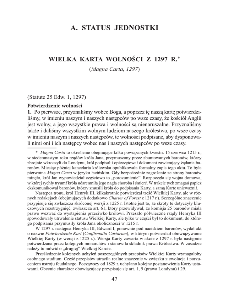A. STATUS JEDNOSTKI WIELKA KARTA WOLNOŚCI Z 1297 R.* (Magna Carta, 1297) (Statute 25 Edw. 1, 1297) Potwierdzenie wolności 1. Po pierwsze, przyznaliśmy wobec Boga, a poprzez tę naszą kartę potwierdziliśmy, w imieniu naszym i naszych następców po wsze czasy, że kościół Anglii jest wolny, a jego wszystkie prawa i wolności są nienaruszalne. Przyznaliśmy także i daliśmy wszystkim wolnym ludziom naszego królestwa, po wsze czasy w imieniu naszym i naszych następców, te wolności podpisane, aby dysponowali nimi oni i ich następcy wobec nas i naszych następców po wsze czasy. * Magna Carta to określenie obejmujące kilka powiązanych kwestii. 15 czerwca 1215 r., w siedemnastym roku rządów króla Jana, przymuszony przez zbuntowanych baronów, którzy zbrojnie wkroczyli do Londynu, król podpisał i opieczętował dokument zawierający żądania baronów. Miesiąc później kancelaria królewska opublikowała formalny zapis tego aktu. To była pierwotna Magna Carta w języku łacińskim. Gdy bezpośrednie zagrożenie ze strony baronów minęło, król Jan wypowiedział częściowo to „porozumienie”. Rozpoczęła się wojna domowa, w której rychły tryumf króla udaremniła jego nagła choroba i śmierć. W trakcie tych zmagań papież ekskomunikował baronów, którzy zmusili króla do podpisania Karty, a samą Kartę unieważnił. Następca tronu, król Henryk III, kilkakrotnie potwierdzał treść Wielkiej Karty, ale w różnych redakcjach (obejmujących dodatkowo Charter of Forest z 1217 r.). Szczególne znaczenie przypisuje się zwłaszcza skróconej wersji z 1225 r. Istotne jest to, że skróty te dotyczyły kluczowych rozstrzygnięć, zwłaszcza art. 61, który przewidywał, że komisja 25 baronów miała prawo wezwać do wystąpienia przeciwko królowi. Przeszło półwieczne rządy Henryka III spowodowały utrwalenie statusu Wielkiej Karty, ale tylko w części był to dokument, do którego podpisania przymusiły króla Jana okoliczności w 1215 r. W 1297 r. następca Henryka III, Edward I, ponownie pod naciskiem baronów, wydał akt o nazwie Potwierdzenie Kart (Confirmatio Cartarum), w którym potwierdził obowiązywanie Wielkiej Karty (w wersji z 1225 r.). Wersja Karty zawarta w akcie z 1297 r. była następnie potwierdzana przez kolejnych monarchów i stanowiła składnik prawa Królestwa. W zasadzie należy tu mówić o „drugiej” Wielkiej Karcie. Prześledzenie kolejnych uchyleń poszczególnych przepisów Wielkiej Karty wymagałoby osobnego studium. Część przepisów utraciła realne znaczenie w związku z ewolucją i porzuceniem ustroju feudalnego. Począwszy od 1829 r. uchylano kolejne postanowienia Karty ustawami. Obecnie charakter obowiązujący przypisuje się art. 1, 9 (prawa Londynu) i 29. 47 Uwięzienie itp. niezgodne z prawem 29. Żaden wolny człowiek nie zostanie zatrzymany lub uwięziony, ani wyzuty z jego własności lub wolności, lub swobodnych obyczajów, ani wyjęty spod prawa lub wygnany, ani w żaden inny sposób nie zostanie naruszony jego status; ani nie zastosujemy wobec niego siły i nie skłonimy innych do tego, bez prawowitego wyroku równych mu lub bez podstawy w prawie krajowym. Nikomu nie odmówimy prawa i sprawiedliwości ani ich nie wstrzymamy i nie sprzedamy. 48