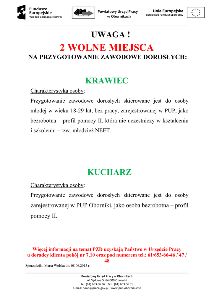 Powiatowy Urząd Pracy w Obornikach UWAGA ! 2 WOLNE MIEJSCA NA PRZYGOTOWANIE ZAWODOWE DOROSŁYCH: KRAWIEC Charakterystyka osoby: Przygotowanie zawodowe dorosłych skierowane jest do osoby młodej w wieku 18-29 lat, bez pracy, zarejestrowanej w PUP, jako bezrobotna – profil pomocy II, która nie uczestniczy w kształceniu i szkoleniu – tzw. młodzież NEET. KUCHARZ Charakterystyka osoby: Przygotowanie zawodowe dorosłych skierowane jest do osoby zarejestrowanej w PUP Oborniki, jako osoba bezrobotna – profil pomocy II. Więcej informacji na temat PZD uzyskają Państwo w Urzędzie Pracy u doradcy klienta pokój nr 7,10 oraz pod numerem tel.: 61/653-66-46 / 47 / 48 Sporządziła: Marta Wolska dn. 08.06.2015 r. Powiatowy Urząd Pracy w Obornikach ul. Sądowa 5, 64-600 Oborniki tel. (61) 653 66 36 fax. (61) 653 66 31 e-mail: [email protected] www.pup.oborniki.info