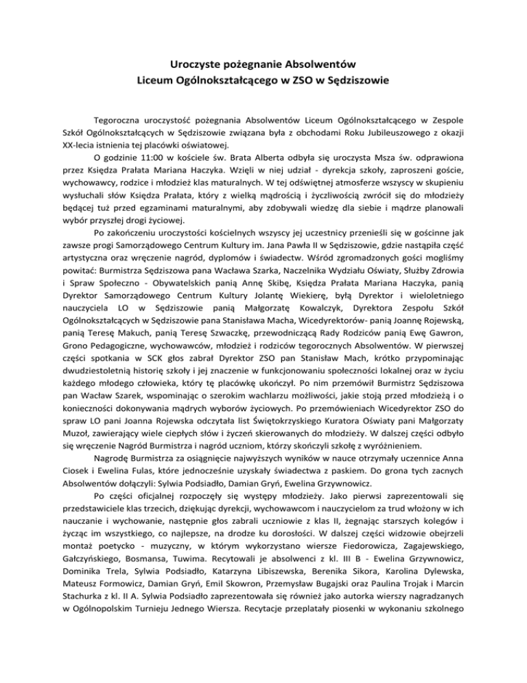 Uroczyste pożegnanie Absolwentów Liceum Ogólnokształcącego w ZSO w Sędziszowie Tegoroczna uroczystość pożegnania Absolwentów Liceum Ogólnokształcącego w Zespole Szkół Ogólnokształcących w Sędziszowie związana była z obchodami Roku Jubileuszowego z okazji XX-lecia istnienia tej placówki oświatowej. O godzinie 11:00 w kościele św. Brata Alberta odbyła się uroczysta Msza św. odprawiona przez Księdza Prałata Mariana Haczyka. Wzięli w niej udział - dyrekcja szkoły, zaproszeni goście, wychowawcy, rodzice i młodzież klas maturalnych. W tej odświętnej atmosferze wszyscy w skupieniu wysłuchali słów Księdza Prałata, który z wielką mądrością i życzliwością zwrócił się do młodzieży będącej tuż przed egzaminami maturalnymi, aby zdobywali wiedzę dla siebie i mądrze planowali wybór przyszłej drogi życiowej. Po zakończeniu uroczystości kościelnych wszyscy jej uczestnicy przenieśli się w gościnne jak zawsze progi Samorządowego Centrum Kultury im. Jana Pawła II w Sędziszowie, gdzie nastąpiła część artystyczna oraz wręczenie nagród, dyplomów i świadectw. Wśród zgromadzonych gości mogliśmy powitać: Burmistrza Sędziszowa pana Wacława Szarka, Naczelnika Wydziału Oświaty, Służby Zdrowia i Spraw Społeczno - Obywatelskich panią Annę Skibę, Księdza Prałata Mariana Haczyka, panią Dyrektor Samorządowego Centrum Kultury Jolantę Wiekierę, byłą Dyrektor i wieloletniego nauczyciela LO w Sędziszowie panią Małgorzatę Kowalczyk, Dyrektora Zespołu Szkół Ogólnokształcących w Sędziszowie pana Stanisława Macha, Wicedyrektorów- panią Joannę Rojewską, panią Teresę Makuch, panią Teresę Szwaczkę, przewodniczącą Rady Rodziców panią Ewę Gawron, Grono Pedagogiczne, wychowawców, młodzież i rodziców tegorocznych Absolwentów. W pierwszej części spotkania w SCK głos zabrał Dyrektor ZSO pan Stanisław Mach, krótko przypominając dwudziestoletnią historię szkoły i jej znaczenie w funkcjonowaniu społeczności lokalnej oraz w życiu każdego młodego człowieka, który tę placówkę ukończył. Po nim przemówił Burmistrz Sędziszowa pan Wacław Szarek, wspominając o szerokim wachlarzu możliwości, jakie stoją przed młodzieżą i o konieczności dokonywania mądrych wyborów życiowych. Po przemówieniach Wicedyrektor ZSO do spraw LO pani Joanna Rojewska odczytała list Świętokrzyskiego Kuratora Oświaty pani Małgorzaty Muzoł, zawierający wiele ciepłych słów i życzeń skierowanych do młodzieży. W dalszej części odbyło się wręczenie Nagród Burmistrza i nagród uczniom, którzy skończyli szkołę z wyróżnieniem. Nagrodę Burmistrza za osiągnięcie najwyższych wyników w nauce otrzymały uczennice Anna Ciosek i Ewelina Fulas, które jednocześnie uzyskały świadectwa z paskiem. Do grona tych zacnych Absolwentów dołączyli: Sylwia Podsiadło, Damian Gryń, Ewelina Grzywnowicz. Po części oficjalnej rozpoczęły się występy młodzieży. Jako pierwsi zaprezentowali się przedstawiciele klas trzecich, dziękując dyrekcji, wychowawcom i nauczycielom za trud włożony w ich nauczanie i wychowanie, następnie głos zabrali uczniowie z klas II, żegnając starszych kolegów i życząc im wszystkiego, co najlepsze, na drodze ku dorosłości. W dalszej części widzowie obejrzeli montaż poetycko - muzyczny, w którym wykorzystano wiersze Fiedorowicza, Zagajewskiego, Gałczyńskiego, Bosmansa, Tuwima. Recytowali je absolwenci z kl. III B - Ewelina Grzywnowicz, Dominika Trela, Sylwia Podsiadło, Katarzyna Libiszewska, Berenika Sikora, Karolina Dylewska, Mateusz Formowicz, Damian Gryń, Emil Skowron, Przemysław Bugajski oraz Paulina Trojak i Marcin Stachurka z kl. II A. Sylwia Podsiadło zaprezentowała się również jako autorka wierszy nagradzanych w Ogólnopolskim Turnieju Jednego Wiersza. Recytacje przeplatały piosenki w wykonaniu szkolnego zespołu wokalno - instrumentalnego "Bezlitośnie Utalentowani" z repertuaru KOMBII, Dżemu, Bajmu, T.Love, Bon Jovi, Anny Jantar, Leonadra Cohena. Publiczność bawiła się znakomicie przy wielkich hitach, śpiewanych przez zespół, lecz szczególny aplauz uzyskało wykonanie piosenki "It's my life". Grupę tworzą uczniowie LO: Paulina Trojak - wokal, gitara prowadząca; Michał "Misza" Liburski wokal, gitara elektryczna, instrumenty perkusyjne; wokalistki - Ewelina Siwiec, Martyna Domagała, Karolina Dylewska. Gościnnie wystąpił Wojciech "Wojtas" Leśniewski jako muzyk grający na gitarze basowej. Zespół wokalno - instrumentalny funkcjonuje pod opieką pani Marii Trojak. Dużym zaskoczeniem dla publiczności był występ kabaretowy w wykonaniu Mateusza Formowicza i Marcina Stachurki. Rozbawili oni widzów nowatorską interpretacją "Chłopów" czy też wielce żartobliwą Inwokacją z "Pana Tadeusza", opiewającą uroki szkoły. Montaż poetycko - muzyczny, kabaret i część wokalno - instrumentalna zostały przygotowane przez panią Marię Trojak. Nad dyscypliną podczas prób w SCK pomagała czuwać pani Wioletta Lagierska, zaś fantastyczna, wiosenna i pachnąca dekoracja sceny była dziełem pani Marty Malanowicz, pani Iwony Janowskiej oraz młodszych kolegów z gimnazjum. Po udanych występach przyszedł czas na rozdanie świadectw ukończenia szkoły średniej, nagród za osiągnięcie bardzo dobrych wyników, działalność społeczną i udział w konkursach. A później już tylko kwiaty, podziękowania, ukradkiem ocierane łzy i pamiątkowe fotografie... Naszym Drogim Absolwentom życzymy dobrze napisanej matury i dostania się na wymarzony kierunek studiów. Udanego dorosłego życia i wszelkiej pomyślności! "Do zobaczenia w dorosłym życiu na innej drodze, na innym szlaku. Z bagażem wspomnień na dnie, w ukryciu Wśród masy pytań w pełnym plecaku." [T. Fiedorowicz] Maria Trojak