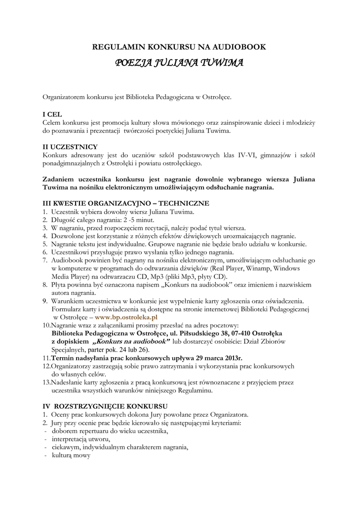 REGULAMIN KONKURSU NA AUDIOBOOK POEZJA JULIANA TUWIMA Organizatorem konkursu jest Biblioteka Pedagogiczna w Ostrołęce. I CEL Celem konkursu jest promocja kultury słowa mówionego oraz zainspirowanie dzieci i młodzieży do poznawania i prezentacji twórczości poetyckiej Juliana Tuwima. II UCZESTNICY Konkurs adresowany jest do uczniów szkół podstawowych klas IV-VI, gimnazjów i szkół ponadgimnazjalnych z Ostrołęki i powiatu ostrołęckiego. Zadaniem uczestnika konkursu jest nagranie dowolnie wybranego wiersza Juliana Tuwima na nośniku elektronicznym umożliwiającym odsłuchanie nagrania. III KWESTIE ORGANIZACYJNO – TECHNICZNE 1. Uczestnik wybiera dowolny wiersz Juliana Tuwima. 2. Długość całego nagrania: 2 -5 minut. 3. W nagraniu, przed rozpoczęciem recytacji, należy podać tytuł wiersza. 4. Dozwolone jest korzystanie z różnych efektów dźwiękowych urozmaicających nagranie. 5. Nagranie tekstu jest indywidualne. Grupowe nagranie nie będzie brało udziału w konkursie. 6. Uczestnikowi przysługuje prawo wysłania tylko jednego nagrania. 7. Audiobook powinien być nagrany na nośniku elektronicznym, umożliwiającym odsłuchanie go w komputerze w programach do odtwarzania dźwięków (Real Player, Winamp, Windows Media Player) na odtwarzaczu CD, Mp3 (pliki Mp3, płyty CD). 8. Płyta powinna być oznaczona napisem „Konkurs na audiobook” oraz imieniem i nazwiskiem autora nagrania. 9. Warunkiem uczestnictwa w konkursie jest wypełnienie karty zgłoszenia oraz oświadczenia. Formularz karty i oświadczenia są dostępne na stronie internetowej Biblioteki Pedagogicznej w Ostrołęce – www.bp.ostroleka.pl 10.Nagranie wraz z załącznikami prosimy przesłać na adres pocztowy: Biblioteka Pedagogiczna w Ostrołęce, ul. Piłsudskiego 38, 07-410 Ostrołęka z dopiskiem „Konkurs na audiobook” lub dostarczyć osobiście: Dział Zbiorów Specjalnych, parter pok. 24 lub 26). 11.Termin nadsyłania prac konkursowych upływa 29 marca 2013r. 12.Organizatorzy zastrzegają sobie prawo zatrzymania i wykorzystania prac konkursowych do własnych celów. 13.Nadesłanie karty zgłoszenia z pracą konkursową jest równoznaczne z przyjęciem przez uczestnika wszystkich warunków niniejszego Regulaminu. IV ROZSTRZYGNIĘCIE KONKURSU 1. Oceny prac konkursowych dokona Jury powołane przez Organizatora. 2. Jury przy ocenie prac będzie kierowało się następującymi kryteriami: - doborem repertuaru do wieku uczestnika, - interpretacją utworu, - ciekawym, indywidualnym charakterem nagrania, - kulturą mowy 3. Prace konkursowe będą oceniane w trzech kategoriach wiekowych: szkoła podstawowa kl.IVVI, gimnazjum i szkoła ponadgimnazjalna. 4. Autorzy najlepszych prac zostaną poinformowani telefonicznie o szczegółach finału, który odbędzie się 17 kwietnia 2013r. 5. Organizator zastrzega sobie prawo do przesunięcia terminu rozstrzygnięcia konkursu. 6. Wyniki konkursu wraz nagrodzonymi pracami będą zamieszczone na stronie internetowej Biblioteki. 7. Jury zastrzega sobie prawo do nie rozstrzygnięcia konkursu. Dla zwycięzców Organizator przewiduje nagrody – niespodzianki.
