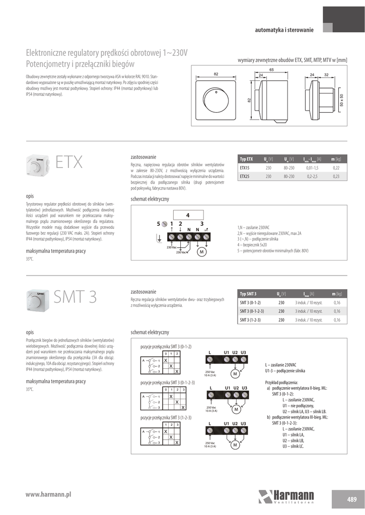 automatyka i sterowanie Elektroniczne regulatory prędkości obrotowej 1~230V Potencjometry i przełączniki biegów wymiary zewnętrzne obudów ETX, SMT, MTP, MTV w [mm] Obudowy zewnętrzne zostały wykonane z odpornego tworzywa ASA w kolorze RAL 9010. Standardowo wyposażone są w puszkę umożliwiającą montaż natynkowy. Po zdjęciu spodniej części obudowy możliwy jest montaż podtynkowy. Stopień ochrony: IP44 (montaż podtynkowy) lub IP54 (montaż natynkowy). ETX opis Tyrystorowy regulator prędkości obrotowej do silników (wentylatorów) jednofazowych. Możliwość podłączenia dowolnej ilości urządzeń pod warunkiem nie przekraczania maksymalnego prądu znamionowego określonego dla regulatora. Wszystkie modele mają dodatkowe wyjście dla przewodu fazowego bez regulacji (230 VAC maks. 2A). Stopień ochrony IP44 (montaż podtynkowy), IP54 (montaż natynkowy). zastosowanie Ręczna, napięciowa regulacja obrotów silników wentylatorów w zakresie 80-230V, z możliwością wyłączenia urządzenia. Podczas instalacji należy dostosować napięcie minimalne do wartości bezpiecznej dla podłączanego silnika (drugi potencjometr pod pokrywką, fabryczna nastawa 80V). Un [V] Uw [V] Imin- Imax [A] m [kg] ETX15 230 80-230 0,01-1,5 0,22 ETX25 230 80-230 0,2-2,5 0,23 Typ ETX schemat elektryczny 1,N – zasilanie 230VAC 2,N – wyjście nieregulowane 230VAC, max 2A 3 (~,N) – podłączenie silnika 4 – bezpiecznik 5x20 5 – potencjometr obrotów minimalnych (fabr. 80V) maksymalna temperatura pracy 35°C. SMT 3 opis Przełącznik biegów do jednofazowych silników (wentylatorów) wielobiegowych. Możliwość podłączenia dowolnej ilości urządzeń pod warunkiem nie przekraczania maksymalnego prądu znamionowego określonego dla przełącznika (3A dla obciąż. indukcyjnego, 10A dla obciąż. rezystancyjnego). Stopień ochrony IP44 (montaż podtynkowy), IP54 (montaż natynkowy). maksymalna temperatura pracy 35°C. zastosowanie Typ SMT 3 Ręczna regulacja silników wentylatorów dwu- oraz trzybiegowych z możliwością wyłączenia urządzenia. Un [V] Imax [A] m [kg] SMT 3 (0-1-2) 230 3 induk. / 10 rezyst. 0,16 SMT 3 (0-1-2-3) 230 3 induk. / 10 rezyst. 0,16 SMT 3 (1-2-3) 230 3 induk. / 10 rezyst. 0,16 schemat elektryczny L – zasilanie 230VAC U1-3 – podłączenie silnika Przykład podłączenia: a) podłączenie wentylatora II-bieg. ML: SMT 3 (0-1-2): L – zasilanie 230VAC, U1 – nie podłączony, U2 – silnik LA, U3 – silnik LB. b) podłączenie wentylatora III-bieg. ML: SMT 3 (0-1-2-3): L – zasilanie 230VAC, U1 – silnik LA, U2 – silnik LB, U3 – silnik LC. 489