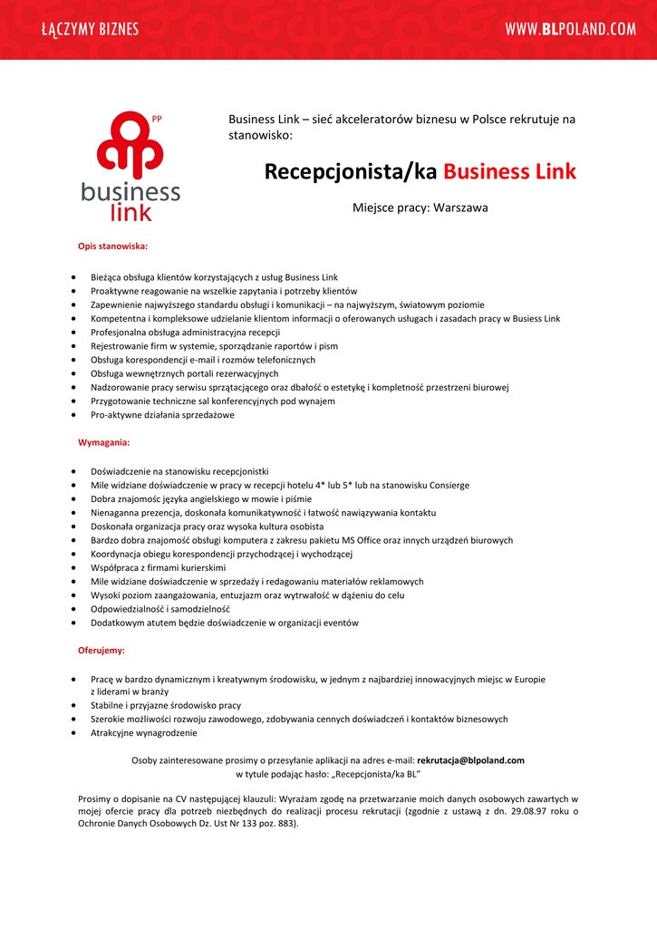 ŁĄCZYMY BIZNES WWW.BLPOLAND.COM Business Link – sieć akceleratorów biznesu w Polsce rekrutuje na stanowisko: Recepcjonista/ka Business Link Miejsce pracy: Warszawa Opis stanowiska: Bieżąca obsługa klientów korzystających z usług Business Link Proaktywne reagowanie na wszelkie zapytania i potrzeby klientów Zapewnienie najwyższego standardu obsługi i komunikacji – na najwyższym, światowym poziomie Kompetentna i kompleksowe udzielanie klientom informacji o oferowanych usługach i zasadach pracy w Busiess Link Profesjonalna obsługa administracyjna recepcji Rejestrowanie firm w systemie, sporządzanie raportów i pism Obsługa korespondencji e-mail i rozmów telefonicznych Obsługa wewnętrznych portali rezerwacyjnych Nadzorowanie pracy serwisu sprzątacjącego oraz dbałość o estetykę i kompletność przestrzeni biurowej Przygotowanie techniczne sal konferencyjnych pod wynajem Pro-aktywne działania sprzedażowe Wymagania: Doświadczenie na stanowisku recepcjonistki Mile widziane doświadczenie w pracy w recepcji hotelu 4* lub 5* lub na stanowisku Consierge Dobra znajomośc języka angielskiego w mowie i piśmie Nienaganna prezencja, doskonała komunikatywność i łatwość nawiązywania kontaktu Doskonała organizacja pracy oraz wysoka kultura osobista Bardzo dobra znajomość obsługi komputera z zakresu pakietu MS Office oraz innych urządzeń biurowych Koordynacja obiegu korespondencji przychodzącej i wychodzącej Współpraca z firmami kurierskimi Mile widziane doświadczenie w sprzedaży i redagowaniu materiałów reklamowych Wysoki poziom zaangażowania, entuzjazm oraz wytrwałość w dążeniu do celu Odpowiedzialność i samodzielność Dodatkowym atutem będzie doświadczenie w organizacji eventów Oferujemy: Pracę w bardzo dynamicznym i kreatywnym środowisku, w jednym z najbardziej innowacyjnych miejsc w Europie z liderami w branży Stabilne i przyjazne środowisko pracy Szerokie możliwości rozwoju zawodowego, zdobywania cennych doświadczeń i kontaktów biznesowych Atrakcyjne wynagrodzenie Osoby zainteresowane prosimy o przesyłanie aplikacji na adres e-mail: [email protected] w tytule podając hasło: „Recepcjonista/ka BL” Prosimy o dopisanie na CV następującej klauzuli: Wyrażam zgodę na przetwarzanie moich danych osobowych zawartych w mojej ofercie pracy dla potrzeb niezbędnych do realizacji procesu rekrutacji (zgodnie z ustawą z dn. 29.08.97 roku o Ochronie Danych Osobowych Dz. Ust Nr 133 poz. 883).