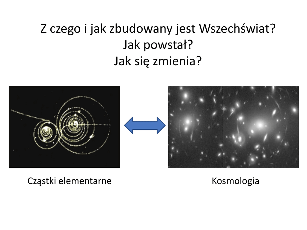 Z czego i jak zbudowany jest Wszechświat? Jak powstał? Jak się zmienia? Cząstki elementarne Kosmologia Wielkość i kształt Świata Ptolemeusz (~100 n.e. - ~165 n.e.) geocentryzm Mikołaj Kopernik (1473 – 1543) heliocentryzm Rozmiary Galaktyki: do 1600 – zbiór gwiazd (Galileusz) 1750 – dysk (I. Kant, T. Wright) Herschel (1738-1822) 1780 – Droga Mleczna jest spłaszczona, a Słońce w Centrum Rozmiary Galaktyki Kapteyn (~1920) - 5kpc Shapley (~1920) – 100kpc Halo Gwiazdy w halo Gromady kuliste pogrubienie dysk jądro Gwiazdy i gaz w dysku Obecnie: 30 kpc, Słońce 8.5 kpc od Centrum 1 pc = 3.26 roku świetlnego (r.ś.); 1 r.ś. ~9.5 biliona km 1929 – Edvin Hubble zaobserwował przesunięcia ku czerwieni (redshift) linii widmowych z odległych galaktyk i przypisał je ucieczce galaktyk z prędkością: Edvin Hubble (1889-1953) v=H*d Obserwacja Hubbla, ze wszystkie obiekty oddalają się , nie wyróżnia w żaden sposób naszego układu odniesienia. Dowolne dwa obiekty oddalać się będą w ten sam sposób. Rozszerzanie Wszechświata należy rozumieć jako rozszerzanie się przestrzeni Dowolne 2 obiekty oddalają się tak samo. Albert Einstein (1879-1955) 1916 – Równanie pola: związek pomiędzy materią a kształtem przestrzeni G µν 8π G µν = 4 T c Rozkład masy (energii) Geometria przestrzeni Rozwiązanie równania Einsteina dla ewolucji Wszechświata: (równanie Friedmanna) G – stała grawitacji ρ – gęstość materii Λ – stała kosmologiczna Geometria przestrzeni: To jaka jest geometria Wszechświata zależy od gęstości materii sferyczna k = +1 2 Λ π ρ 8 G kc 2 H = − 2 + 3 3 a płaska k=0 hiperboliczna k= -1 Ω = ρ /ρ k - ten parametr wyznacza przyszłość Wszechświata Rozmiar Wszechświata Ω < 1 (k=-1) Ω = 1 (k=0) Ω > 1 (k=+1) ok. 70 mld lat Jeśli wyznaczymy Ω, odkryjemy przyszłość Wszechświata Gęstość znanej materii stanowi zaledwie 4% gęstości krytycznej. Przypuszczalnie masy jest dużo więcej gęstość oscyluje około gęstości krytycznej Problem ciemnej materii i ciemnej energii Jak parametry Wszechświata zmieniały się w czasie? Gęstość materii: ρ m ∝ R −3 Gęstość energii promieniowania: ρ r ∝ R −4 Obecnie dominuje materia ale kiedyś dominowała energia promieniowania. Z równania Friedmanna oraz prawa Stefana-Boltzmanna: temperatura: 𝑘𝑘 = 1 MeV 𝑡(sec) Czyli na początku był gorący Wielki Wybuch Big Bang Big Bang: 1948 – George Gamow – po młodym i gorącym Wszechświecie powinna zostać pamiątka w postaci promieniowania reliktowego (tła ) Potwierdzenie teorii Wielkiego Wybuchu!!! 1965 – Arno Penzias i Robert Wilson odkrywają promieniowanie tła o temp. 2.73 K Dane z COBE satelita WMAP Era gwiazdowa (galaktyczna) Era promieniowania Era leptonowa Era plazmy kwarkowo gluonowej (hadronowa) Era Plancka Mikrokosmos Makrokosmos Cząstki = (elementarne) składniki materii Historia składników materii 17 ? Arystoteles Dalton (pierwiastki) Thomson(elektron) Rutherford(atom) Fizyka cząstek = Fizyka wysokich energii • Wysokie energie (pędy) cząstek konieczne aby : Eksp. rozproszeniowy • obserwować głeboko ukryte struktury (małe rozmiary): λ = h/p (de Broglie), ∆x ∆p ≤ ħ (Heisenberg) mikroskop o b. krótkiej fali • wytworzyć (z energii) nowe cząstki: E = mc2 (Einstein) Przyśpieszanie cząstek do wielkich energii i ich zderzanie (pocisk-tarcza, pocisk-pocisk) Zderzenia cząstek Widok na CERN. Biała linia pokazuje przebieg tunelu o długości 27 km, gdzie znajdują się pod ziemią akceleratory. Widok fragmentu tunelu, w którym znajduje się LHC Cegiełki materii nie fundamentalne (podzielne) Kryształ Molekuła Atom Jądro atomu Proton fundamentalne (niepodzielne) Kwark Podejrzenie że p i n nie są elementarne - model kwarków, ~1960 – Murray Gell-Mann Fundamentalne* cegiełki tworzące materię: (*)nie mają struktury wew. = są ‘punktowe’: d < 0.001 fm) - elektron e- , kwark u (up – górny), kwark d (down –dolny) , związane w atomach i jądrach - neutrino ν Model standardowy Teoria, która opisuje cząstki występujące w przyrodzie oraz wszystkie siły z wyjątkiem grawitacji Istnieją dwa rodzaje cząstek elementarnych - cząstki które są materią /antymaterią (leptony i kwarki), są one fermionami (spin połówkowy) - cząstki które przenoszą oddziaływania (np. fotony) - bozony. cząstki materii: – 6 leptonów (i 6 antyleptonów) - może istnieć samodzielnie – 6 kwarków (i 6 antykwarków) – o ułamkowych ładunkach elektrycznych nie mogą istnieć samodzielnie. Cztery oddziaływania • grawitacyjne poza „modelem standardowym” W ramach Modelu standardowego • elektromagnetyczne - fotony (ładunki elektryczne) • silne – gluony (8), (ładunki kolorowe) • słabe - bozony W+, W-, Z, (zapachy) •Pole Higgsa - bozon Higgsa H odpowiedzialny za masę Ładunki kolorowe kwarków (i gluonów) • dodatkowa liczba kwantowa, • decyduje o oddziaływaniach silnych • gluony, przenoszące oddziaływania silne, też posiadają kolor i anty-kolor. • kwarki występują w trzech kolorach, anty-kwarki w trzech anty-kolorach. Hadrony - złożone cząstki materii całkowity ładunek elektryczny zerowy ładunek kolorowy Bariony • składają się z 3 kwarków, • mają spin połówkowy (są fermionami), Mezony • składają się z 2 kwarków, • są bozonami (spin całkowity) Podsumowanie Kosmologia i fizyka cząstek są blisko związane Kosmologia stała się dziedziną eksperymentalną Teoria Wielkiego Wybuchu potwierdzona przez np: • pomiary mikrofalowego promieniowania tła • częstości występowania lekkich pierwiastków ALE Nie wiemy co stanowi 90% energii Wszechświata • ciemna materia ? • ciemna energia ? Nie rozumiemy jak w trakcie ewolucji Wszechświata złamana została symetria materia-antymateria
