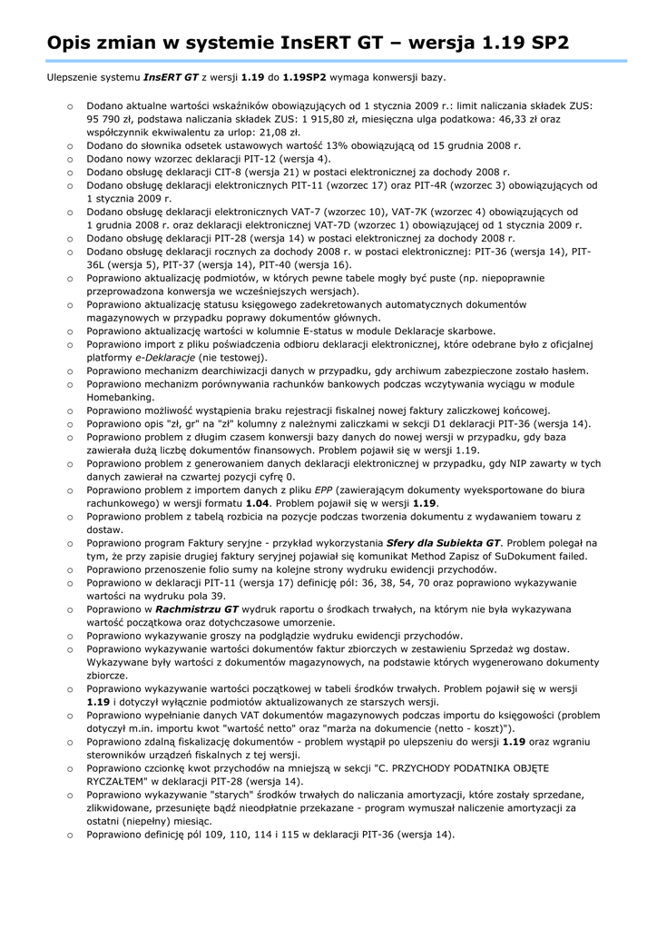 Opis zmian w systemie InsERT GT – wersja 1.19 SP2 Ulepszenie systemu InsERT GT z wersji 1.19 do 1.19SP2 wymaga konwersji bazy. o o o o o o o o o o o o o o o o o o o o o o o o o o o o o o o o Dodano aktualne wartości wskaźników obowiązujących od 1 stycznia 2009 r.: limit naliczania składek ZUS: 95 790 zł, podstawa naliczania składek ZUS: 1 915,80 zł, miesięczna ulga podatkowa: 46,33 zł oraz współczynnik ekwiwalentu za urlop: 21,08 zł. Dodano do słownika odsetek ustawowych wartość 13% obowiązującą od 15 grudnia 2008 r. Dodano nowy wzorzec deklaracji PIT-12 (wersja 4). Dodano obsługę deklaracji CIT-8 (wersja 21) w postaci elektronicznej za dochody 2008 r. Dodano obsługę deklaracji elektronicznych PIT-11 (wzorzec 17) oraz PIT-4R (wzorzec 3) obowiązujących od 1 stycznia 2009 r. Dodano obsługę deklaracji elektronicznych VAT-7 (wzorzec 10), VAT-7K (wzorzec 4) obowiązujących od 1 grudnia 2008 r. oraz deklaracji elektronicznej VAT-7D (wzorzec 1) obowiązującej od 1 stycznia 2009 r. Dodano obsługę deklaracji PIT-28 (wersja 14) w postaci elektronicznej za dochody 2008 r. Dodano obsługę deklaracji rocznych za dochody 2008 r. w postaci elektronicznej: PIT-36 (wersja 14), PIT36L (wersja 5), PIT-37 (wersja 14), PIT-40 (wersja 16). Poprawiono aktualizację podmiotów, w których pewne tabele mogły być puste (np. niepoprawnie przeprowadzona konwersja we wcześniejszych wersjach). Poprawiono aktualizację statusu księgowego zadekretowanych automatycznych dokumentów magazynowych w przypadku poprawy dokumentów głównych. Poprawiono aktualizację wartości w kolumnie E-status w module Deklaracje skarbowe. Poprawiono import z pliku poświadczenia odbioru deklaracji elektronicznej, które odebrane było z oficjalnej platformy e-Deklaracje (nie testowej). Poprawiono mechanizm dearchiwizacji danych w przypadku, gdy archiwum zabezpieczone zostało hasłem. Poprawiono mechanizm porównywania rachunków bankowych podczas wczytywania wyciągu w module Homebanking. Poprawiono moŜliwość wystąpienia braku rejestracji fiskalnej nowej faktury zaliczkowej końcowej. Poprawiono opis "zł, gr" na "zł" kolumny z naleŜnymi zaliczkami w sekcji D1 deklaracji PIT-36 (wersja 14). Poprawiono problem z długim czasem konwersji bazy danych do nowej wersji w przypadku, gdy baza zawierała duŜą liczbę dokumentów finansowych. Problem pojawił się w wersji 1.19. Poprawiono problem z generowaniem danych deklaracji elektronicznej w przypadku, gdy NIP zawarty w tych danych zawierał na czwartej pozycji cyfrę 0. Poprawiono problem z importem danych z pliku EPP (zawierającym dokumenty wyeksportowane do biura rachunkowego) w wersji formatu 1.04. Problem pojawił się w wersji 1.19. Poprawiono problem z tabelą rozbicia na pozycje podczas tworzenia dokumentu z wydawaniem towaru z dostaw. Poprawiono program Faktury seryjne - przykład wykorzystania Sfery dla Subiekta GT. Problem polegał na tym, Ŝe przy zapisie drugiej faktury seryjnej pojawiał się komunikat Method Zapisz of SuDokument failed. Poprawiono przenoszenie folio sumy na kolejne strony wydruku ewidencji przychodów. Poprawiono w deklaracji PIT-11 (wersja 17) definicję pól: 36, 38, 54, 70 oraz poprawiono wykazywanie wartości na wydruku pola 39. Poprawiono w Rachmistrzu GT wydruk raportu o środkach trwałych, na którym nie była wykazywana wartość początkowa oraz dotychczasowe umorzenie. Poprawiono wykazywanie groszy na podglądzie wydruku ewidencji przychodów. Poprawiono wykazywanie wartości dokumentów faktur zbiorczych w zestawieniu SprzedaŜ wg dostaw. Wykazywane były wartości z dokumentów magazynowych, na podstawie których wygenerowano dokumenty zbiorcze. Poprawiono wykazywanie wartości początkowej w tabeli środków trwałych. Problem pojawił się w wersji 1.19 i dotyczył wyłącznie podmiotów aktualizowanych ze starszych wersji. Poprawiono wypełnianie danych VAT dokumentów magazynowych podczas importu do księgowości (problem dotyczył m.in. importu kwot "wartość netto" oraz "marŜa na dokumencie (netto - koszt)"). Poprawiono zdalną fiskalizację dokumentów - problem wystąpił po ulepszeniu do wersji 1.19 oraz wgraniu sterowników urządzeń fiskalnych z tej wersji. Poprawiono czcionkę kwot przychodów na mniejszą w sekcji "C. PRZYCHODY PODATNIKA OBJĘTE RYCZAŁTEM" w deklaracji PIT-28 (wersja 14). Poprawiono wykazywanie "starych" środków trwałych do naliczania amortyzacji, które zostały sprzedane, zlikwidowane, przesunięte bądź nieodpłatnie przekazane - program wymuszał naliczenie amortyzacji za ostatni (niepełny) miesiąc. Poprawiono definicję pól 109, 110, 114 i 115 w deklaracji PIT-36 (wersja 14).