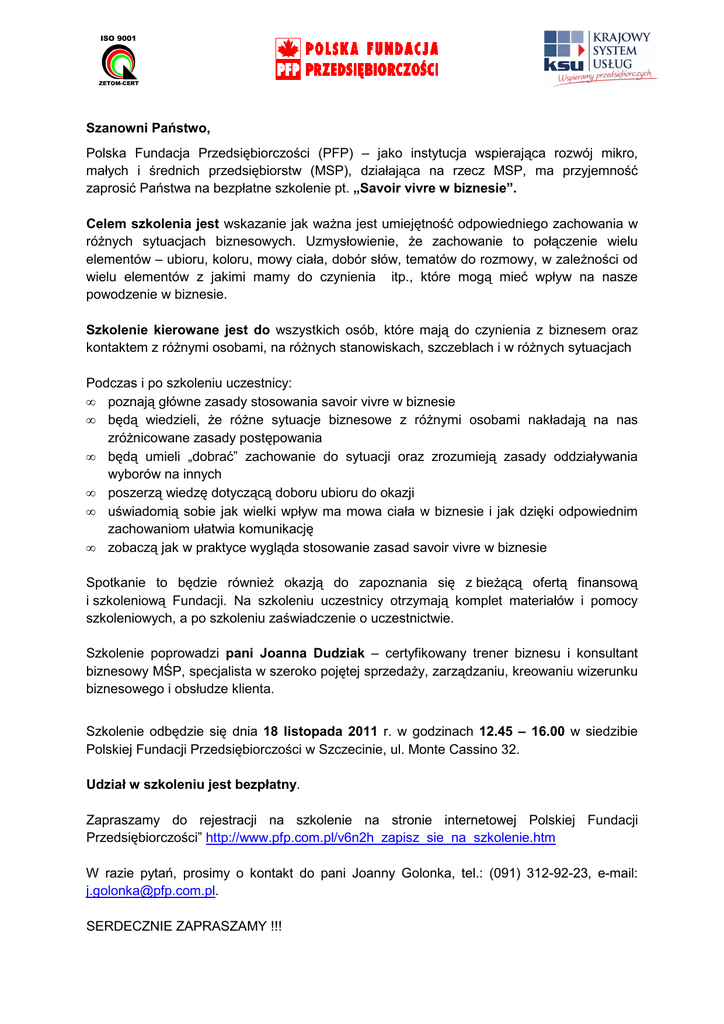 ISO 9001 ZETOM-CERT Szanowni Państwo, Polska Fundacja Przedsiębiorczości (PFP) – jako instytucja wspierająca rozwój mikro, małych i średnich przedsiębiorstw (MSP), działająca na rzecz MSP, ma przyjemność zaprosić Państwa na bezpłatne szkolenie pt. „Savoir vivre w biznesie”. Celem szkolenia jest wskazanie jak waŜna jest umiejętność odpowiedniego zachowania w róŜnych sytuacjach biznesowych. Uzmysłowienie, Ŝe zachowanie to połączenie wielu elementów – ubioru, koloru, mowy ciała, dobór słów, tematów do rozmowy, w zaleŜności od wielu elementów z jakimi mamy do czynienia itp., które mogą mieć wpływ na nasze powodzenie w biznesie. Szkolenie kierowane jest do wszystkich osób, które mają do czynienia z biznesem oraz kontaktem z róŜnymi osobami, na róŜnych stanowiskach, szczeblach i w róŜnych sytuacjach Podczas i po szkoleniu uczestnicy: • poznają główne zasady stosowania savoir vivre w biznesie • będą wiedzieli, Ŝe róŜne sytuacje biznesowe z róŜnymi osobami nakładają na nas zróŜnicowane zasady postępowania • będą umieli „dobrać” zachowanie do sytuacji oraz zrozumieją zasady oddziaływania wyborów na innych • poszerzą wiedzę dotyczącą doboru ubioru do okazji • uświadomią sobie jak wielki wpływ ma mowa ciała w biznesie i jak dzięki odpowiednim zachowaniom ułatwia komunikację • zobaczą jak w praktyce wygląda stosowanie zasad savoir vivre w biznesie Spotkanie to będzie równieŜ okazją do zapoznania się z bieŜącą ofertą finansową i szkoleniową Fundacji. Na szkoleniu uczestnicy otrzymają komplet materiałów i pomocy szkoleniowych, a po szkoleniu zaświadczenie o uczestnictwie. Szkolenie poprowadzi pani Joanna Dudziak – certyfikowany trener biznesu i konsultant biznesowy MŚP, specjalista w szeroko pojętej sprzedaŜy, zarządzaniu, kreowaniu wizerunku biznesowego i obsłudze klienta. Szkolenie odbędzie się dnia 18 listopada 2011 r. w godzinach 12.45 – 16.00 w siedzibie Polskiej Fundacji Przedsiębiorczości w Szczecinie, ul. Monte Cassino 32. Udział w szkoleniu jest bezpłatny. Zapraszamy do rejestracji na szkolenie na stronie internetowej Polskiej Fundacji Przedsiębiorczości” http://www.pfp.com.pl/v6n2h_zapisz_sie_na_szkolenie.htm W razie pytań, prosimy o kontakt do pani Joanny Golonka, tel.: (091) 312-92-23, e-mail: [email protected]. SERDECZNIE ZAPRASZAMY !!! ISO 9001 ZETOM-CERT Program szkolenia „Savoir vivre w biznesie” Godzina 12.45 12.45 –14.15 Temat zajęć Powitanie uczestników i wprowadzenie I. Wstęp do savoir vivre w biznesie 1. Wyjaśnienie zagadnienia w nawiązaniu do biznesu Naświetlenie najwaŜniejszych elementów i podział na 2 działy: ciało i umysł Omówienie róŜnych sytuacji biznesowych, w których naleŜy zwracać uwagę na SV Podział zachowań SV w zaleŜności od płci, wieku, stanowiska, kultury, branŜy itp. II. Ciało (nawiązanie do wypracowanych elementów w pkt. I) 1. Ubiór 2. Mowa ciała 14.15 –14.30 Przerwa III. 1. 2. 3. 4. 14.30 –16.00 IV. 16.00 Umysł (nawiązanie do wypracowanych elementów w pkt. I) Przygotowanie mentalne Kiedy mówić Jak mówić Co mówić Ćwiczenia z uŜyciem zdjęć i filmików Zakończenie szkolenia