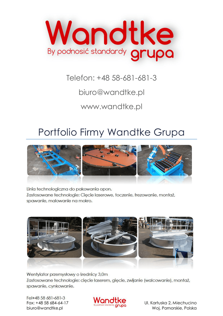 Telefon: +48 58-681-681-3 [email protected] www.wandtke.pl Portfolio Firmy Wandtke Grupa Linia technologiczna do pakowania opon. Zastosowane technologie: Cięcie laserowe, toczenie, frezowanie, montaż, spawanie, malowanie na mokro. Wentylator przemysłowy o średnicy 3,0m Zastosowane technologie: cięcie laserem, gięcie, zwijanie (walcowanie), montaż, spawanie, cynkowanie. Fel+48 58 681-681-3 Fax: +48 58 684-64-17 [email protected] Ul. Kartuska 2, Miechucino Woj. Pomorskie, Polska Pierścienie stosowane w przemyśle okrętowym. Zastosowane technologie: zwijanie płaskownika, toczenie, wiercenie, gwintowanie. Konstrukcja wsporcza. Zastosowane technologie: cięcie laserowe, cięcie wodą, toczenie, spawanie, wiercenie, wytaczanie, montaż, malowanie na mokro. Obejmy do instalacji rurowych. Zastosowane technologie: - cięcie laserowe - cięcie na piłach taśmowych - gięcie na prasach mimośrodowych - montaż - spawanie - cynkowanie Fel+48 58 681-681-3 Fax: +48 58 684-64-17 [email protected] Ul. Kartuska 2, Miechucino Woj. Pomorskie, Polska Konstrukcja dachowa hali. Zastosowane technologie: cięcie laserowe, cięcie na piłach taśmowych, montaż, spawanie, wiercenie, cynkowanie, malowanie na mokro. Właz okrętowy specjalnego przeznaczenia. Zastosowane technologie: Cięcie laserowe, zwijanie blach, montaż, spawanie, śrutowanie, malowanie na mokro. Elementy wytworzone poprzez cięcie laserowe. Fel+48 58 681-681-3 Fax: +48 58 684-64-17 [email protected] Ul. Kartuska 2, Miechucino Woj. Pomorskie, Polska Elementy wytworzone poprzez cięcie laserem, gięcie oraz malowanie proszkowe. Wentylator przemysłowy. Zastosowane technologie: Cięcie laserowe, zwijanie blach, gięcie blach, montaż, spawanie, nitowanie, śrutowanie, malowanie proszkowe. Konstrukcje stalowe, spawane oraz malowane na mokro. Fel+48 58 681-681-3 Fax: +48 58 684-64-17 [email protected] Ul. Kartuska 2, Miechucino Woj. Pomorskie, Polska