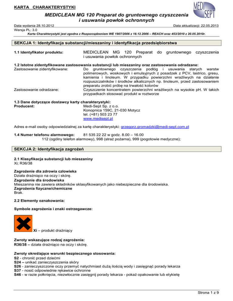KARTA CHARAKTERYSTYKI MEDICLEAN MG 120 Preparat do gruntownego czyszczenia i usuwania powłok ochronnych Data wydania 28.10.2012 Wersja PL: 3.0 Data aktualizacji: 22.05.2013 Karta Charakterystyki jest zgodna z Rozporządzeniem WE 1907/2006 z 18.12.2006 – REACH oraz 453/2010 z 20.05.2010r. SEKCJA 1: Identyfikacja substancji/mieszaniny i identyfikacja przedsiębiorstwa 1.1 Identyfikator produktu: MEDICLEAN MG 120 Preparat i usuwania powłok ochronnych do gruntownego czyszczenia 1.2 Istotne zidentyfikowane zastosowania substancji lub mieszaniny oraz zastosowania odradzane: Zastosowanie zidentyfikowane: Do gruntownego czyszczenia podłóg i usuwania starych warstw polimerowych, woskowych i emulsyjnych z posadzek z PCV, lastrico, gresu, kamienia i linoleum. W przypadku powierzchni wrażliwych na działanie rozpuszczalników i środków alkalicznych np. linoleum, przed zastosowaniem preparatu zrobić próbę na trwałość kolorów Zastosowanie odradzane: Czyszczenie koncentratem powierzchni wrażliwych na wysokie pH. W takich przypadkach stosować produkt w roztworze 1.3 Dane dotyczące dostawcy karty charakterystyki: Producent: Medi-Sept Sp. z o.o. Konopnica 159C, 21-030 Motycz tel. (+81) 503 23 77 www.medisept.pl Adres e-mail osoby odpowiedzialnej za kartę charakterystyki: [email protected] 1.4 Numer telefonu alarmowego: 81 535 22 22 w godz. 8.00 – 16.00 112 (ogólny telefon alarmowy), 998 (straż pożarna), 999 (pogotowie medyczne); SEKCJA 2: Identyfikacja zagrożeń 2.1 Klasyfikacja substancji lub mieszaniny Xi; R36/38 Zagrożenie dla zdrowia człowieka Działa drażniąco na oczy i skórę. Zagrożenie dla środowiska Mieszanina nie zawiera składników sklasyfikowanych jako niebezpieczne dla środowiska. Zagrożenia fizyczne/chemiczne Brak. 2.2 Elementy oznakowania: Symbole zagrożenia i znaki ostrzegawcze: Xi – produkt drażniący Zwroty wskazujące rodzaj zagrożenia: R36/38 – działa drażniąco na oczy i skórę. Zwroty określające warunki bezpiecznego stosowania: S2 - chronić przed dziećmi S24 – unikać zanieczyszczenia skóry S26 - zanieczyszczone oczy przemyć natychmiast dużą ilością wody i zasięgnąć porady lekarza S37 - nosić odpowiednie rękawice ochronne S46 - w razie połknięcia, niezwłocznie zasięgnij porady lekarza - pokaż opakowanie lub etykietę Strona 1 z 9 KARTA CHARAKTERYSTYKI MEDICLEAN MG 120 Preparat do gruntownego czyszczenia i usuwania powłok ochronnych Data wydania 28.10.2012 Wersja PL: 3.0 Data aktualizacji: 22.05.2013 Karta Charakterystyki jest zgodna z Rozporządzeniem WE 1907/2006 z 18.12.2006 – REACH oraz 453/2010 z 20.05.2010r. Zgodnie z Rozp. 648/2004 <5% niejonowych środków powierzchniowo czynnych <5% EDTA Na4 Środki powierzchniowo czynne spełniają wymogi biodegradacji zgodne z Rozp. 648/2004. Arkusz danych składników dostępny na stronie: www.medisept.pl 2.3 Inne zagrożenia: Brak dodatkowych zagrożeń Brak informacji na temat spełnienia kryteriów PBT lub vPvB zgodnie z załącznikiem XIII rozporządzenia REACH. Odpowiednie badania nie były przeprowadzone. SEKCJA 3: Skład/informacja o składnikach 3.1 Substancja: Nie dotyczy. 3.2 Mieszanina: Niebezpieczne składniki: Identyfikator produktu Zawartość % Eter monobutylowy glikolu di etylenowego CAS: 112-34-5 WE: 203-961-6 Nr indeksowy: 603-096-00-8 Nr REACH: 01-2119475104-44XXXX 5 - 15 Metakrzemian disodu CAS: 10213-79-3 WE: 229-912-9 Nr indeksowy: Nr REACH: 01-2119449811-37XXXX 2-3 Mieszanina oksyetylenowanych alkoholi tłuszczowych CAS: 68439-45-2 WE: Nr indeksowy: Nr REACH: substancja podlega przepisom okresu przejściowego 2 - 2,5 Wodorotlenek sodu CAS: 1310-73-2 WE: 215-185-5 Nr indeksowy: 011-002-00-6 Nr REACH: 01-2119457892-27XXXX <1,5 Klasyfikacja wg 67/548/EWG Xi; R36 C; R34 Klasyfikacja CLP Kody zwrotów Klasa zagrożenia i wskazujących kody kategorii rodzaj zagrożenia Eye Irrit.2 H319 Skin Corr. 1B STOT SE 3 H314 H335 Eye Dam.1 H318 Skin Corr. 1A H314 Xi; R37 Xi; R41 C; R35 Strona 2 z 9 KARTA CHARAKTERYSTYKI MEDICLEAN MG 120 Preparat do gruntownego czyszczenia i usuwania powłok ochronnych Data wydania 28.10.2012 Wersja PL: 3.0 Data aktualizacji: 22.05.2013 Karta Charakterystyki jest zgodna z Rozporządzeniem WE 1907/2006 z 18.12.2006 – REACH oraz 453/2010 z 20.05.2010r. Sól czterosodowa kwasu etylenodiaminotetraoctowego CAS: 64-02-8 WE: 200-573-9 Nr indeksowy: 607-428-00-2 Nr REACH: substancja podlega przepisom okresu przejściowego Pełna treść zwrotów R i H w sekcji 16 0,5 - 0,9 Xn; R22 Acute Tox. 4 Eye Dam.1 H302 H318 Xi; R41 SEKCJA 4: Środki pierwszej pomocy 4.1 Opis środków pierwszej pomocy W przypadku kontaktu ze skórą: Należy zdjąć zanieczyszczone ubranie, umyć zabrudzoną skórę wodą z mydłem, spłukać dokładnie wodą, w przypadku pojawienia się podrażnienia, rumieni skontaktować się z lekarzem. W przypadku kontaktu z oczami: Przepłukać oczy przez kilkanaście minut (ok. 15) dużą ilością wody, trzymając powieki szeroko rozwarte. Unikać silnego strumienia, ze względu na niebezpieczeństwo uszkodzenia rogówki, skontaktować się z lekarzem. Narażenie inhalacyjne: W razie zawrotów głowy lub nudności wyprowadzić poszkodowanego na świeże powietrze, w razie braku szybkiej poprawy zasięgnąć porady lekarza. W przypadku połknięcia: Nie wywoływać wymiotów, przepłukać jamę ustną. Natychmiast zasięgnąć porady lekarza 4.2 Najważniejsze ostre i opóźnione objawy oraz skutki narażenia: Układ oddechowy. Wdychanie stężonych par produktu powoduje podrażnienia błon śluzowych nosa, gardła . Przewód pokarmowy. Może spowodować podrażnienie błon śluzowych przewodu pokarmowego, bóle brzucha. Kontakt z oczami: Powoduje podrażnienia. Kontakt ze skórą: Powoduje podrażnienia. 4.3 Wskazania dotyczące wszelkiej natychmiastowej pomocy lekarskiej i szczególnego postępowania z poszkodowanym: Decyzję o sposobie postępowania podejmuje lekarz po ocenie stanu poszkodowanego. SEKCJA 5: Postępowanie