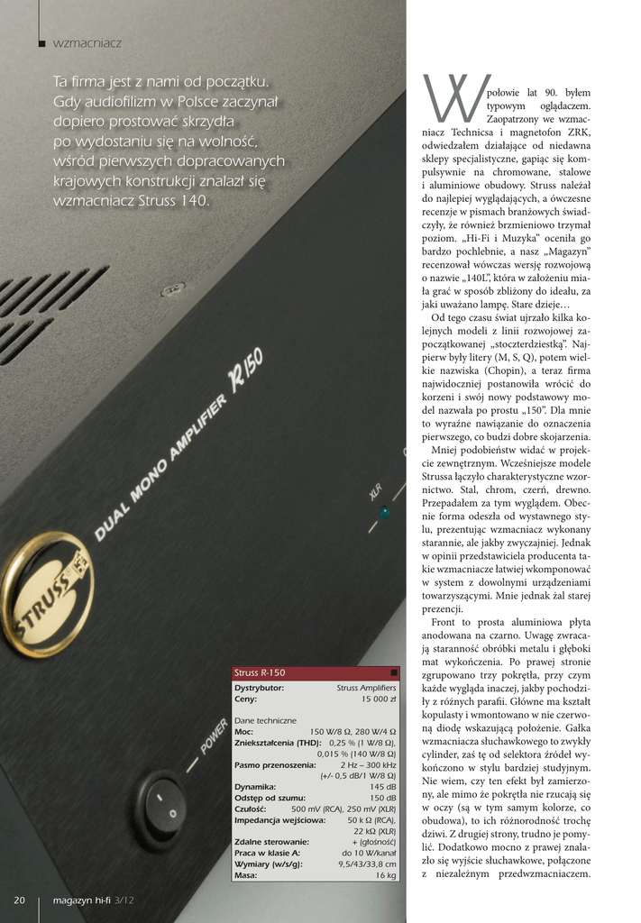 X[NBDOJBD[ 8 5BµSNBKFTU[OBNJPEQPD[hULV (EZBVEJPµMJ[NX1PMTDF[BD[ZOB EPQJFSPQSPTUPXBmTLS[ZEB QPXZEPTUBOJVTJOBXPMOP½m X½SwEQJFSXT[ZDIEPQSBDPXBOZDI LSBKPXZDILPOTUSVLDKJ[OBMB[TJ X[NBDOJBD[4USVTT 4USVTT3 %ZTUSZCVUPS $FOZ 4USVTT"NQMJGJFST [ %BOFUFDIOJD[OF .PD 8 8 ;OJFLT[UBDFOJB5)% 8 8 1BTNPQS[FOPT[FOJB )[¨L)[ E#8 %ZOBNJLB E# 0ETUQPET[VNV E# $[VP½m N73$" N79-3 *NQFEBODKBXFK½DJPXB L 3$" L 9-3 ;EBMOFTUFSPXBOJF HP½OP½m 1SBDBXLMBTJF" EP8LBOB 8ZNJBSZXTH DN .BTB LH NBHB[ZOIJGJ połowie lat 90. byłem typowym oglądaczem. Zaopatrzony we wzmacniacz Technicsa i magnetofon ZRK, odwiedzałem działające od niedawna sklepy specjalistyczne, gapiąc się kompulsywnie na chromowane, stalowe i aluminiowe obudowy. Struss należał do najlepiej wyglądających, a ówczesne recenzje w pismach branżowych świadczyły, że również brzmieniowo trzymał poziom. „Hi-Fi i Muzyka” oceniła go bardzo pochlebnie, a nasz „Magazyn” recenzował wówczas wersję rozwojową o nazwie „140L”, która w założeniu miała grać w sposób zbliżony do ideału, za jaki uważano lampę. Stare dzieje… Od tego czasu świat ujrzało kilka kolejnych modeli z linii rozwojowej zapoczątkowanej „stoczterdziestką”. Najpierw były litery (M, S, Q), potem wielkie nazwiska (Chopin), a teraz firma najwidoczniej postanowiła wrócić do korzeni i swój nowy podstawowy model nazwała po prostu „150”. Dla mnie to wyraźne nawiązanie do oznaczenia pierwszego, co budzi dobre skojarzenia. Mniej podobieństw widać w projekcie zewnętrznym. Wcześniejsze modele Strussa łączyło charakterystyczne wzornictwo. Stal, chrom, czerń, drewno. Przepadałem za tym wyglądem. Obecnie forma odeszła od wystawnego stylu, prezentując wzmacniacz wykonany starannie, ale jakby zwyczajniej. Jednak w opinii przedstawiciela producenta takie wzmacniacze łatwiej wkomponować w system z dowolnymi urządzeniami towarzyszącymi. Mnie jednak żal starej prezencji. Front to prosta aluminiowa płyta anodowana na czarno. Uwagę zwracają staranność obróbki metalu i głęboki mat wykończenia. Po prawej stronie zgrupowano trzy pokrętła, przy czym każde wygląda inaczej, jakby pochodziły z różnych parafii. Główne ma kształt kopulasty i wmontowano w nie czerwoną diodę wskazującą położenie. Gałka wzmacniacza słuchawkowego to zwykły cylinder, zaś tę od selektora źródeł wykończono w stylu bardziej studyjnym. Nie wiem, czy ten efekt był zamierzony, ale mimo że pokrętła nie rzucają się w oczy (są w tym samym kolorze, co obudowa), to ich różnorodność trochę dziwi. Z drugiej strony, trudno je pomylić. Dodatkowo mocno z prawej znalazło się wyjście słuchawkowe, połączone z niezależnym przedwzmacniaczem. Struss 3 X[NBDOJBD[ ■"MFL3BDIXBMEJ"MFLTBOESB$IJMJTLB■ Rząd diod wskazuje aktywne wejścia, zaś po lewej stronie ulokowano logo Strussa; to samo od lat (i dobrze). Tu jednak zastrzeżenie. We wcześniejszych modelach plakietka bywała raczej solidna. Tę wykonano z samoprzylepnego miękkiego tworzywa i mimo że wygląda ładnie, uważam, że przy tej cenie powinna być zrobiona z czegoś bardziej konkretnego. Z tyłu solidnie i elegancko. Pamiętam, jakimi zaciskami głośnikowymi świeciła stara „stoczterdziestka”. Te również są porządne, choć może nie z pierwszej ligi światowej. Do tego rząd standardowych gniazd RCA (4 wejścia) oraz coś extra: para RCA wyraźnie wyższej jakości, oznaczona jako „CD” oraz para XLR-ów Neutrika. Wzmacniacz jest zdalnie sterowany. Łatwy w obsłudze pilot obsługuje tylko siłę głosu. Budowa wewnętrzna przypomina, że Strussy zawsze były dual mono. Przez 20 lat nic się nie zmieniło i znów mogę oglądać dwa duże toroidy, tym razem ekranowane i ozdobione logo firmy. Postęp. Układ wzmacniający zmieścił się na jednej płytce drukowanej. Konstrukcja jest czysta i elegancka. Uniknięto plątaniny przewodów spotykanej w urządzeniach mniejszych manufaktur. Struss ma ten etap za sobą: wzmacniacze powstają w specjalistycznej fabryce elektronicznej w Łodzi. Układ wejściowy pozbawiono stopnia przedwzmacniacza. Sygnał od razu za gniazdami jest rozdzielany pomiędzy potencjometr Alpsa i wzmacniacz słuchawkowy na tranzystorach J-FET, niezależny od reszty toru i wyposażony we własny zasilacz stabilizowany. Połączenia poprowadzono okablowaniem Gotham. Układ wejściowy stopnia mocy zrealizowano na J-FET-ach, a stopień końcowy to dwa HexFET-y na kanał. Urządzenie wyposażono w układ mający zapobiegać efektowi pamięci (przypomina to ideę Lavardina, choć prawdopodobnie zostało zrealizowane inaczej). Ścieżka sygnałowa nie zawiera kondensatorów. Liczne pojemności widoczne na płytce należą do różnych stopni zasilacza. Alek Rachwald 0QJOJB 4ZTUFN 8[NBDOJBD[4PVOE"SU+B[[ ,PMVNOZ"WDPO"3. (SBNPGPO5SBOTSPUPS;&5 SBNJ4.& XLBELB"JS5JHIU1$4VQSFNF 1S[FEX[NBDOJBD[LPSFLDZKOZ 3$.4FOTPS1SFMVEF 0EUXBS[BD[$%5FOU-BCTC%"$ -JOO,BSJL* ,BCFMDZGSPXZ4UFSFPWPY)%97 ÓhD[wXLB;V8ZMJF3$" 1S[FXPEZHP½OJLPXF4USVTT ,BCMF[BTJMBKhDF7PWPY*OJUJP 'JMUSTJFDJPXZ&OFSS / owy Struss potrzebuje trochę bardziej wnikliwego wsłuchania się na początek. To nie jest wzmacniacz, który po prostu włącza się do sieci i zaraz jazda bez trzymanki. Pierwsze wrażenie było nieskomplikowane: „Struss!”. Dlaczego tak? Otóż ładnych kilka lat temu wybierałem amplifikację do mojego systemu. Wśród przesłuchanych urządzeń znalazł się Struss S, ówczesny flagowiec, na który zresztą nie było mnie stać. R-150 brzmi trochę podobnie; jest między nimi pewien rodzinny rys. Oba grały przejrzyście, szybko, z dużą ilością detali. Pomyślałem, zapewne słusznie, że projektant ma sprecyzowany pogląd na brzmienie i że mam oto do czynienia z firmowym dźwiękiem Strussa. Gdybym poprzestał na tej konstatacji, nie byłoby ogólnie źle. Przejrzysty wzmacniacz, firmowy dźwięk, trochę chłodno. W końcu to mógłby być również Mark Levinson. Ale jako że pr